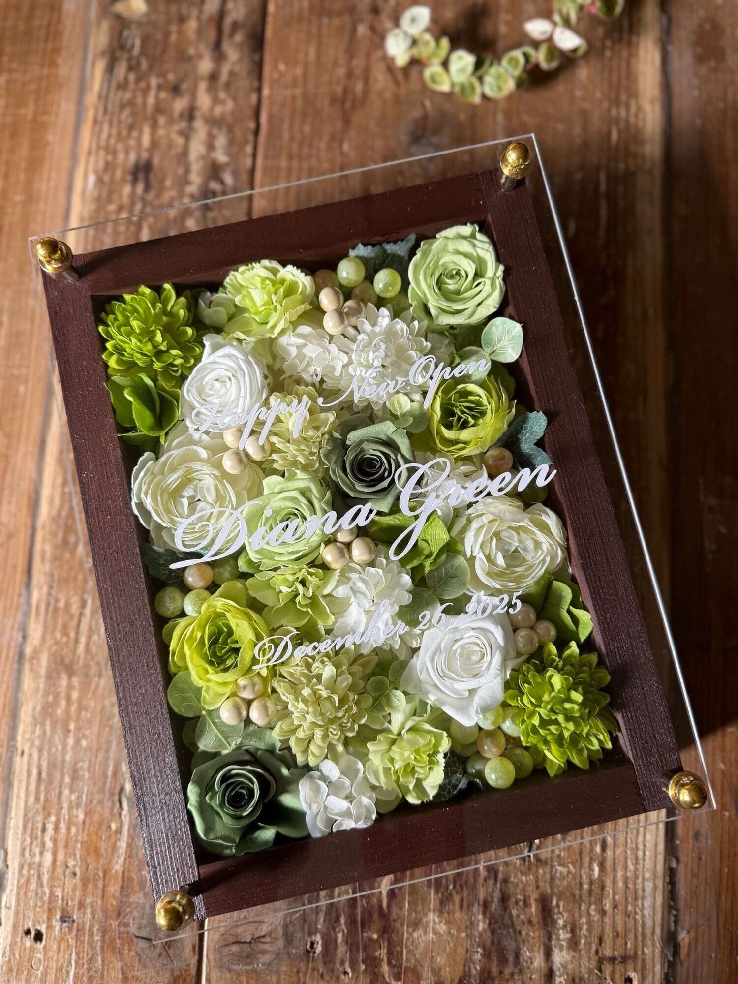 開店祝い・サロンオープン祝い・開院祝い・退職祝い【名入れ】プリザーブドフラワーアレンジ ウッドフレーム 白木枠〈白グリーン〉