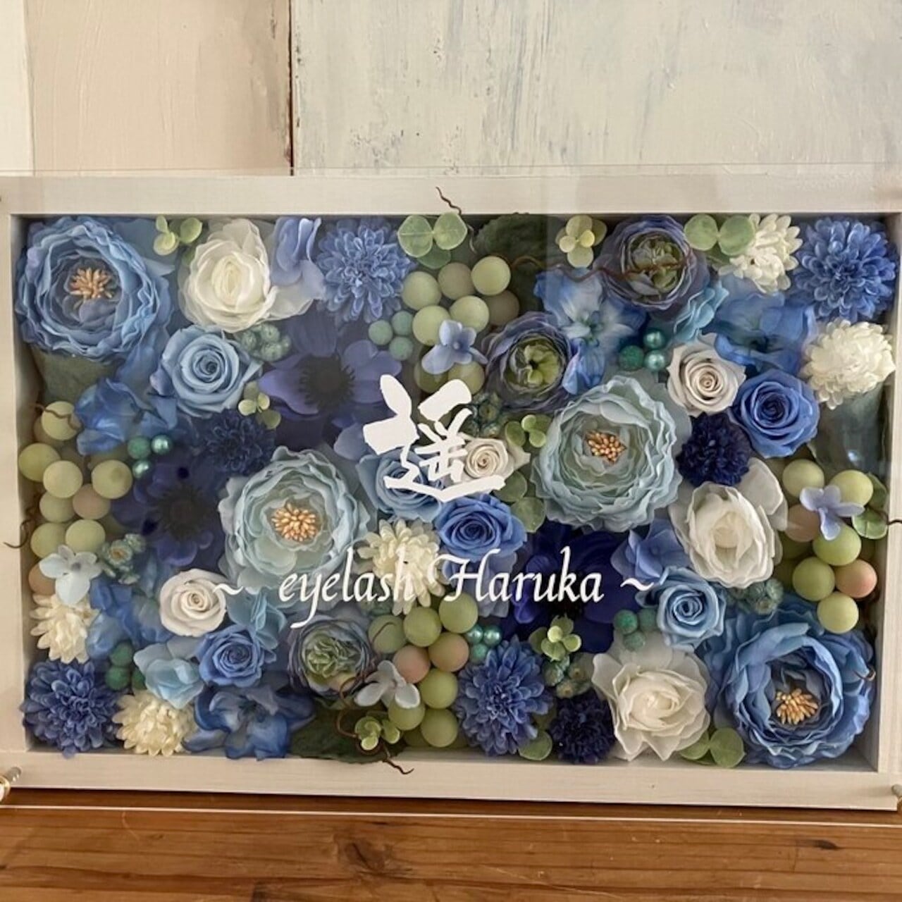 開店・結婚祝い・ウェルカムボードに 白グリーンの爽やかな名入れお花フレーム 大切な方への贈り物に プリザーブドフラワーを使用したオリジナルギフト ウッドフレームにプリザーブドフラワーと造花をぎっしり詰め込み、アクリル板にはカッティングシートでメッセージをお入れします。 ★白文字入れ無料‼︎ (ゴールド文字はプラス¥500) 開店祝い サロンオープン祝い クリニックオープン祝い 開院祝い 周年祝い 記念品 退職祝い 結婚祝い 結婚記念日 結婚式のウェルカムボード 様々なシーンでご利用いただけます。 プリザーブドフラワーは特殊な加工により生花と同じような美しさを保ちながらも枯れることなく長期間(数年)保つことができる『保存された花』の事です。 造花に関しても生花をリアルに再現しつつ生花にはない美しさや表現を追求した高品質なアーティシャルフラワーを主に使用しています。 お手入れの必要もなく常に美しい姿を保ってくれるので心温まる思い出のお品として喜ばれること間違いありません。 【アクリル板文字入れ】 ご希望のメッセージをコメント下さい アルファベット・数字 漢字・ひらがな・カタカナなどで (日本語の場合は縦書きか横書きかをご指定下さい) 書体・レイアウトなどは基本お任せになりますが 希望があればコメントください。 (必要であれば前もって校正を作成します) ▲文字数に限界がありますのでご了承下さい。 【サイズ】 木枠 30×45㎝ 厚み 約8㎝ ♠︎縦置きか横置きをお選び下さい。 どちらも自立しますが横置きの方が安定します。 縦置きの場合は壁などに立て掛ける事を おすすめします。 【お急ぎで必要な方】 対応可能の場合もございますので 一度ご連絡ください *花材は仕入れの関係で多少変更する 場合がありますのでご了承下さい。 色目など大幅に変わる事はありません のでご安心下さい。 ▲ご購入いただいたお品の画像をその後商品サンプルとして他のサイト・SNS等で記載する場合がありますのでご了承ください。 その際に文字入れしている名前・店名・会社名など問題がある場合はご面倒ではありますが前もってお知らせください。 どうぞよろしくお願いいたします。