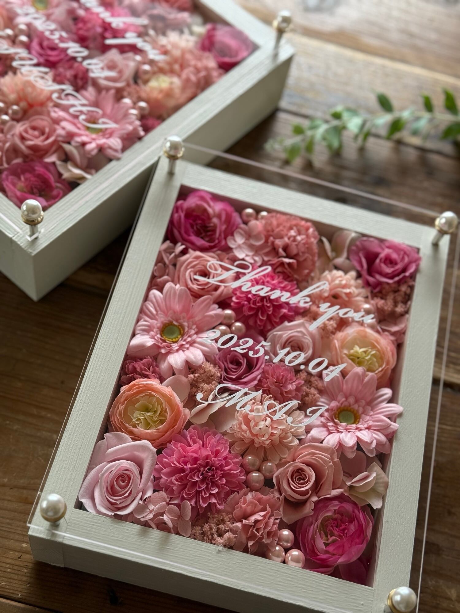 感謝の気持ちを込めて贈りたい 結婚式の両親にぴったりの贈呈品です ★新郎新婦用に2個セットのお値段になります 色の組み合わせは自由 ウッドフレームにプリザーブドフラワーと造花をぎっしり詰め込み、アクリル板にはカッティングシートでお名前、挙式日、生まれてから今日までの日数などをお入れします。 ★白文字入れ無料‼︎ (ゴールド文字はプラス¥500) プリザーブドフラワーアレンジメントの美しい花々が、お二人からの感謝の気持ちを伝えます。 プリザーブドフラワーは特殊な加工により生花と同じような美しさを保ちながらも枯れることなく長期間(数年)保つことができる『保存された花』の事です。 造花に関しても生花をリアルに再現しつつ生花にはない美しさや表現を追求した高品質なアーティシャルフラワーを主に使用しています。 お手入れの必要もなく常に美しい姿を保ってくれるので心温まる思い出のお品として喜ばれること間違いありません。 お二人の結婚式の思い出を長く刻んでくれることでしょう 結婚式の感動的な瞬間を忘れないでいて欲しいという願いを込めて 【ラッピング】 2個セットの場合無料で 透明ビニールとリボンでのラッピング付き 手提げ袋を2枚お付けします。 メッセージカードが必要な場合 お知らせ下さい。 【アクリル板文字入れ】 ご希望のメッセージをコメント下さい アルファベット・数字 漢字・ひらがな・カタカナなどで (日本語の場合は縦書きか横書きかをご指定下さい) 書体・レイアウトなどは基本お任せになりますが 希望があればコメントください。 (必要であれば前もって校正を作成します) ▲文字数に限界がありますのでご了承下さい。 【サイズ】 木枠 20×26㎝ 厚み 約8㎝ 【お急ぎで必要な方】 対応可能の場合もございますので一度ご連絡ください *花材は仕入れの関係で多少変更する 場合がありますのでご了承下さい。 色目など大幅に変わる事はありません のでご安心下さい。 ▲ご購入いただいたお品の画像を、その後商品サンプルとして 他のサイト・SNS等で記載する場合がありますのでご了承ください。 その際に文字入れしている名前・店名・会社名など問題がある場合はご面倒ではありますが 前もってお知らせください。 どうぞよろしくお願いいたします。