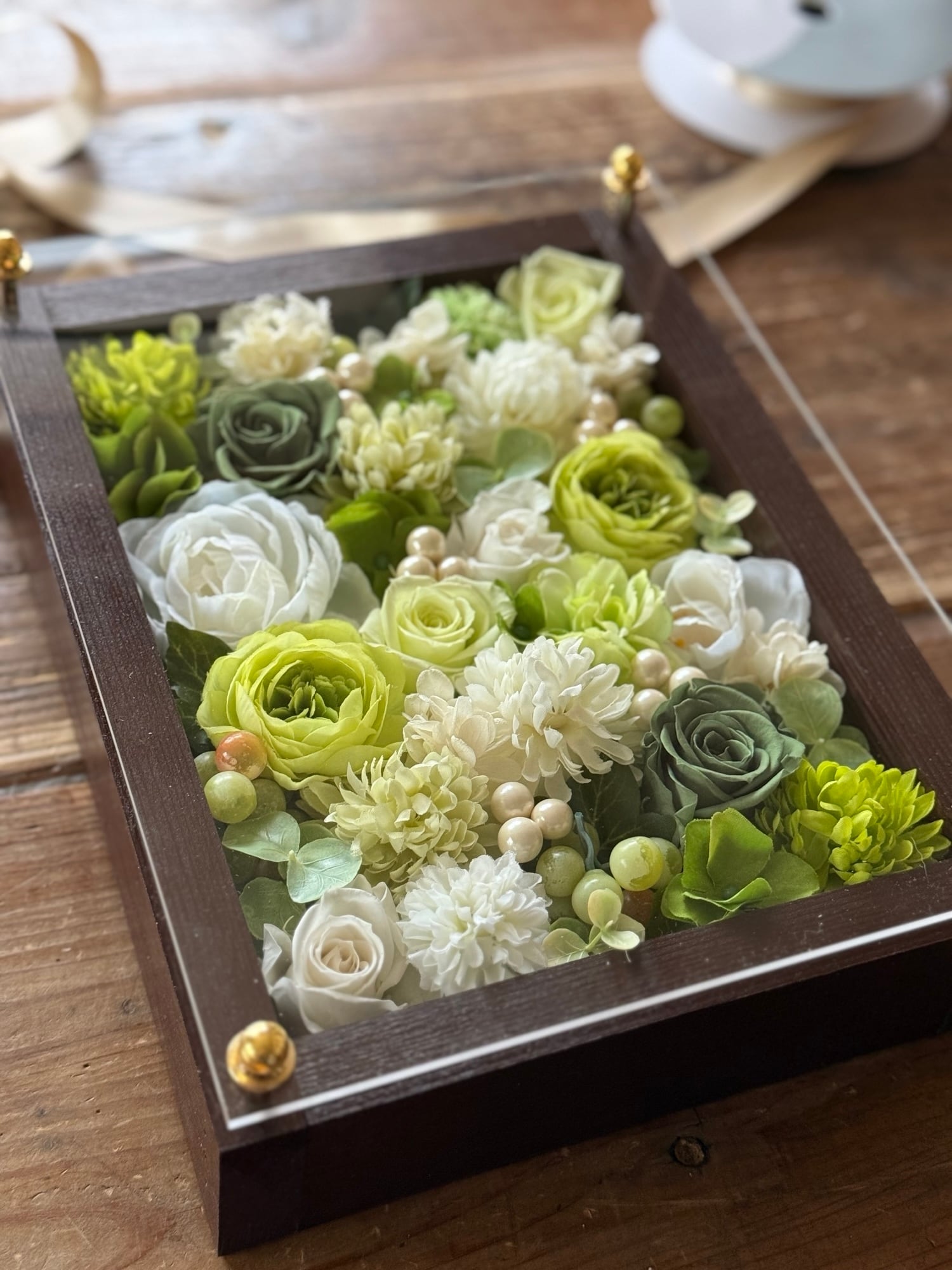 素敵な花々が咲き誇るプリザーブドフラワーアレンジメントは、