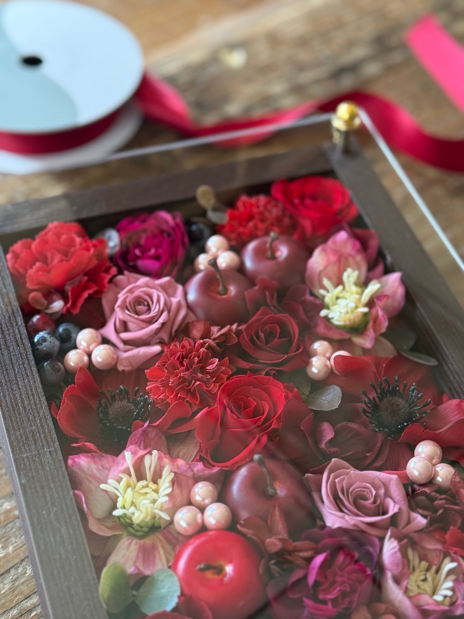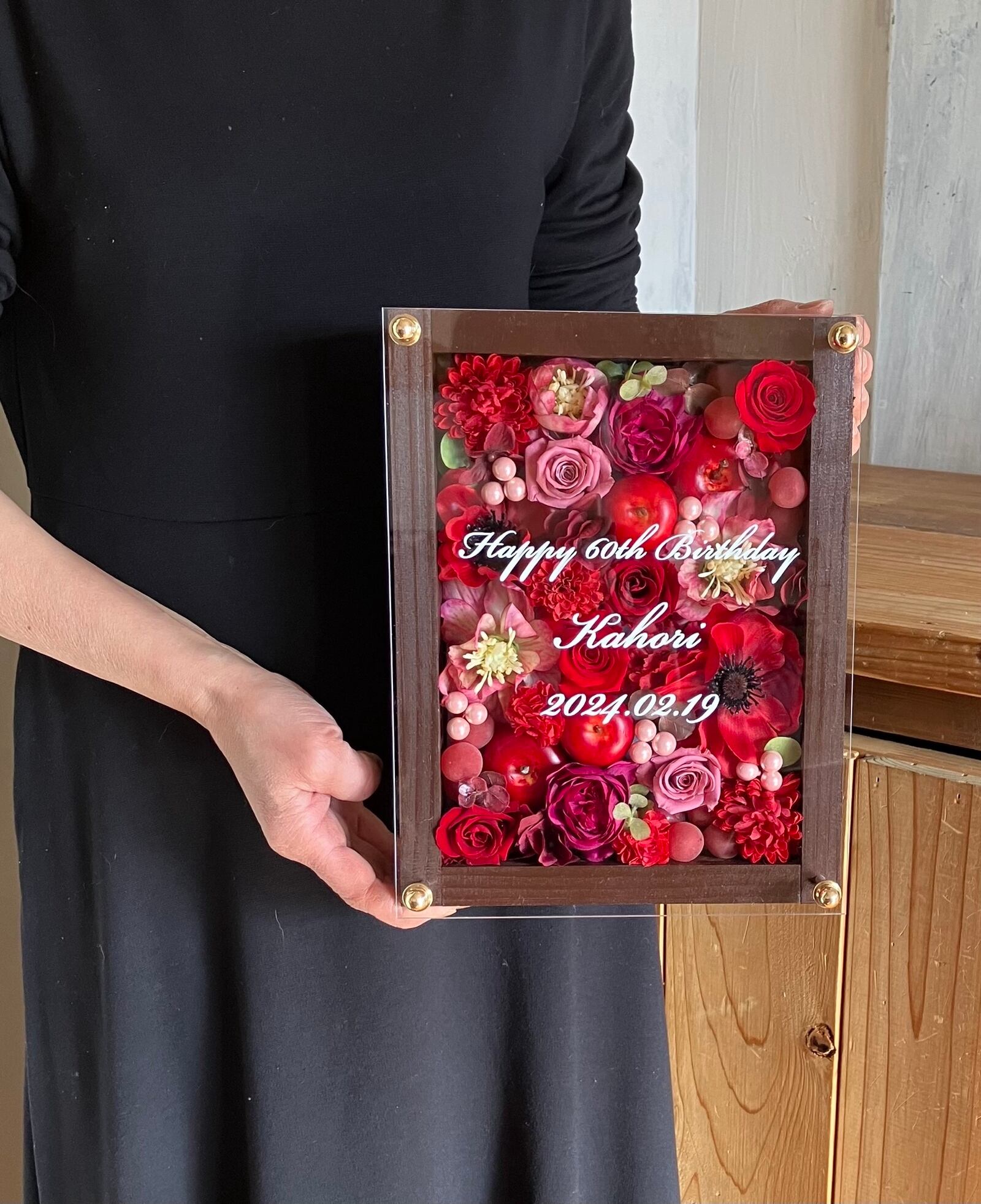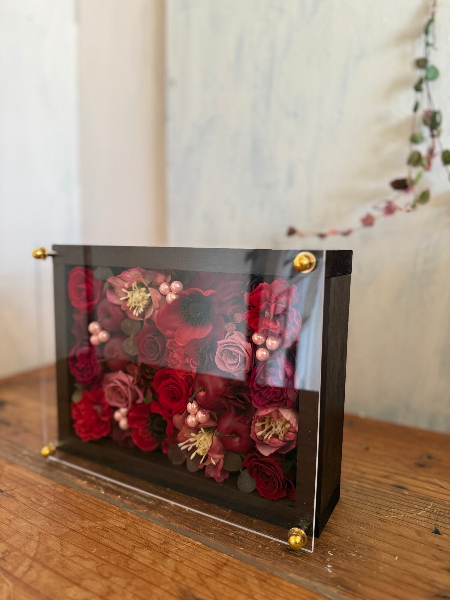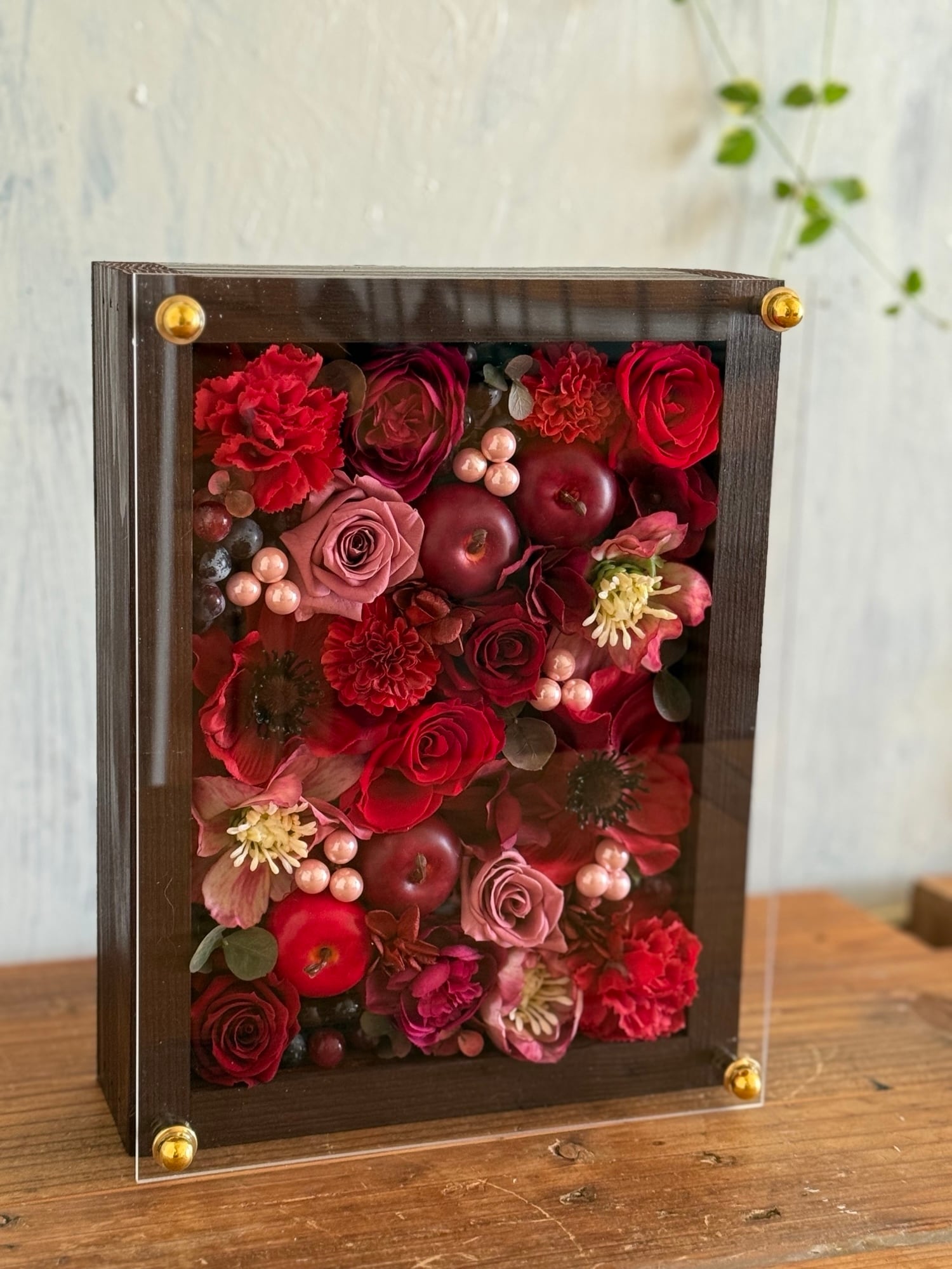 茶色のウッドフレームにプリザーブドフラワーと造花を詰め込んだアレンジメントです。