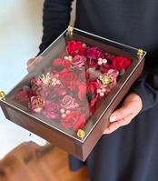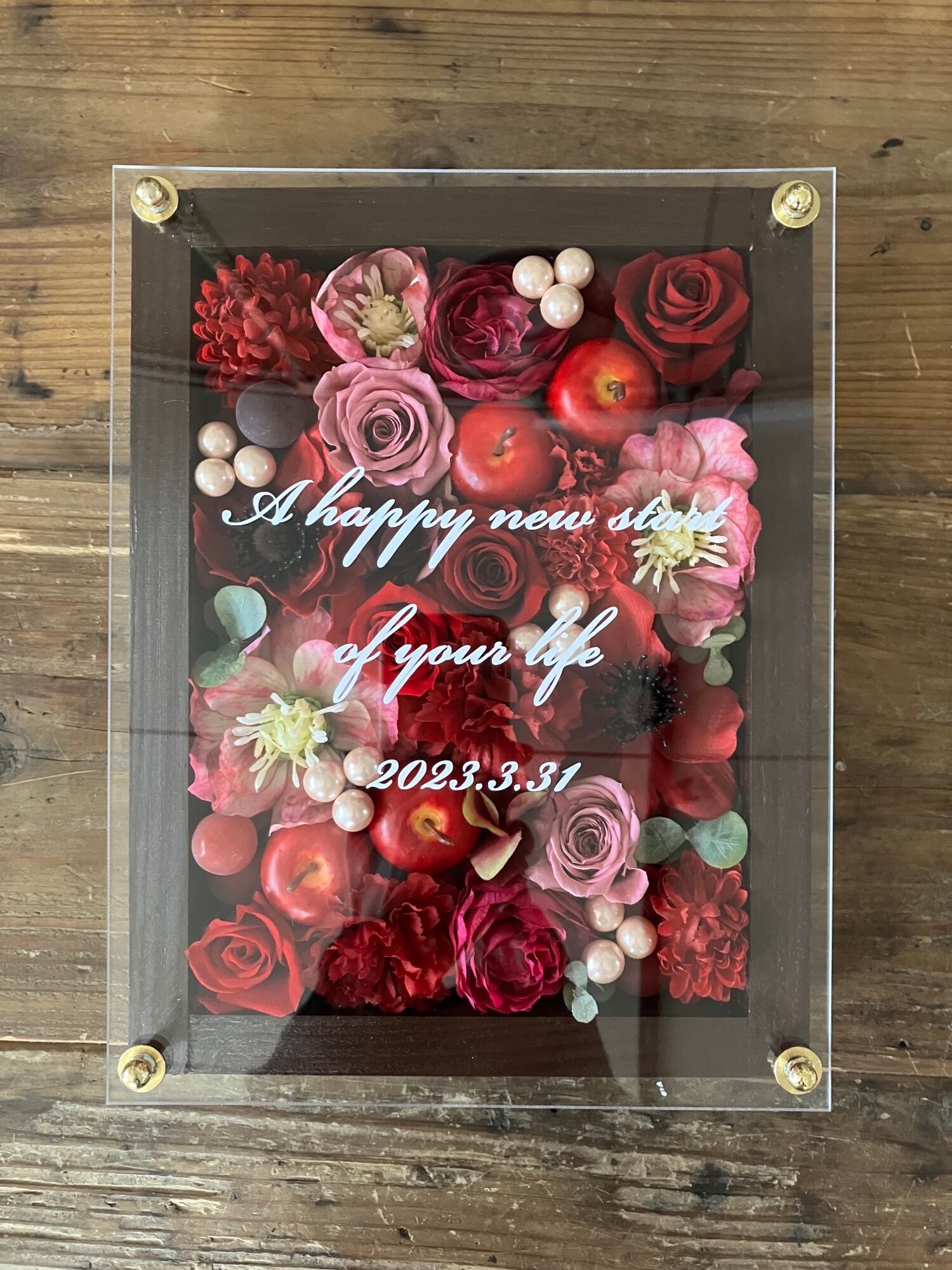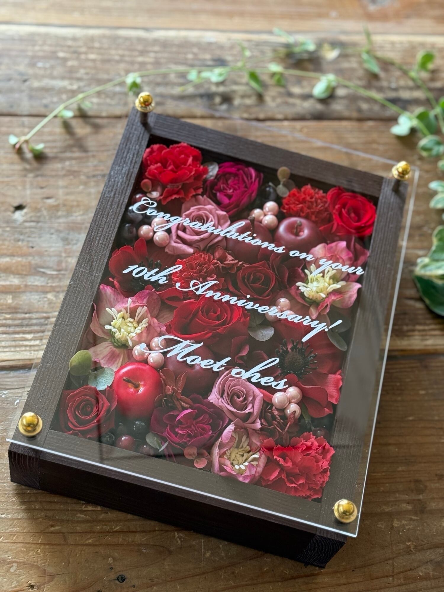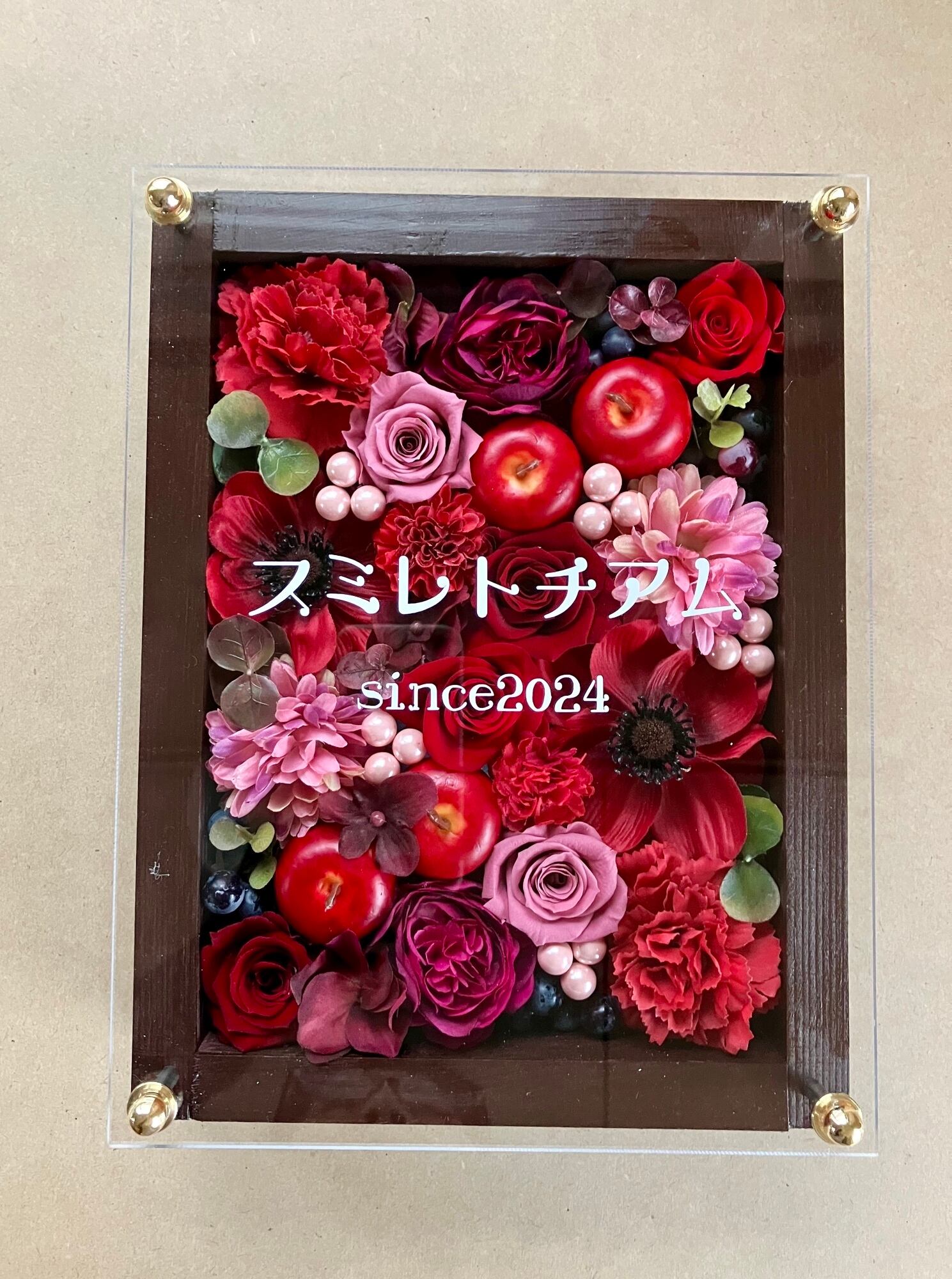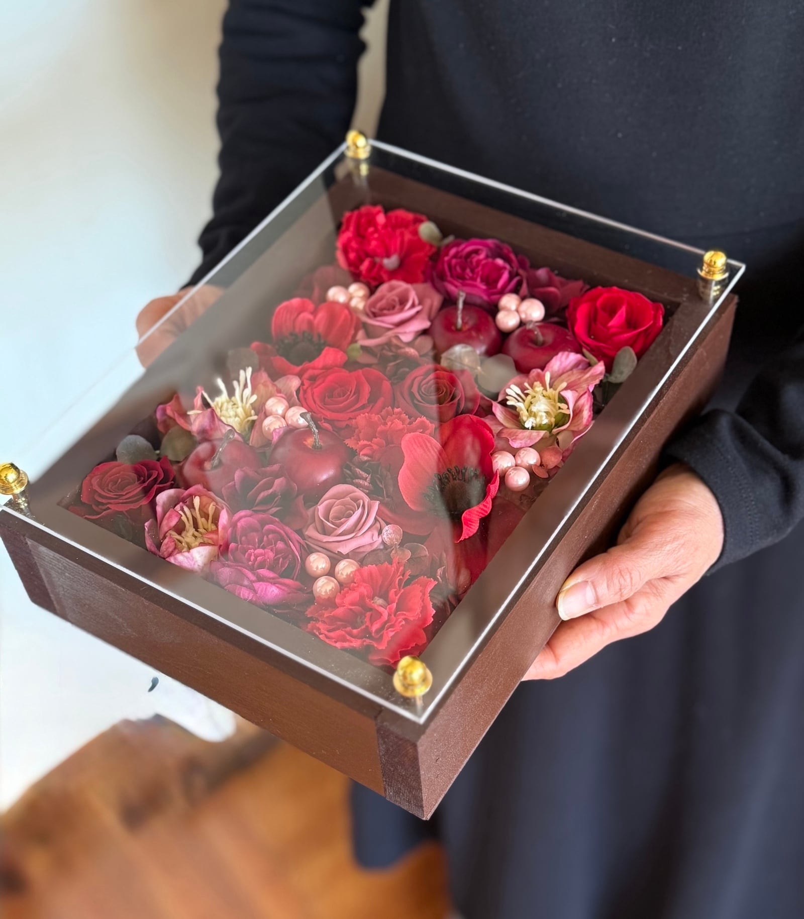 茶色のウッドフレームにプリザーブドフラワーと造花を詰め込んだアレンジメントです。