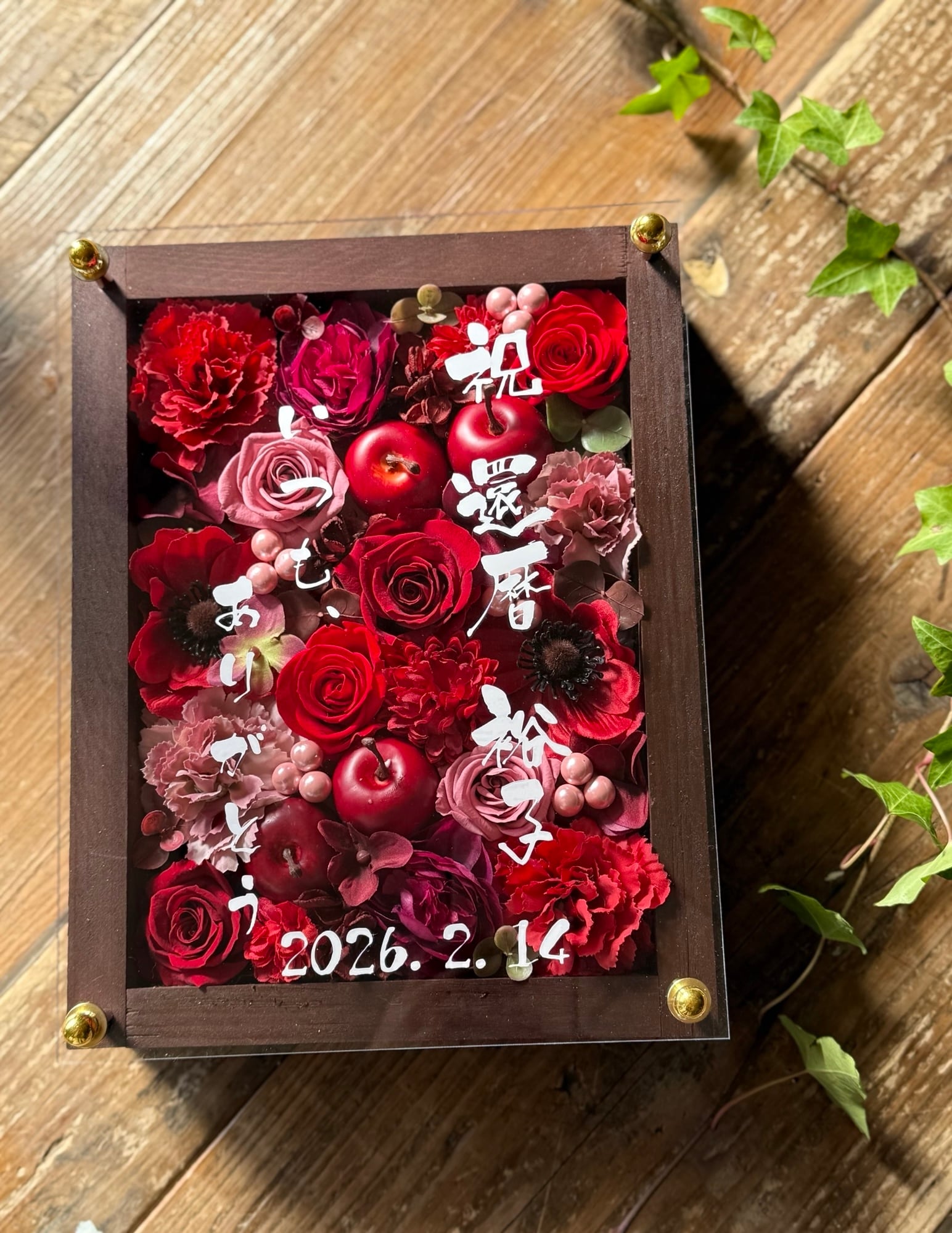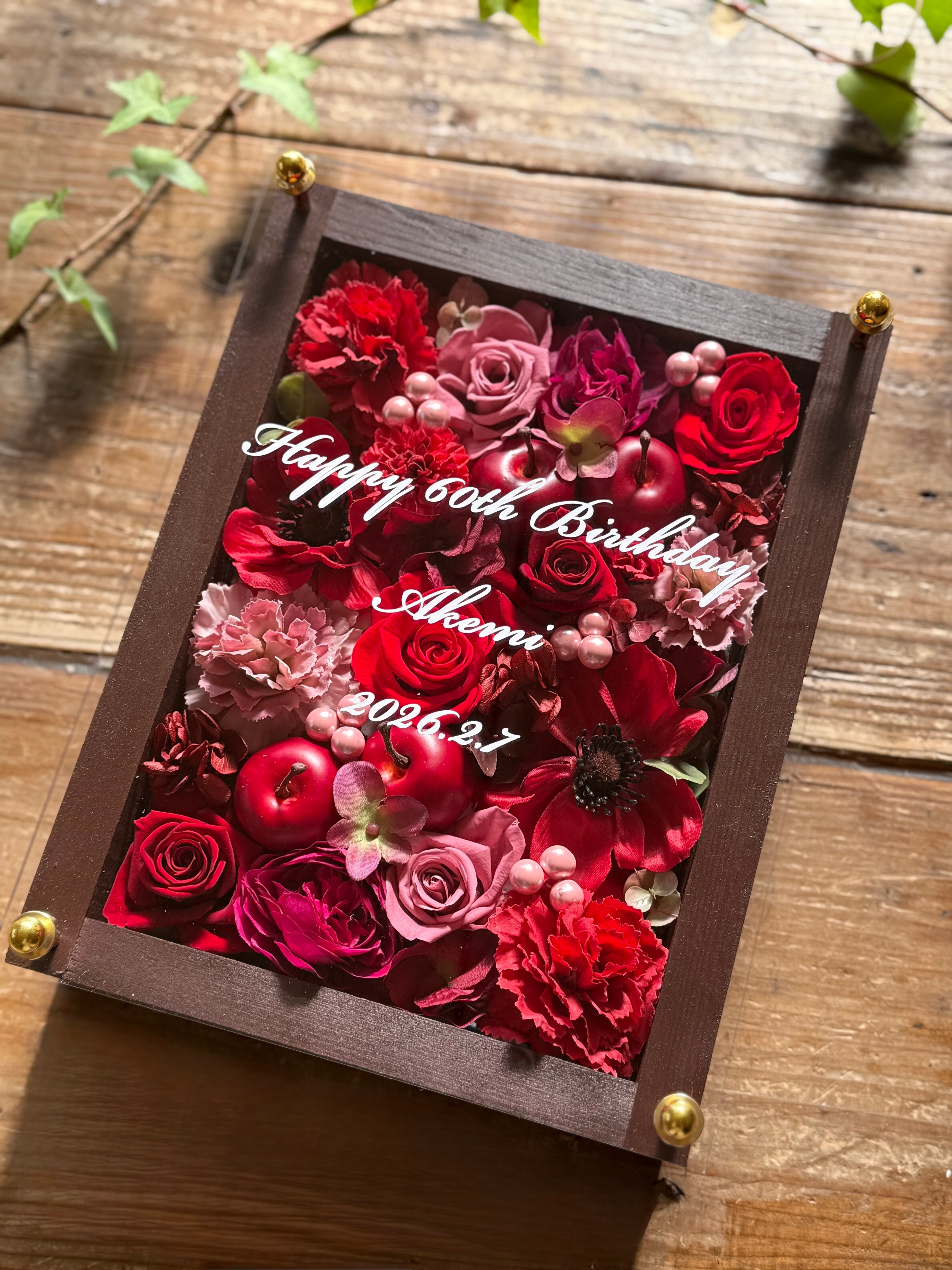 還暦祝い・週年祝い・結婚記念日祝い・退職祝い【名入れ】プリザーブドフラワーアレンジ ウッドフレーム 茶木枠〈レッド〉