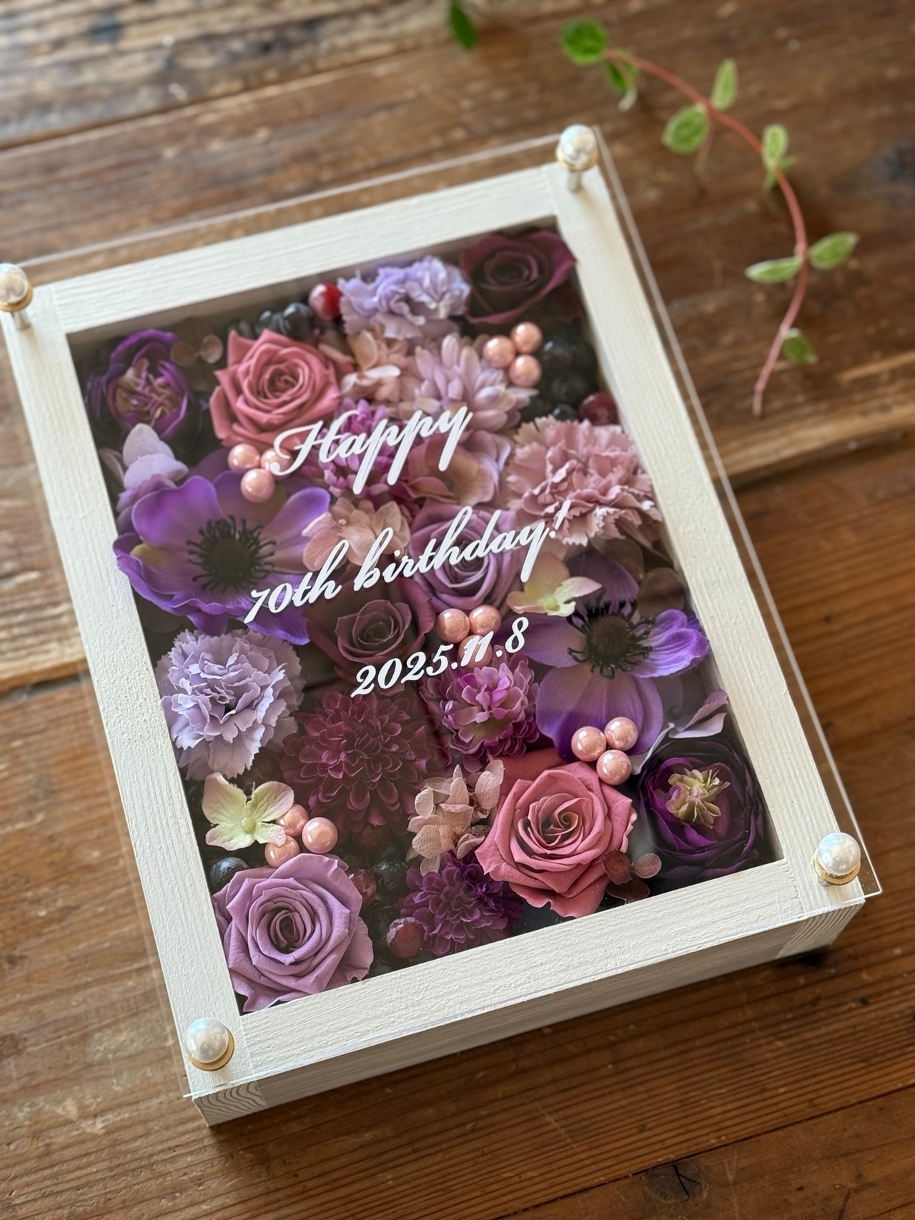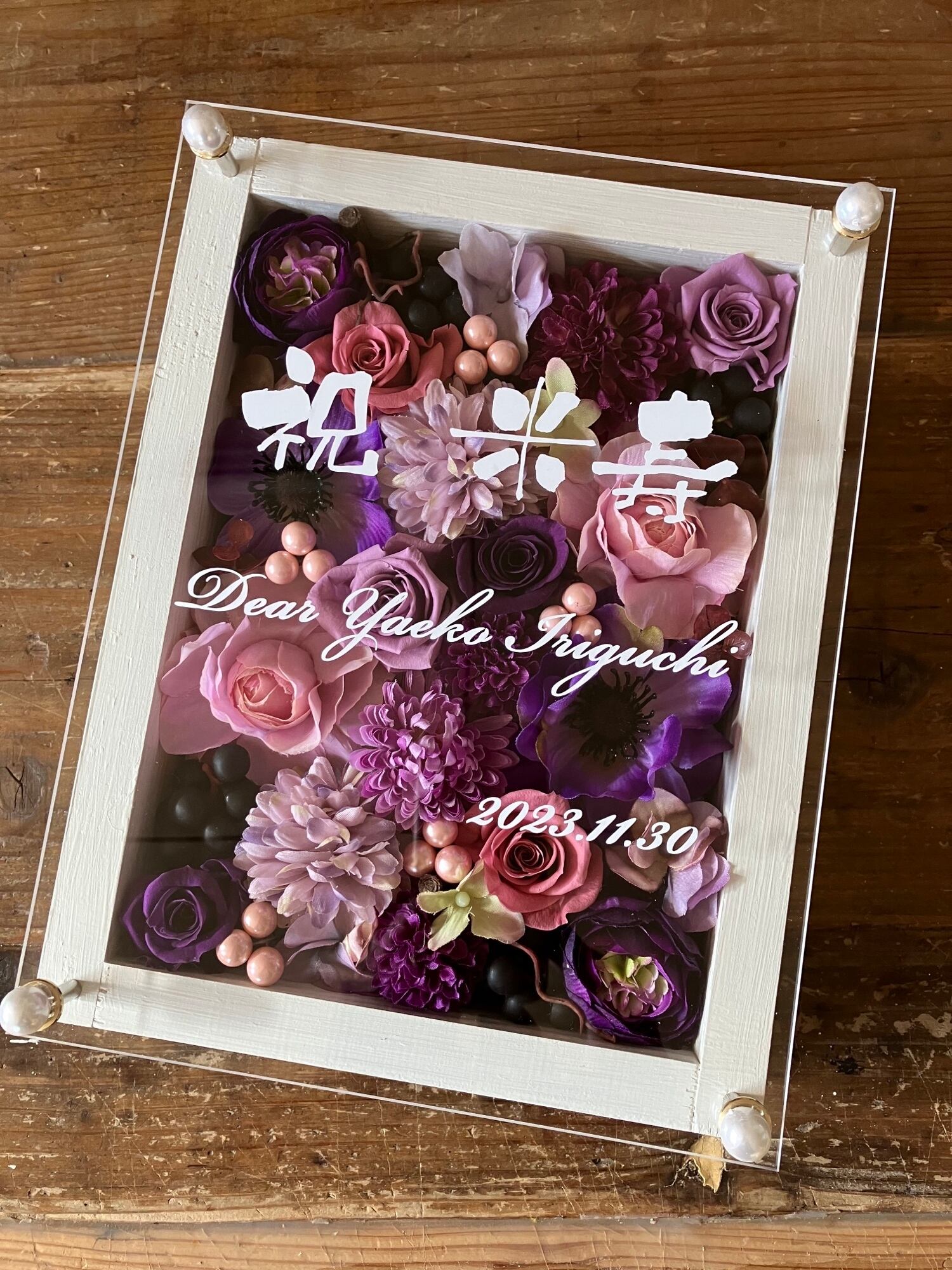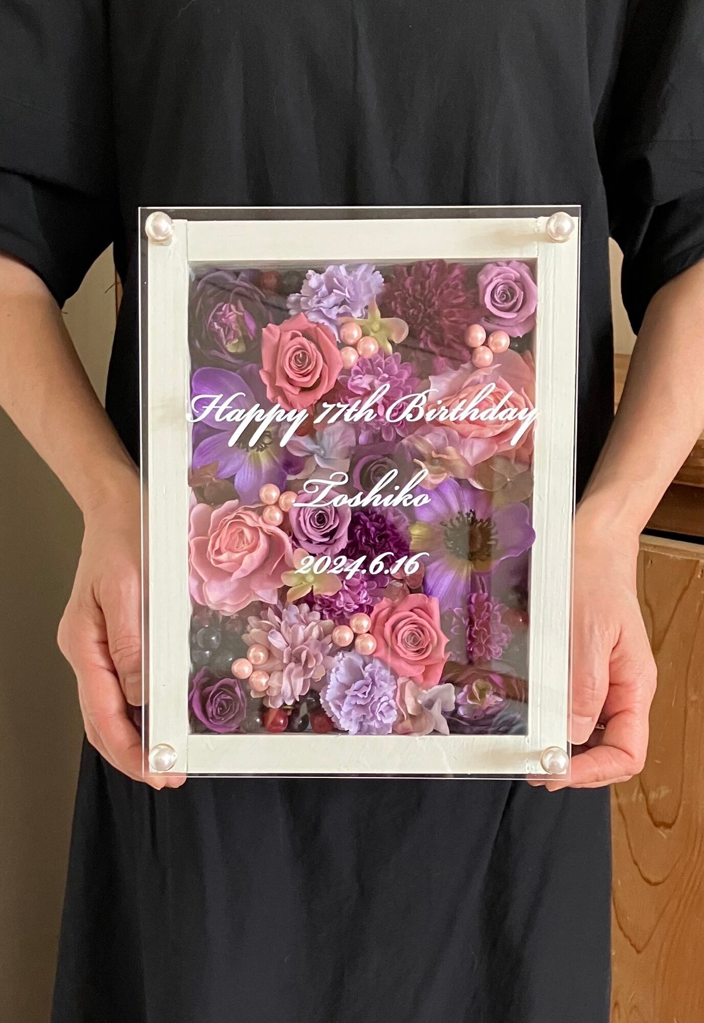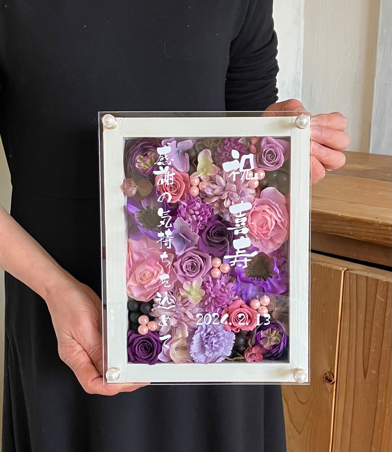 お花のギフト|白木枠〈パープル〉名入れ可/喜寿・古希・退職・誕生日祝いに