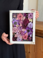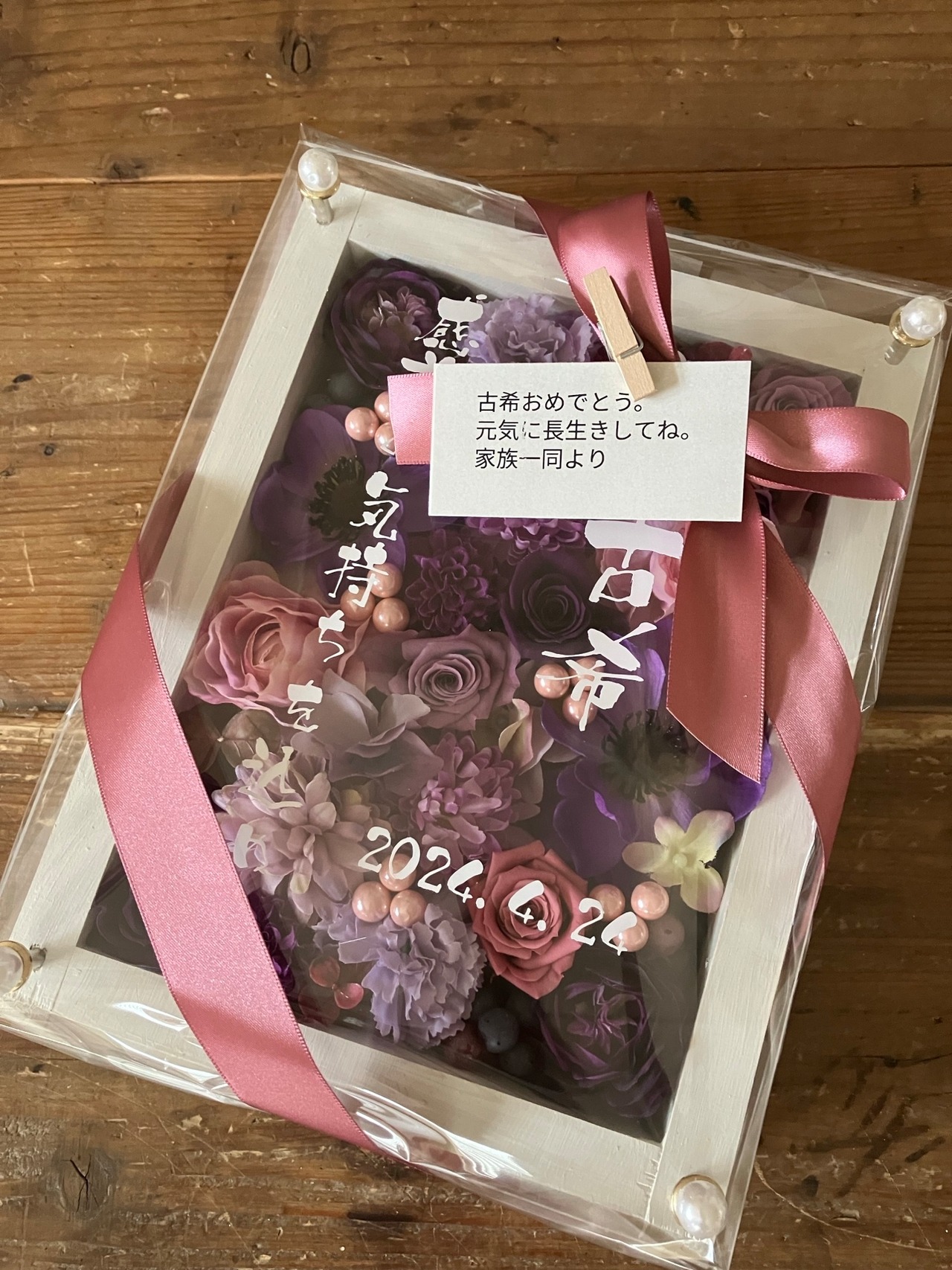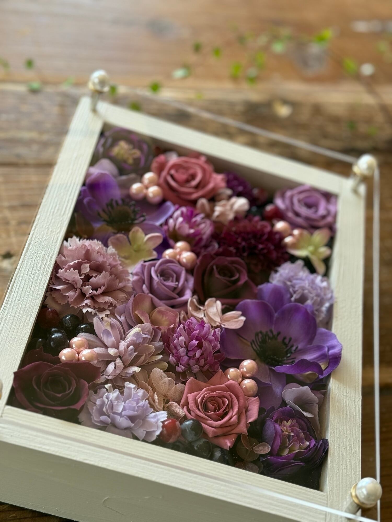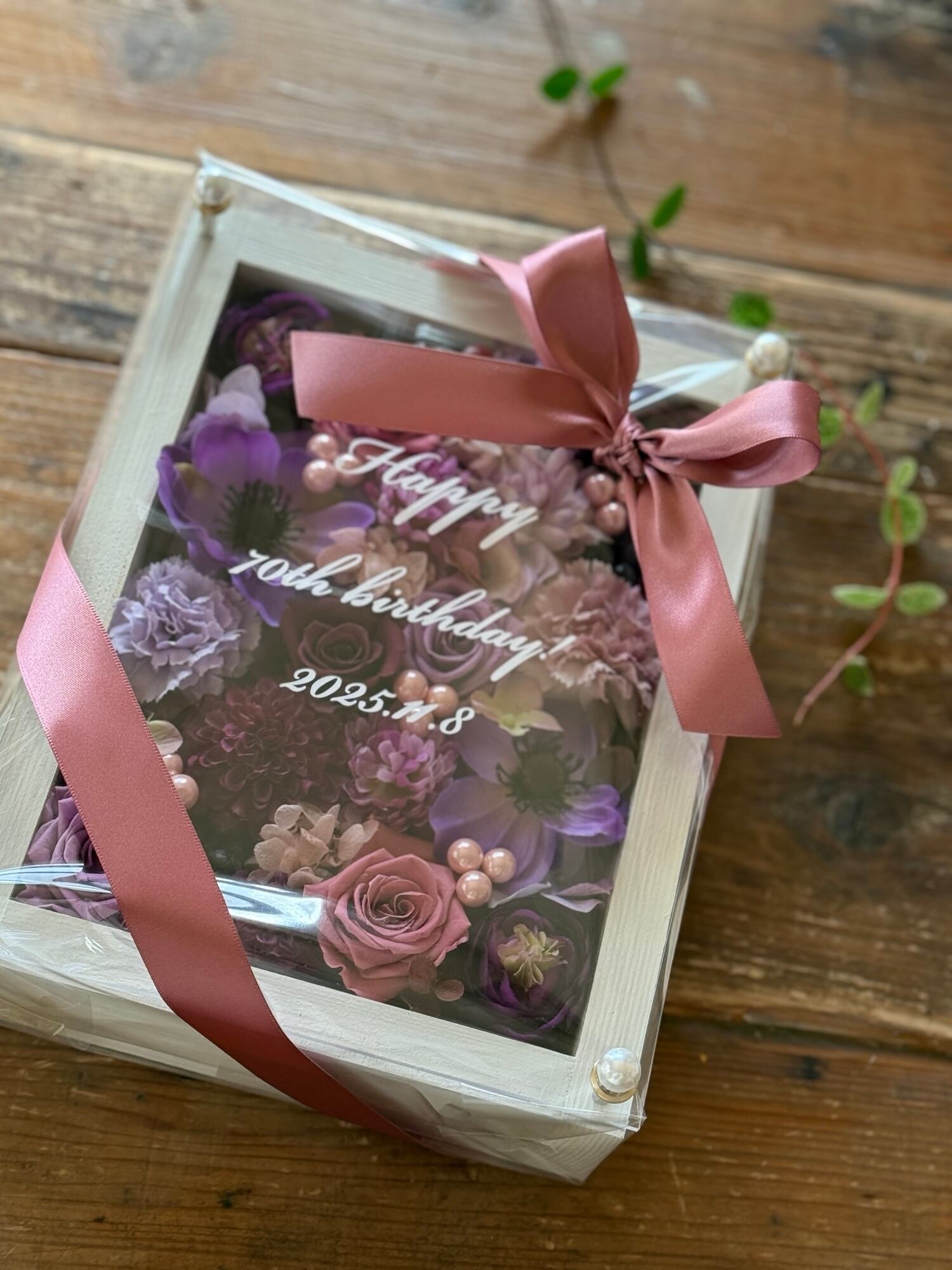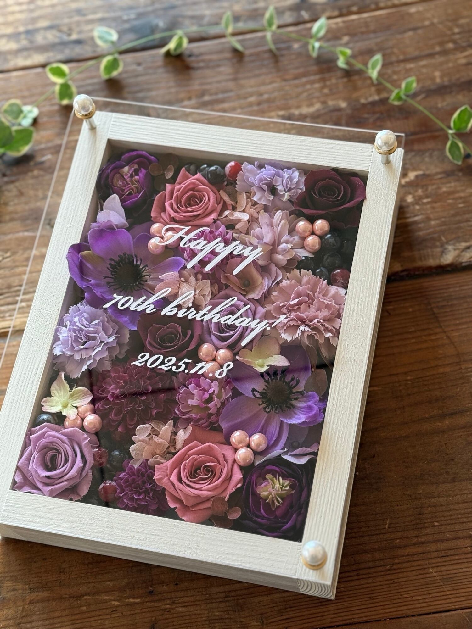 お花のギフト|白木枠〈パープル〉名入れ可/喜寿・古希・退職・誕生日祝いに