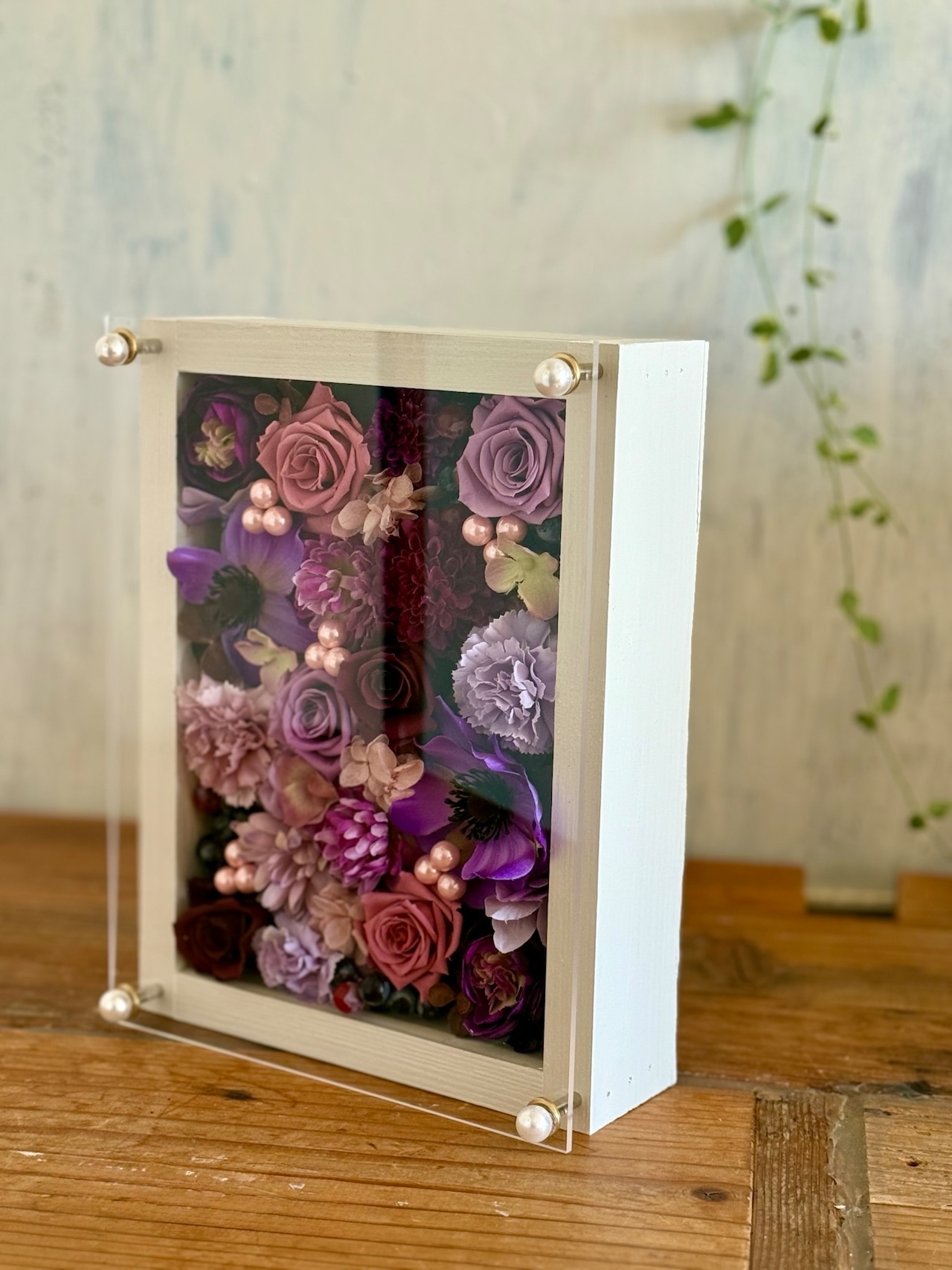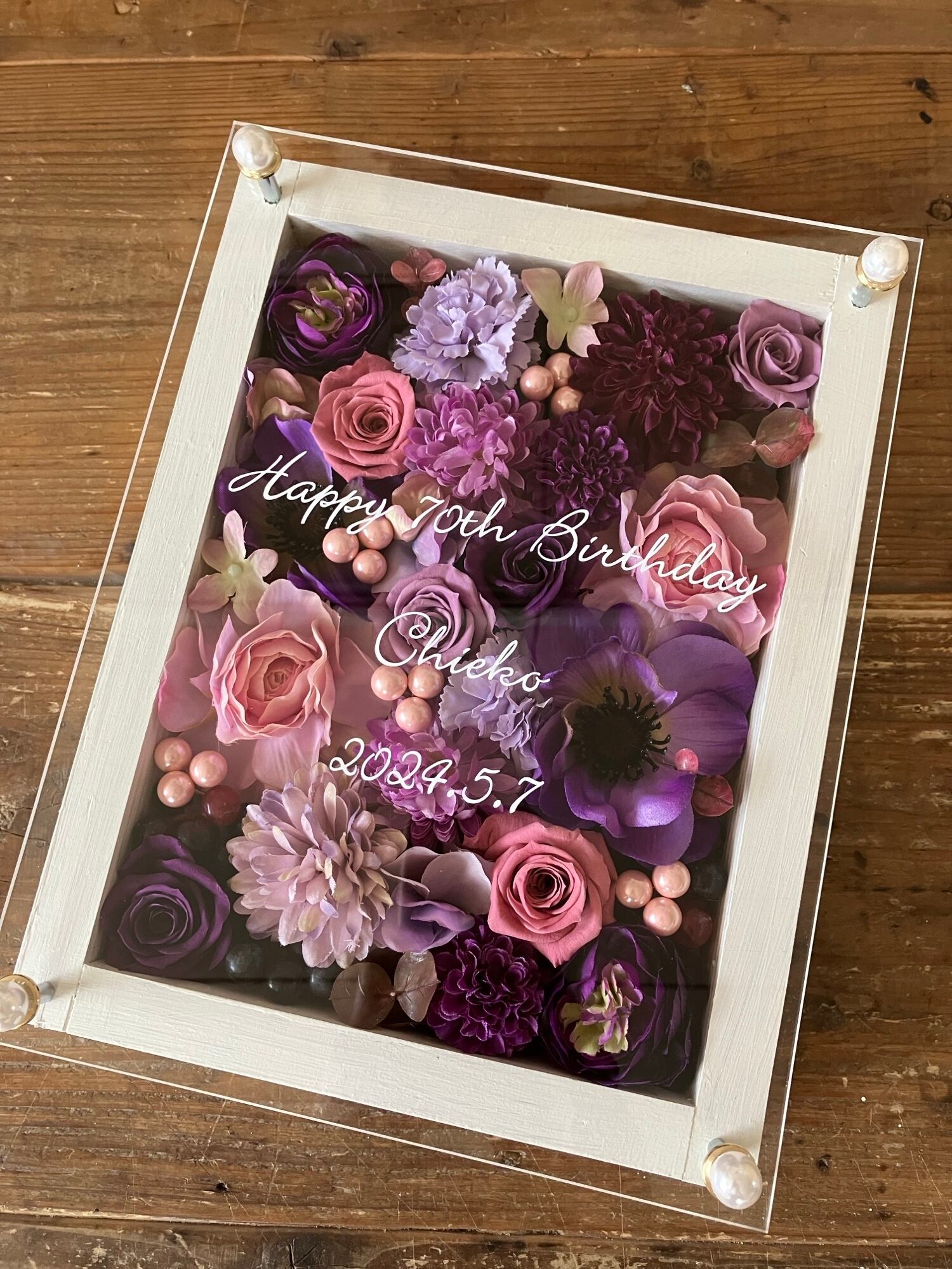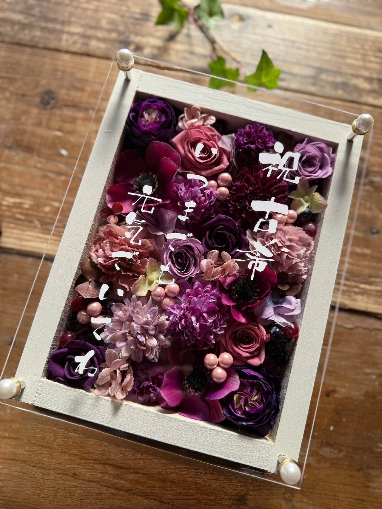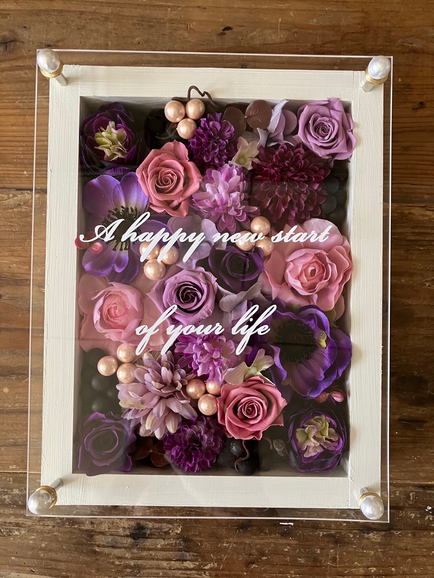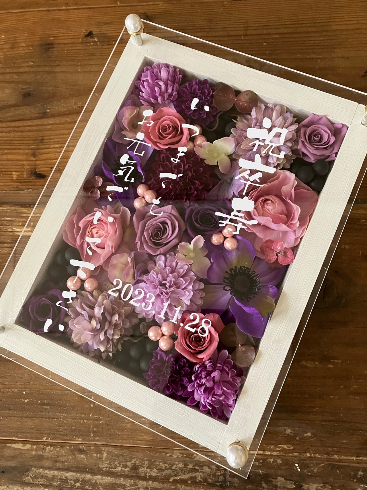 白色のウッドフレームにプリザーブドフラワーと造花をぎっしり詰め込み、アクリル板にはカッティングシートでメッセージをお入れします。