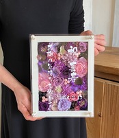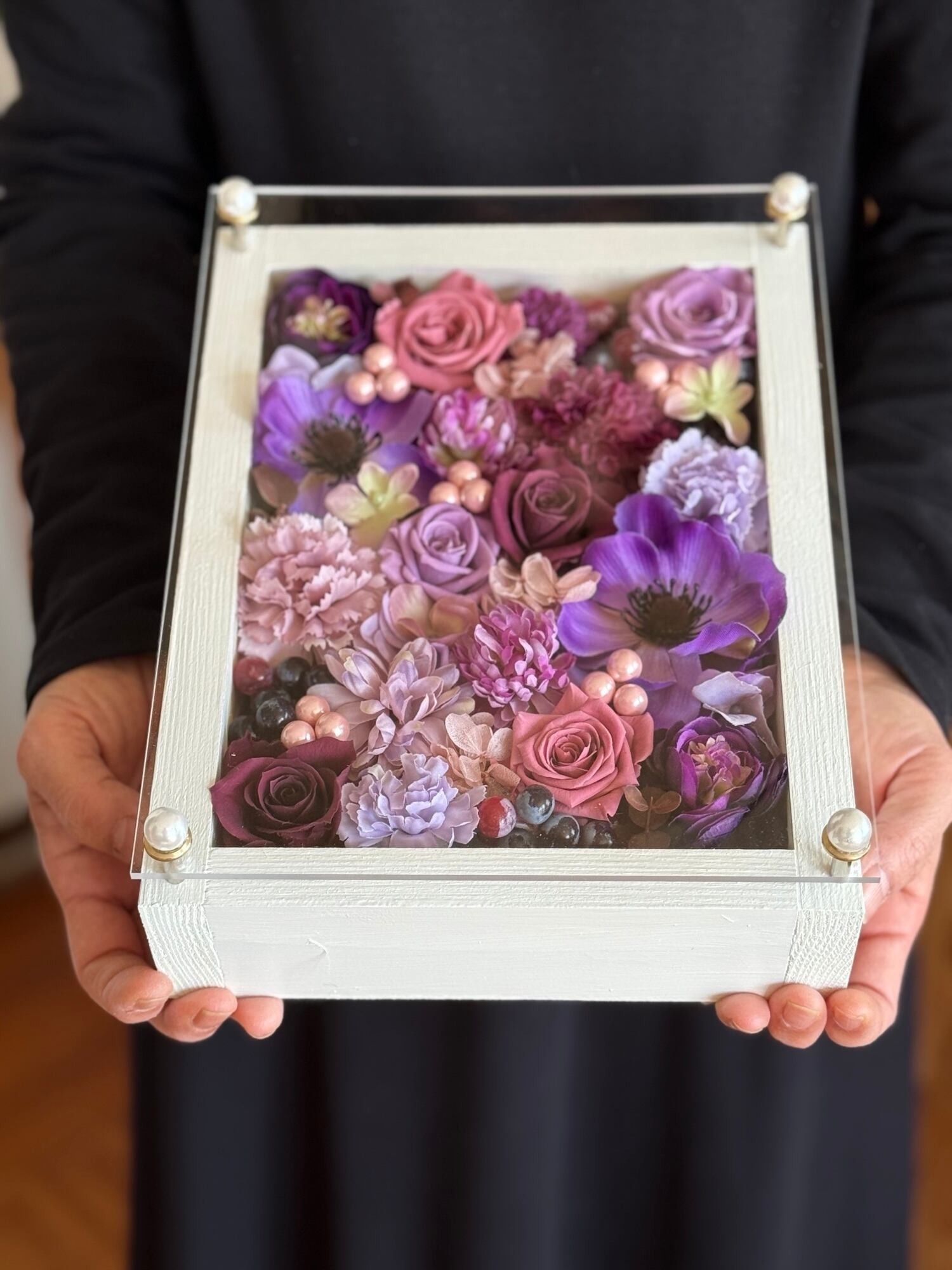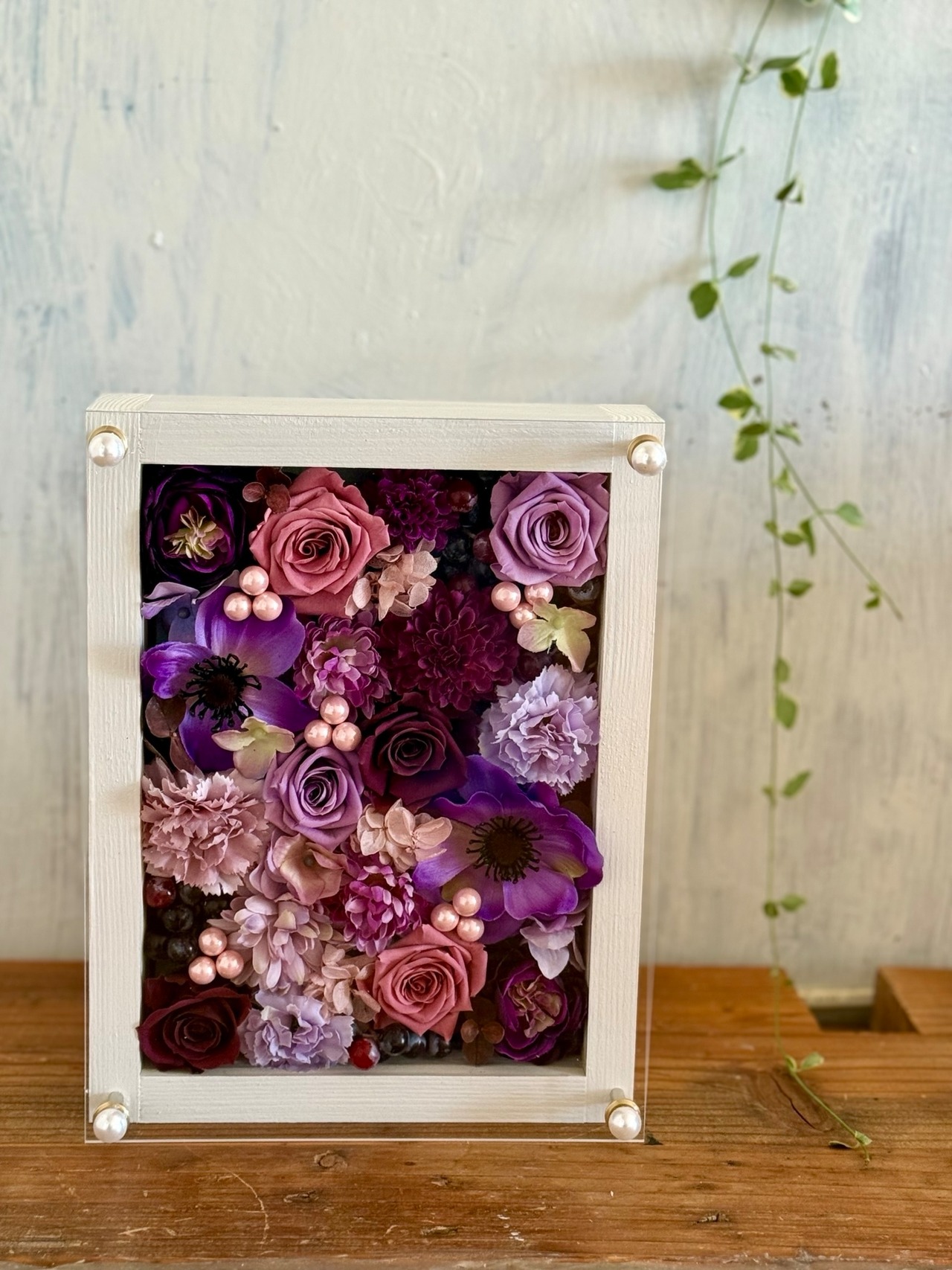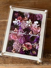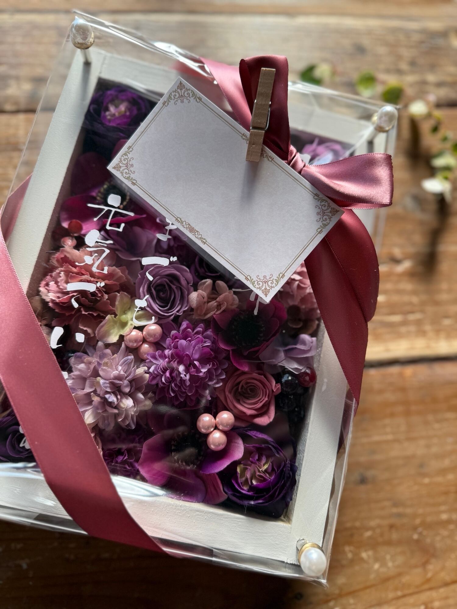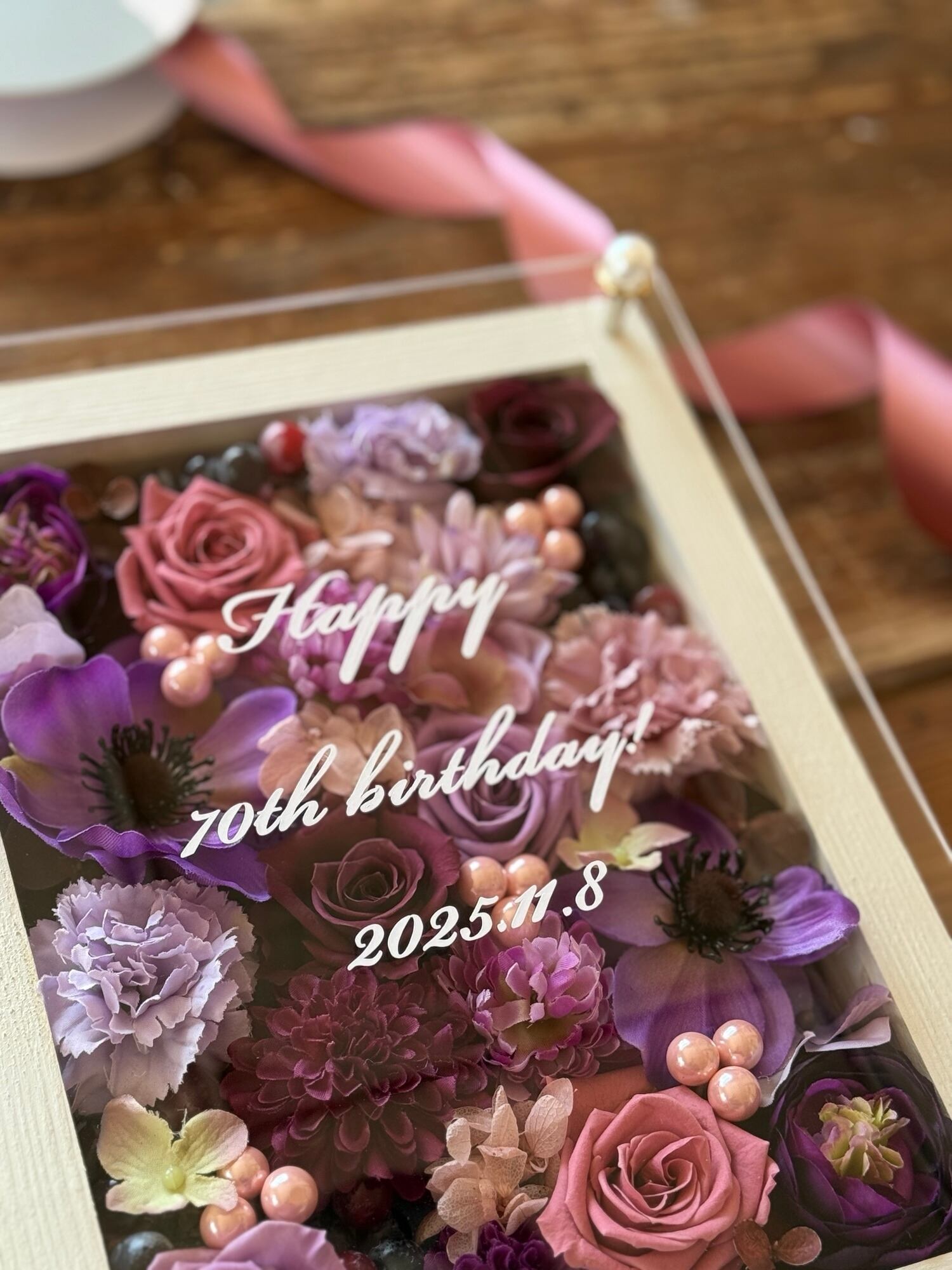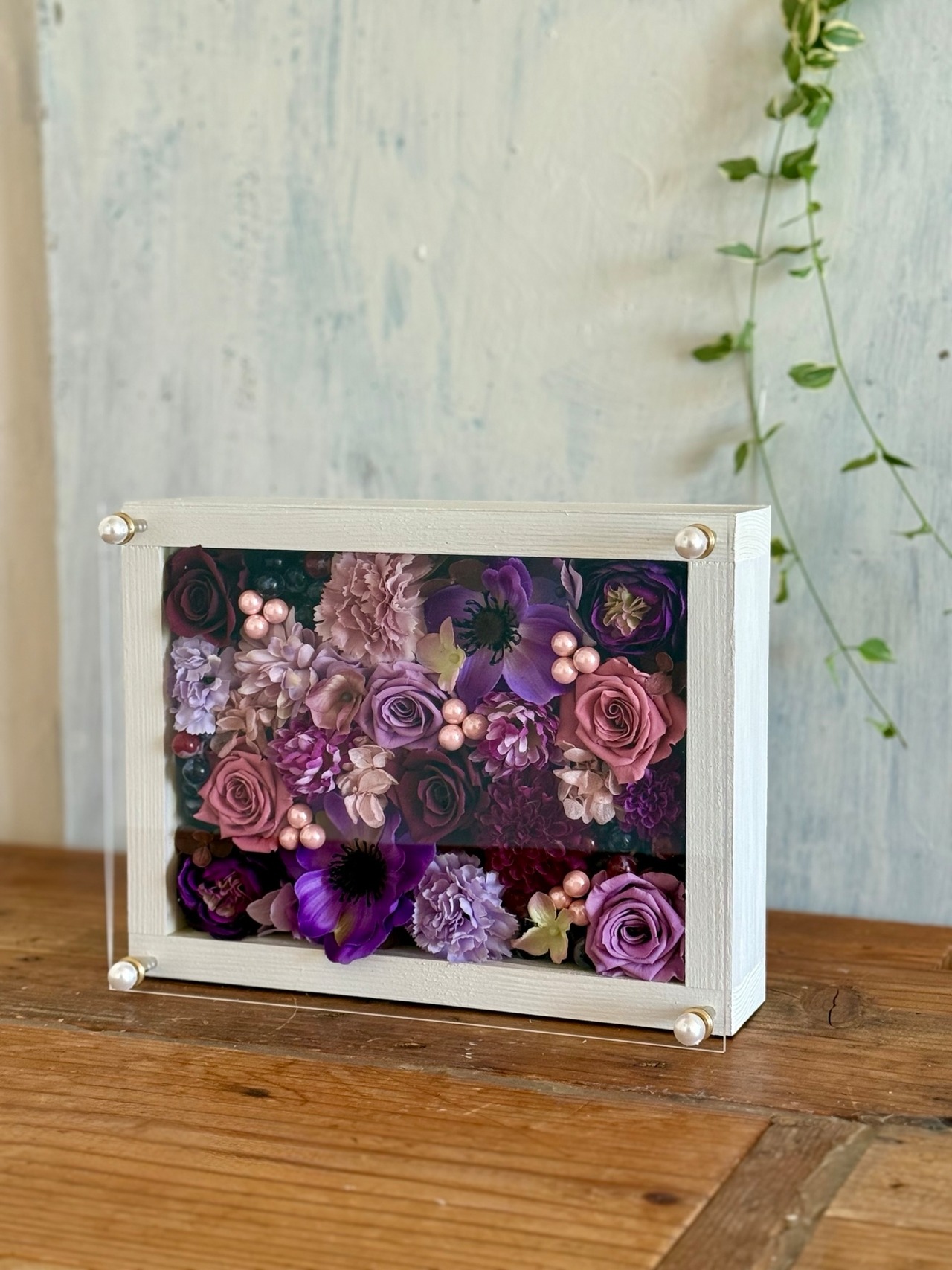 白色のウッドフレームにプリザーブドフラワーと造花をぎっしり詰め込み、アクリル板にはカッティングシートでメッセージをお入れします。