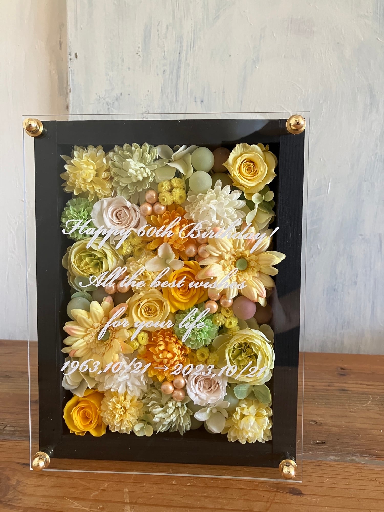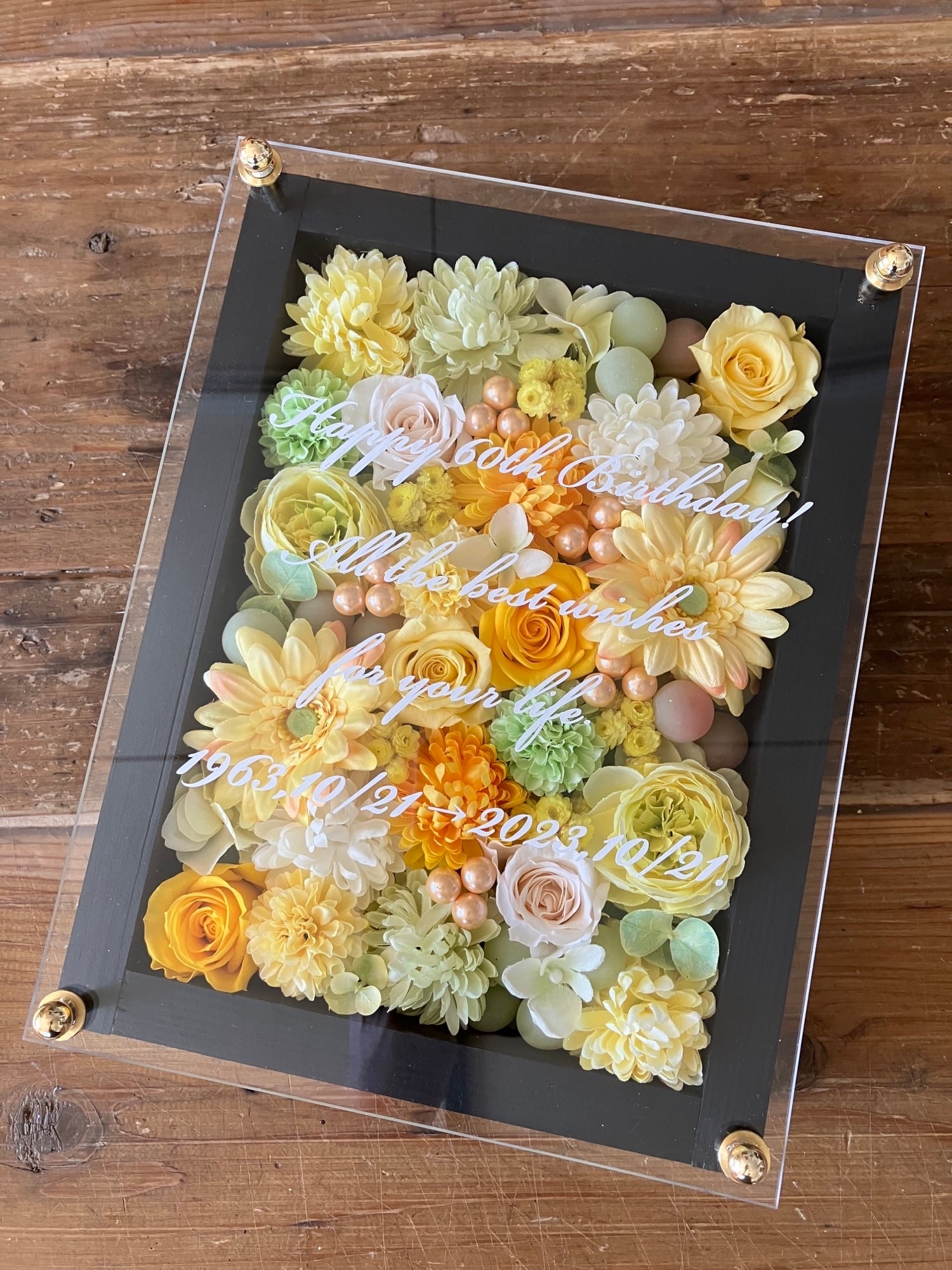 ウッドフレームにプリザーブドフラワーと造花をぎっしり詰め込みアクリル板にはカッティングシートでメッセージをお入れします。