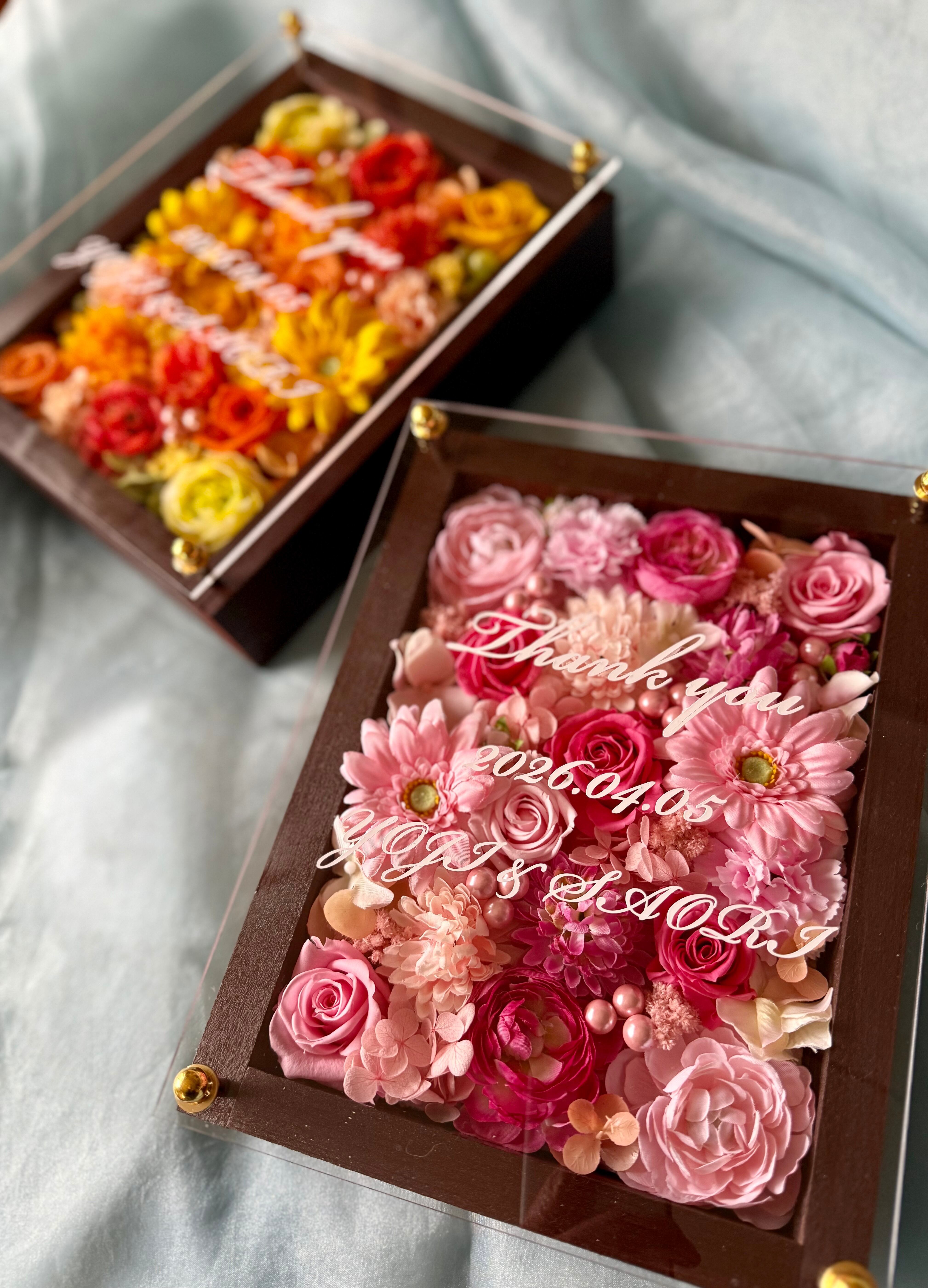 子育て感謝状・両親贈呈品 2個セット【名入れ】プリザーブドフラワーアレンジ ウッドフレーム〈ピンク&イエローオレンジ〉結婚式 ギフト