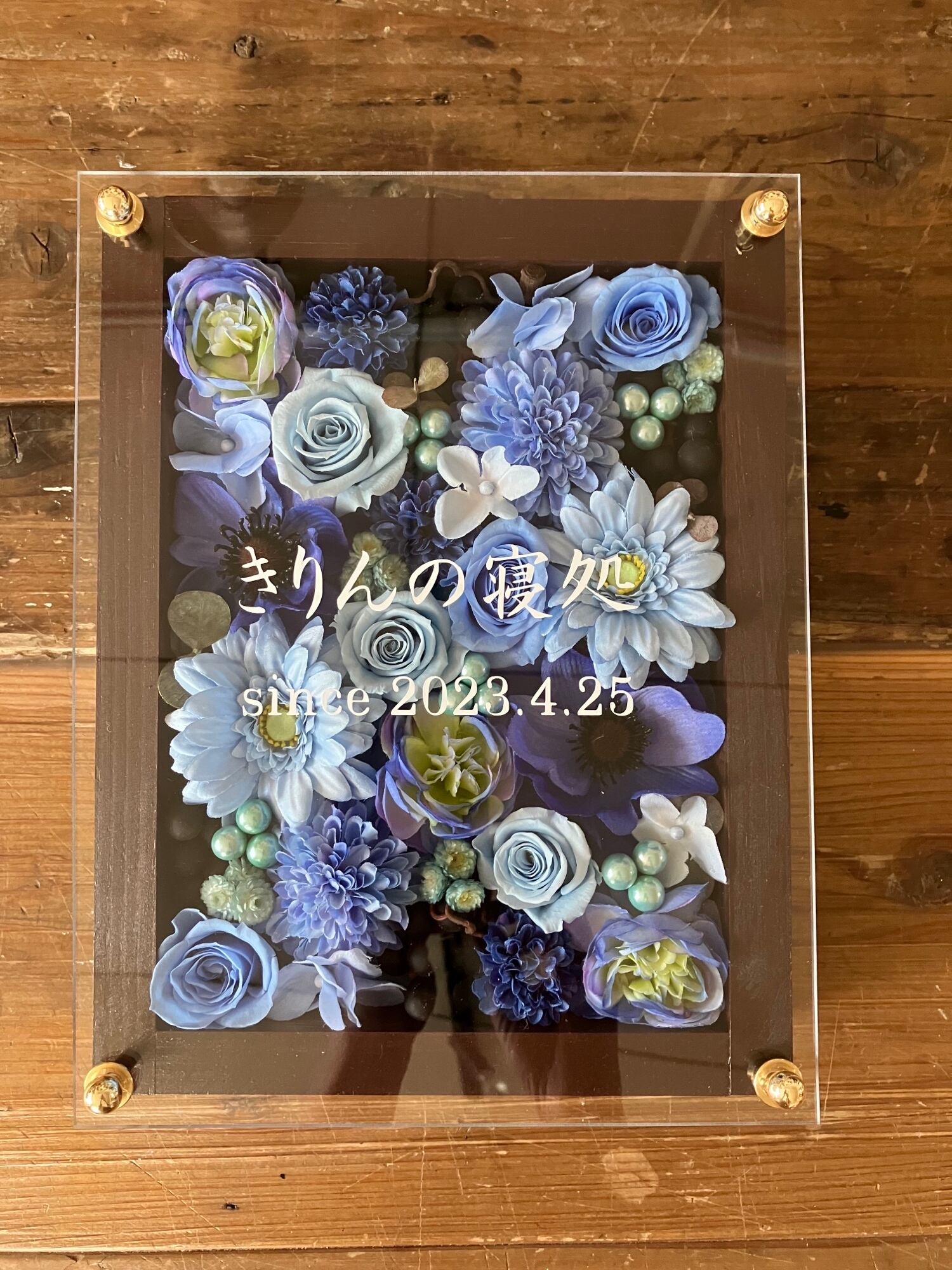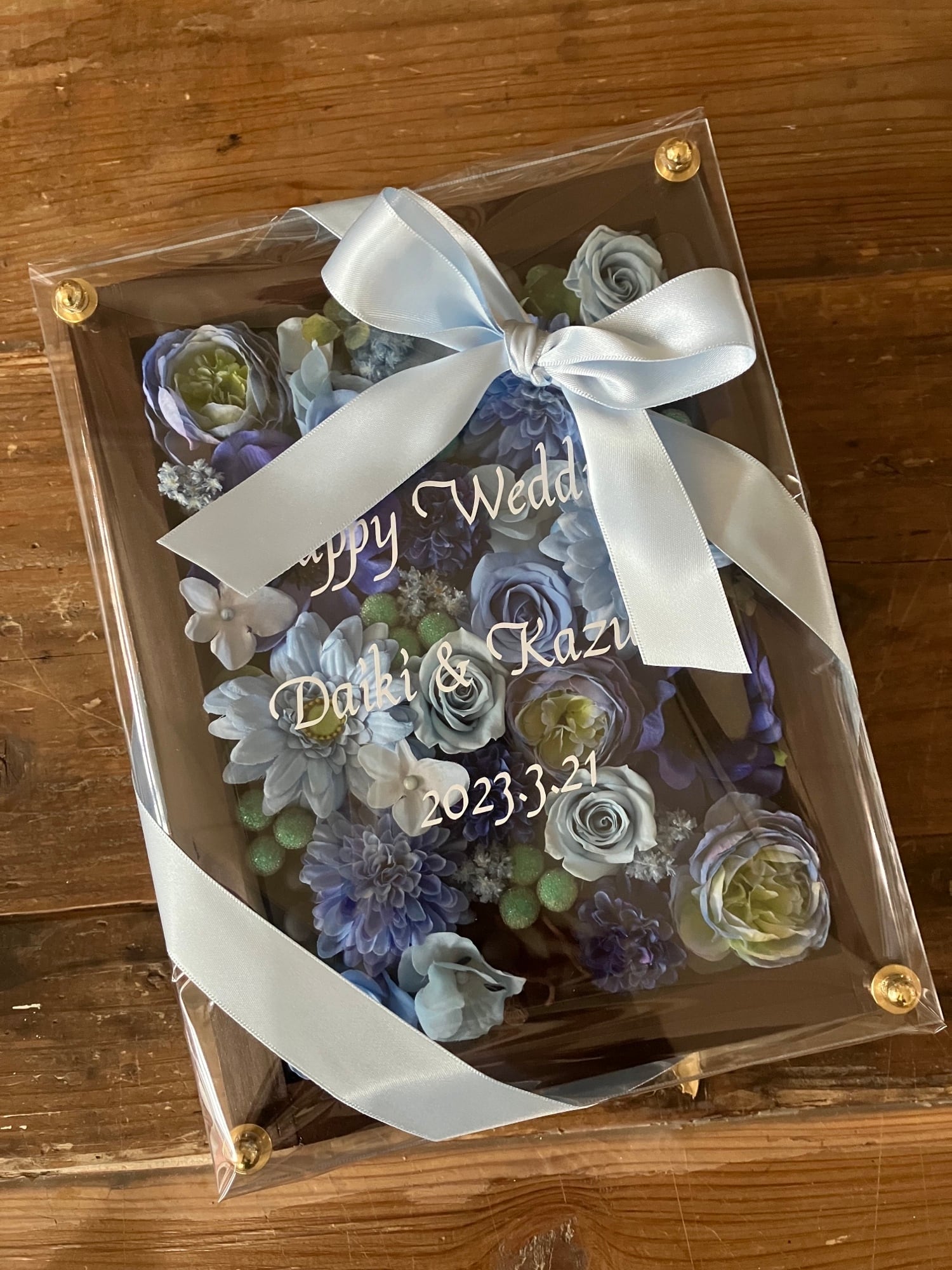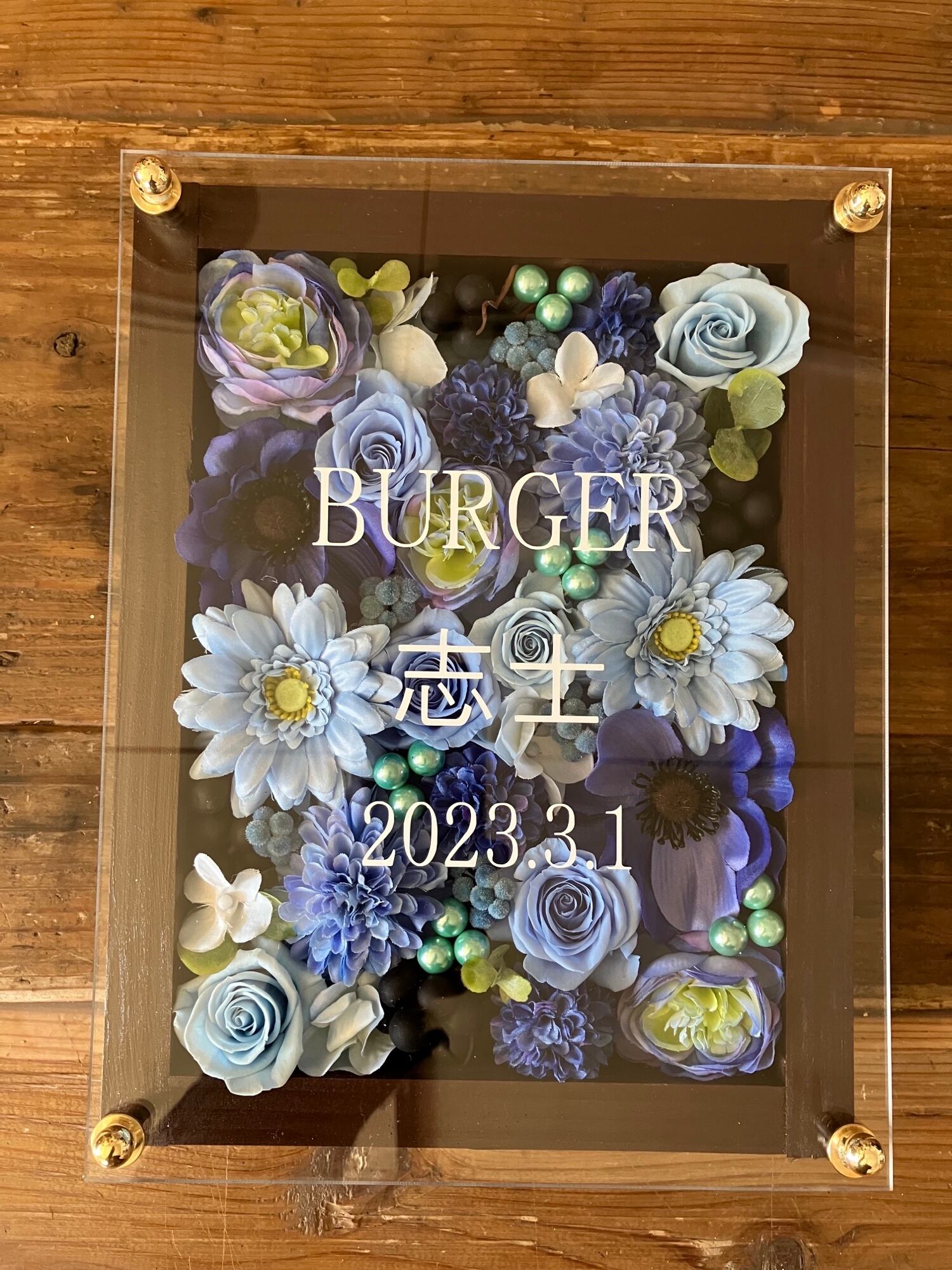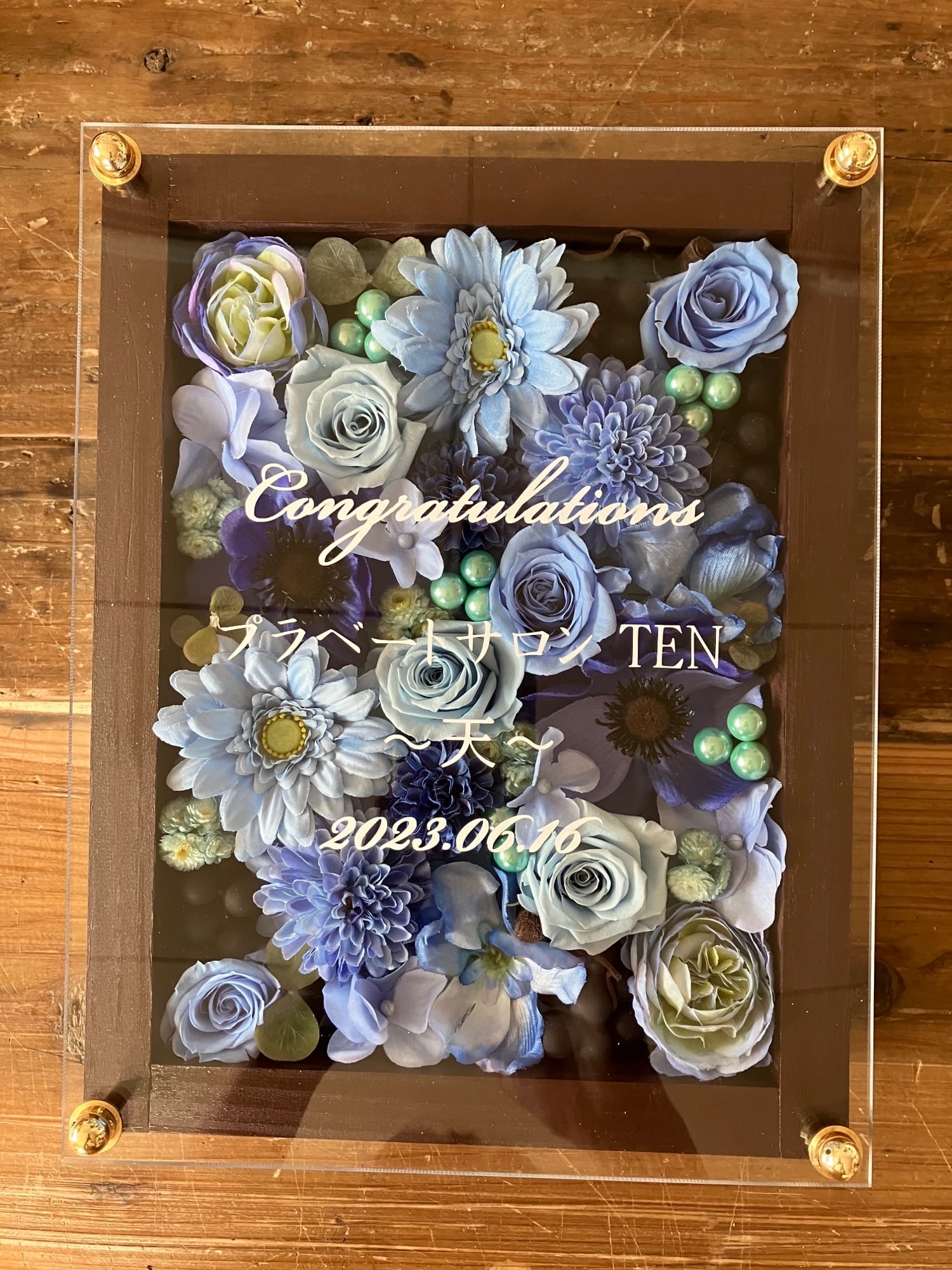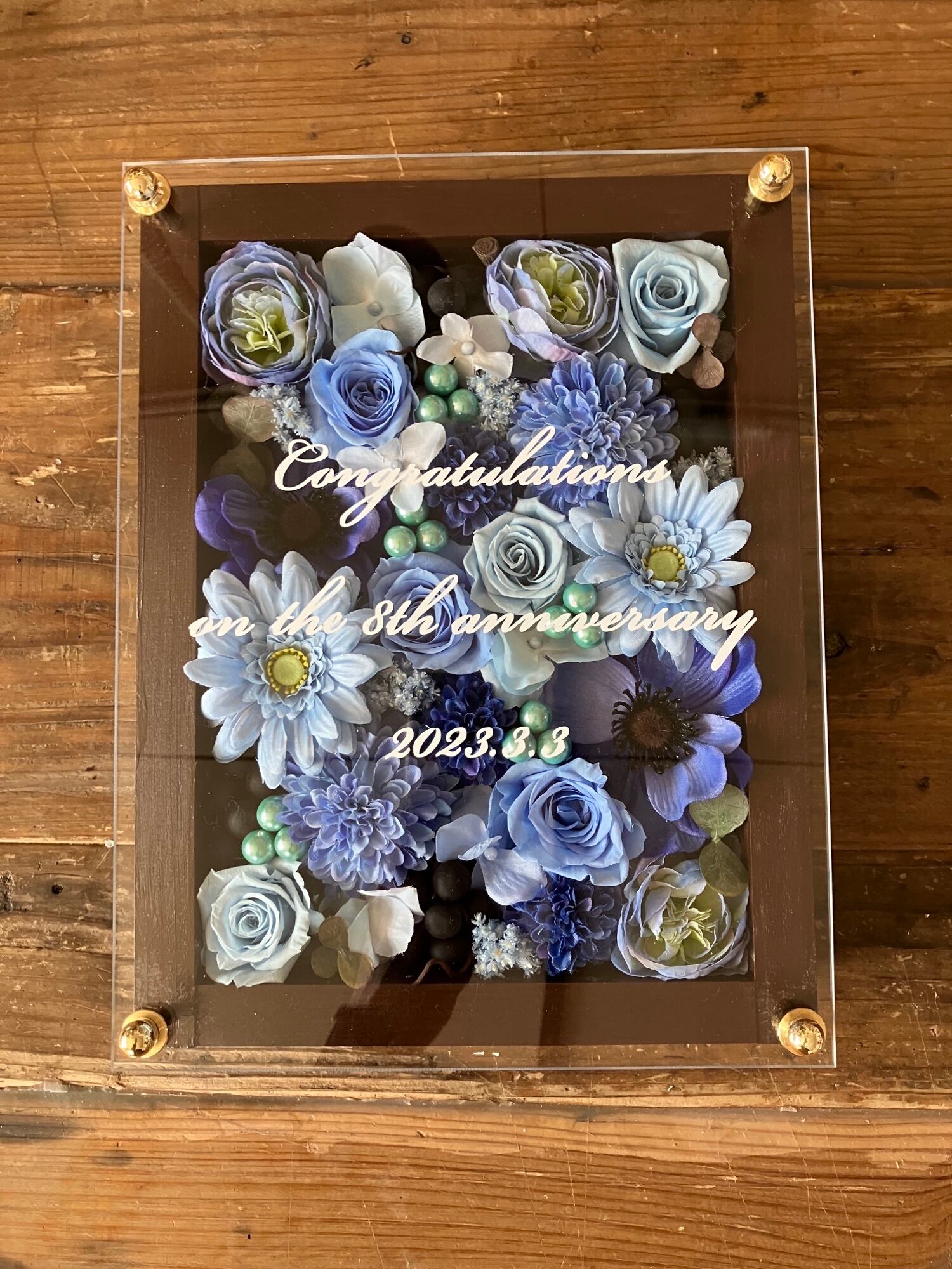 茶色のウッドフレームにプリザーブドフラワーと造花をぎっしり詰め込み、アクリル板にはカッティングシートでメッセージをお入れします。