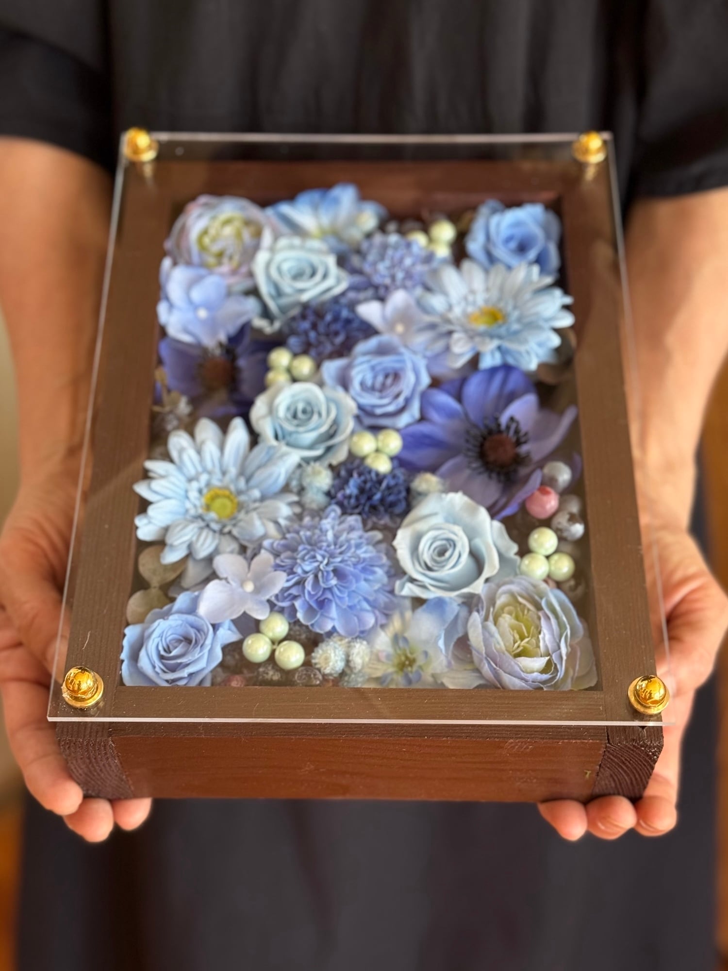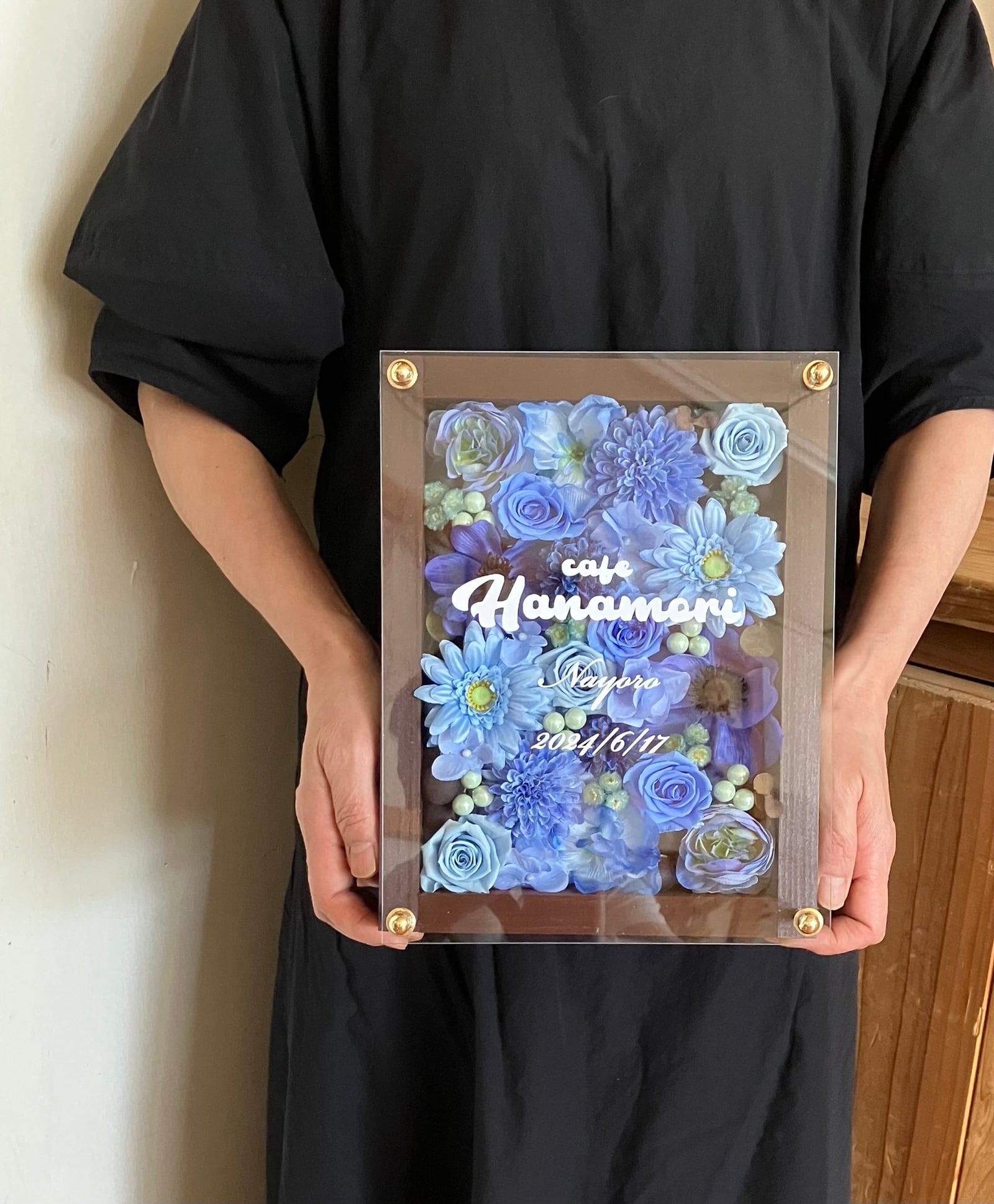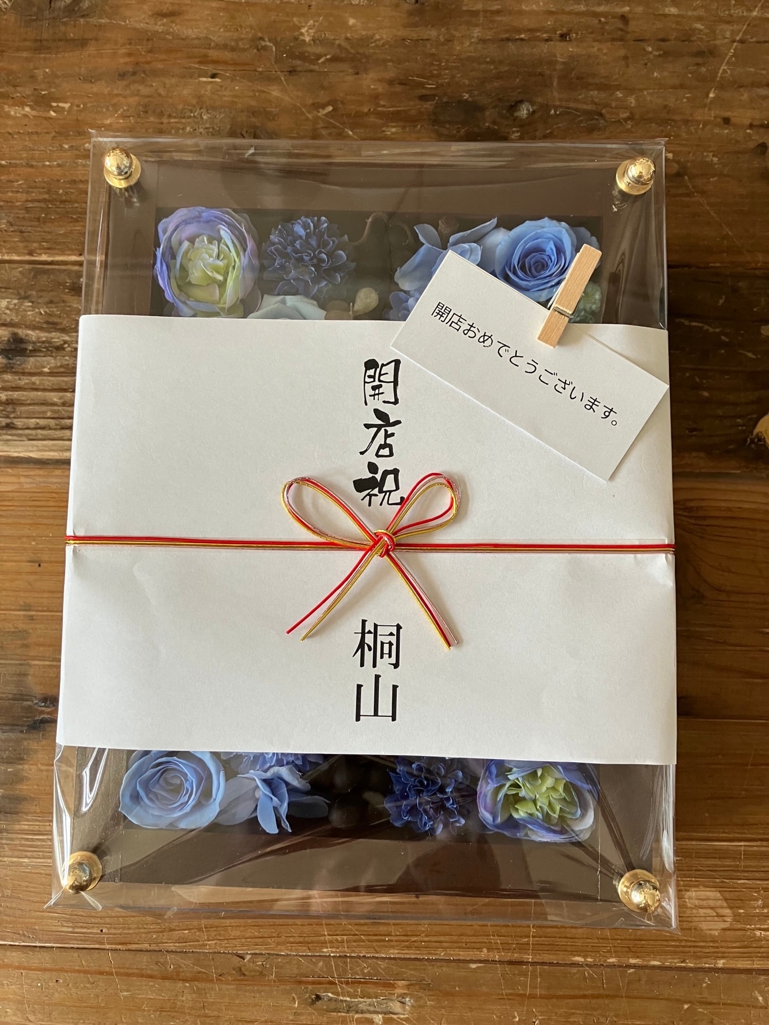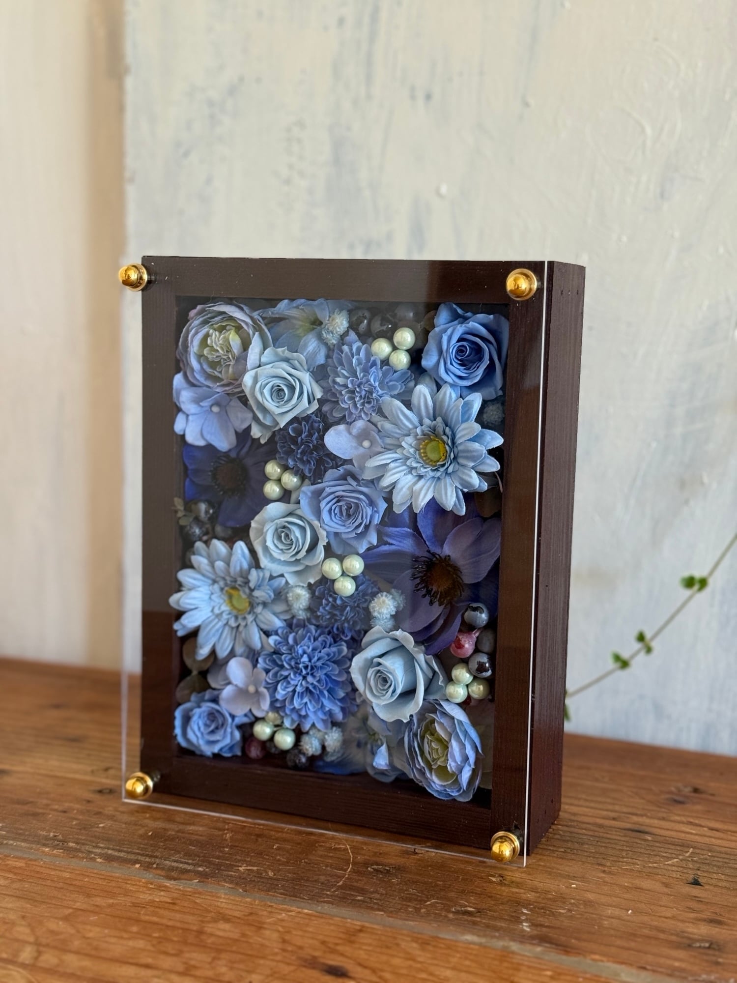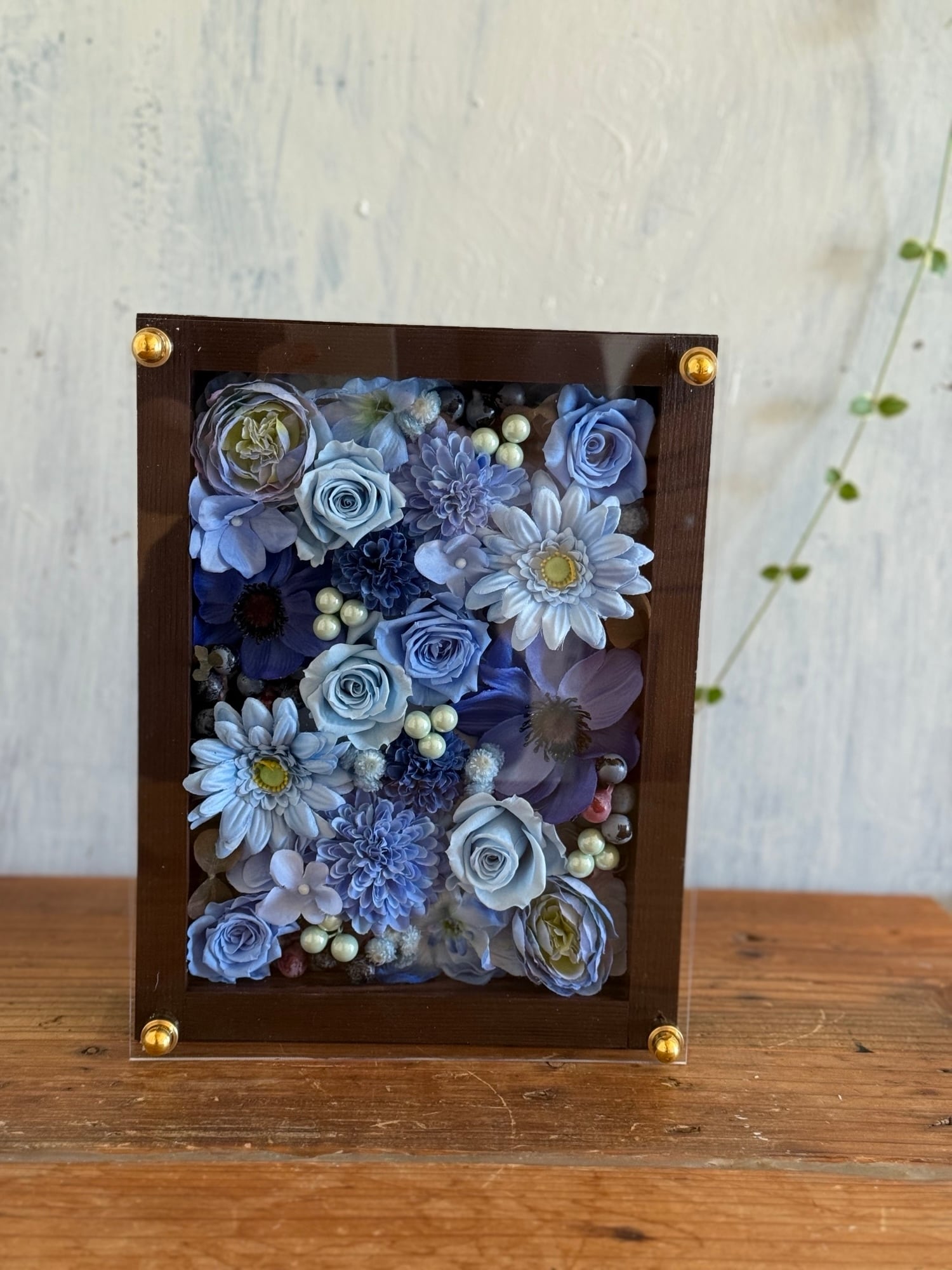 茶色のウッドフレームにプリザーブドフラワーと造花をぎっしり詰め込み、アクリル板にはカッティングシートでメッセージをお入れします。