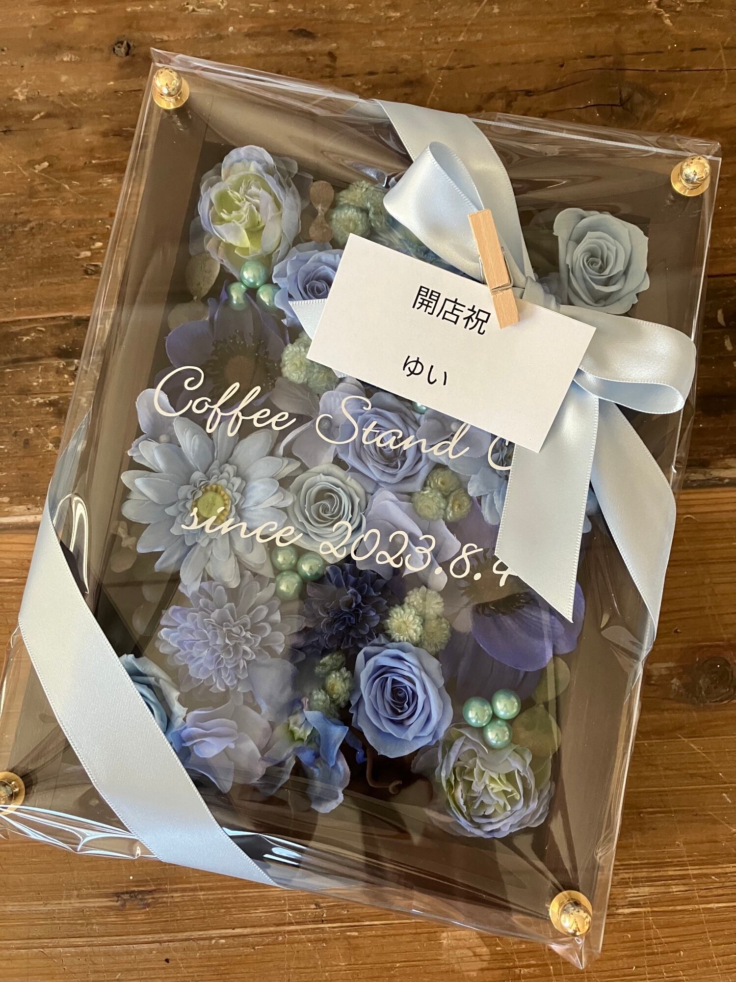 お花のギフト|プリザーブドフラワーアレンジ 茶木枠〈ブルー〉名入れ可/結婚・退職・開店祝いに