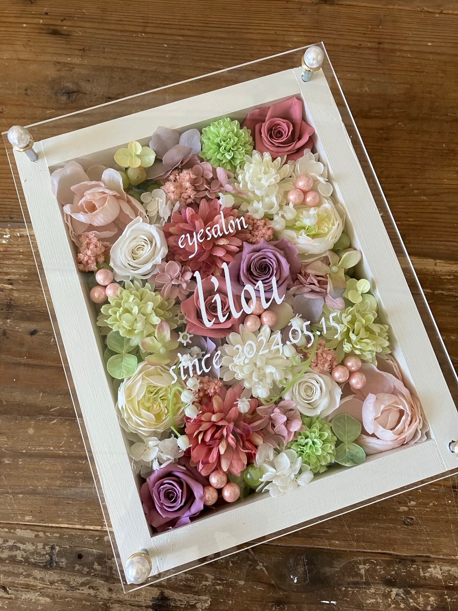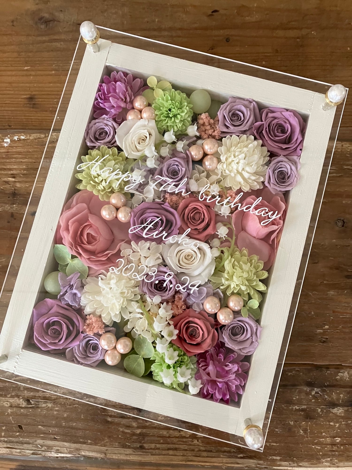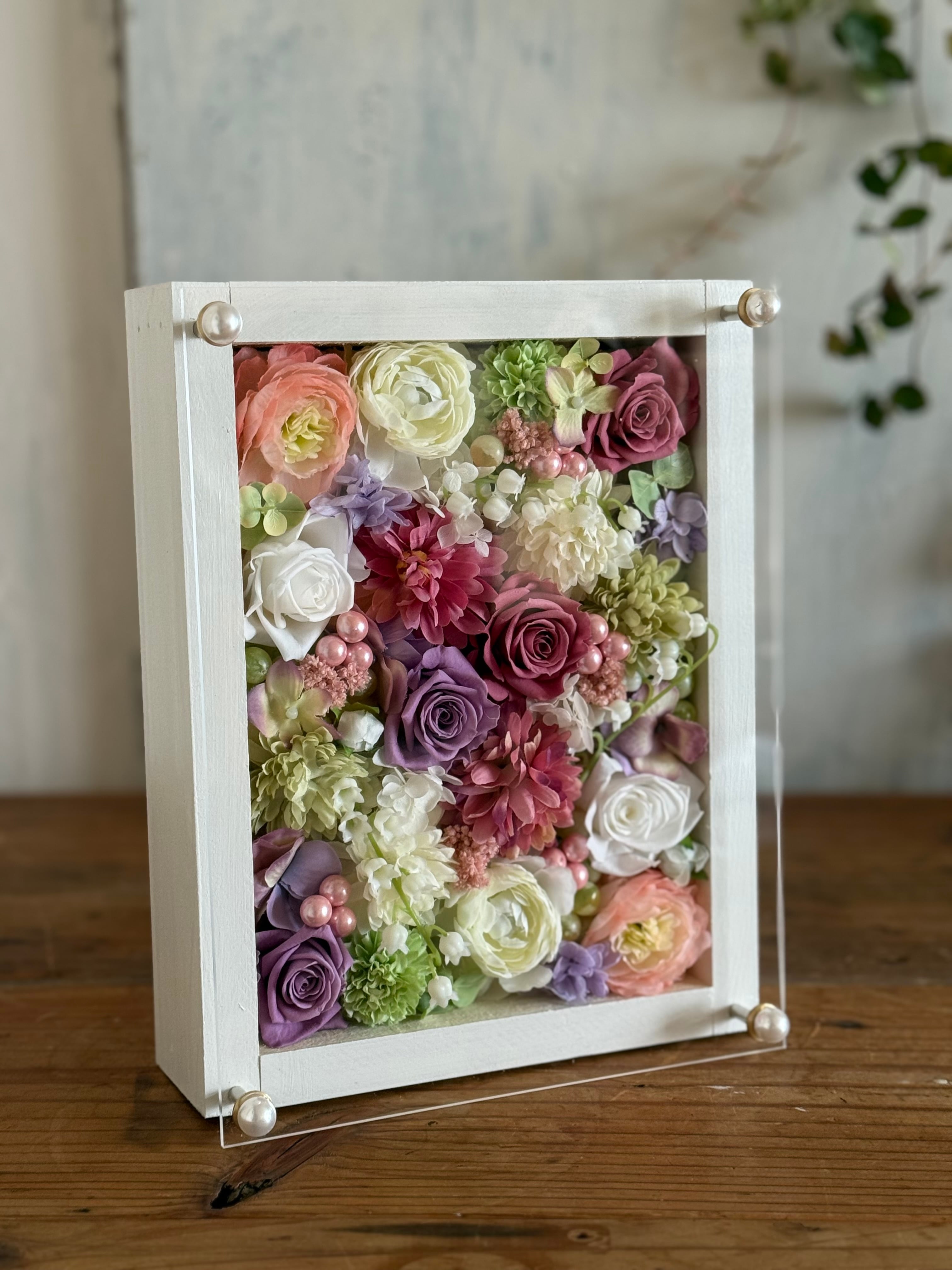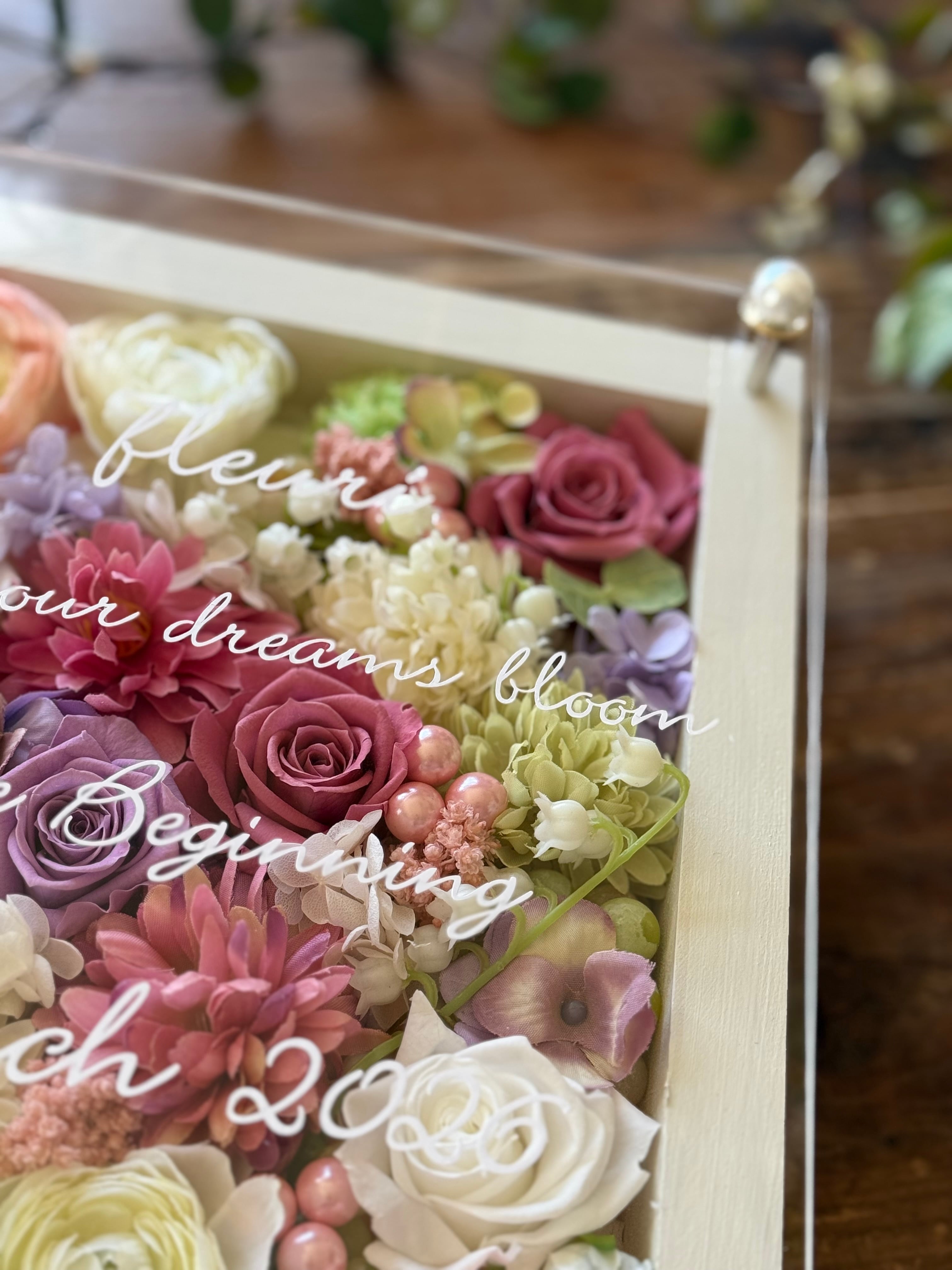 白色のウッドフレームにプリザーブドフラワーと造花をぎっしり詰め込み、アクリル板にはカッティングシートでメッセージをお入れします。