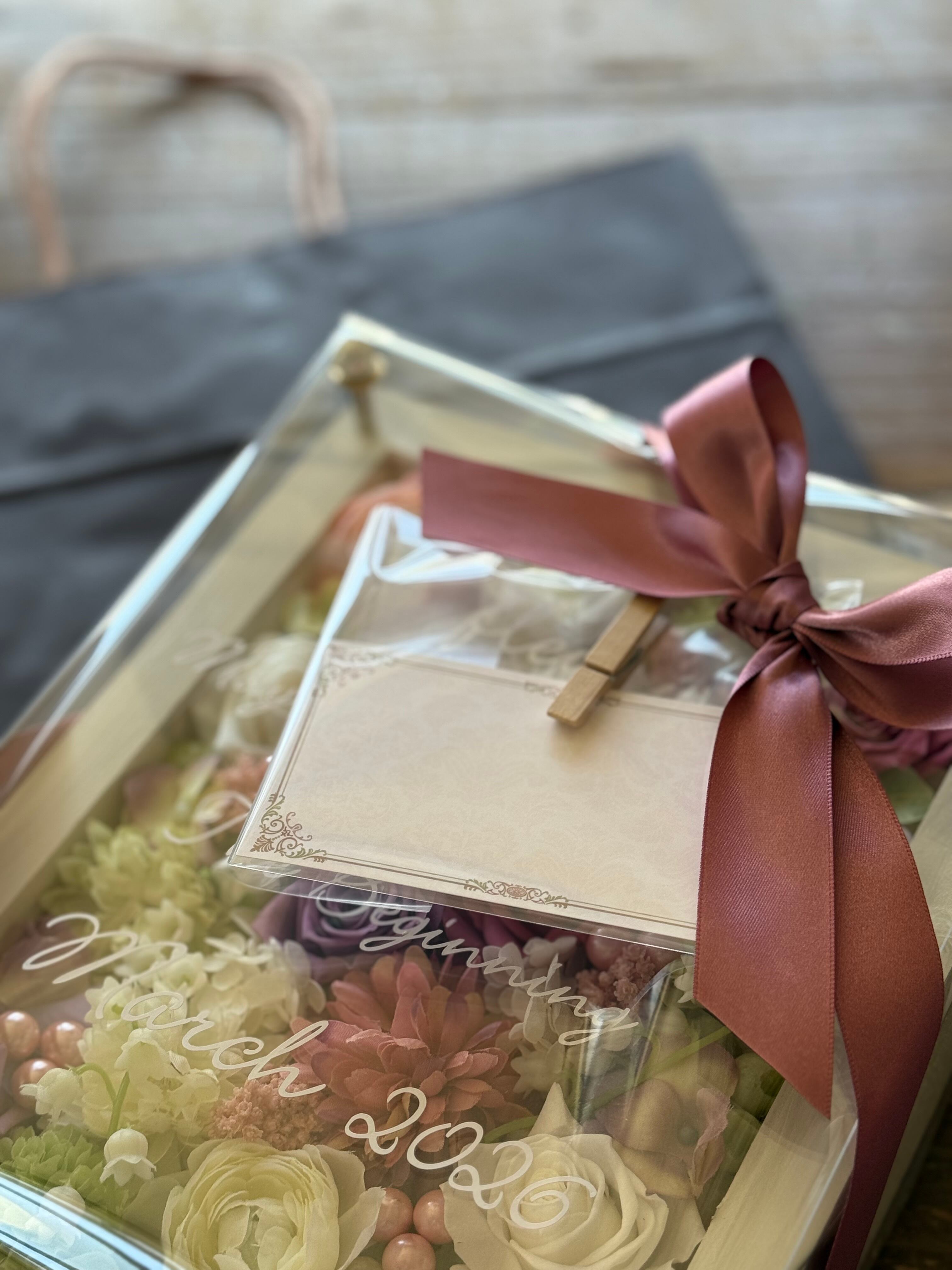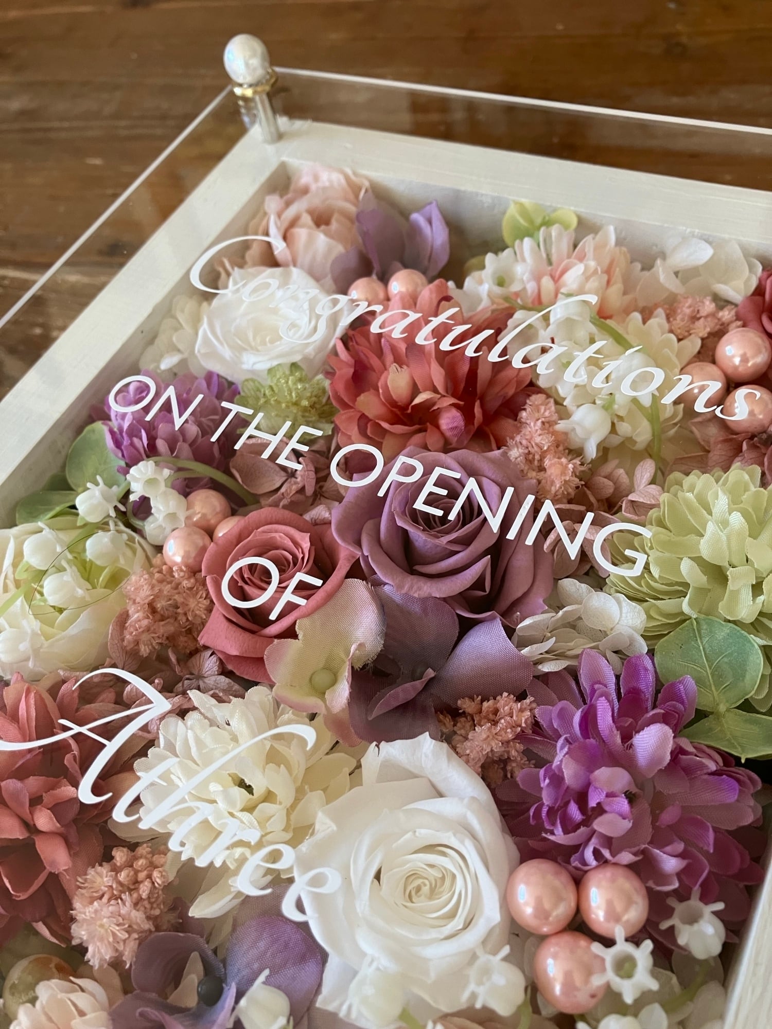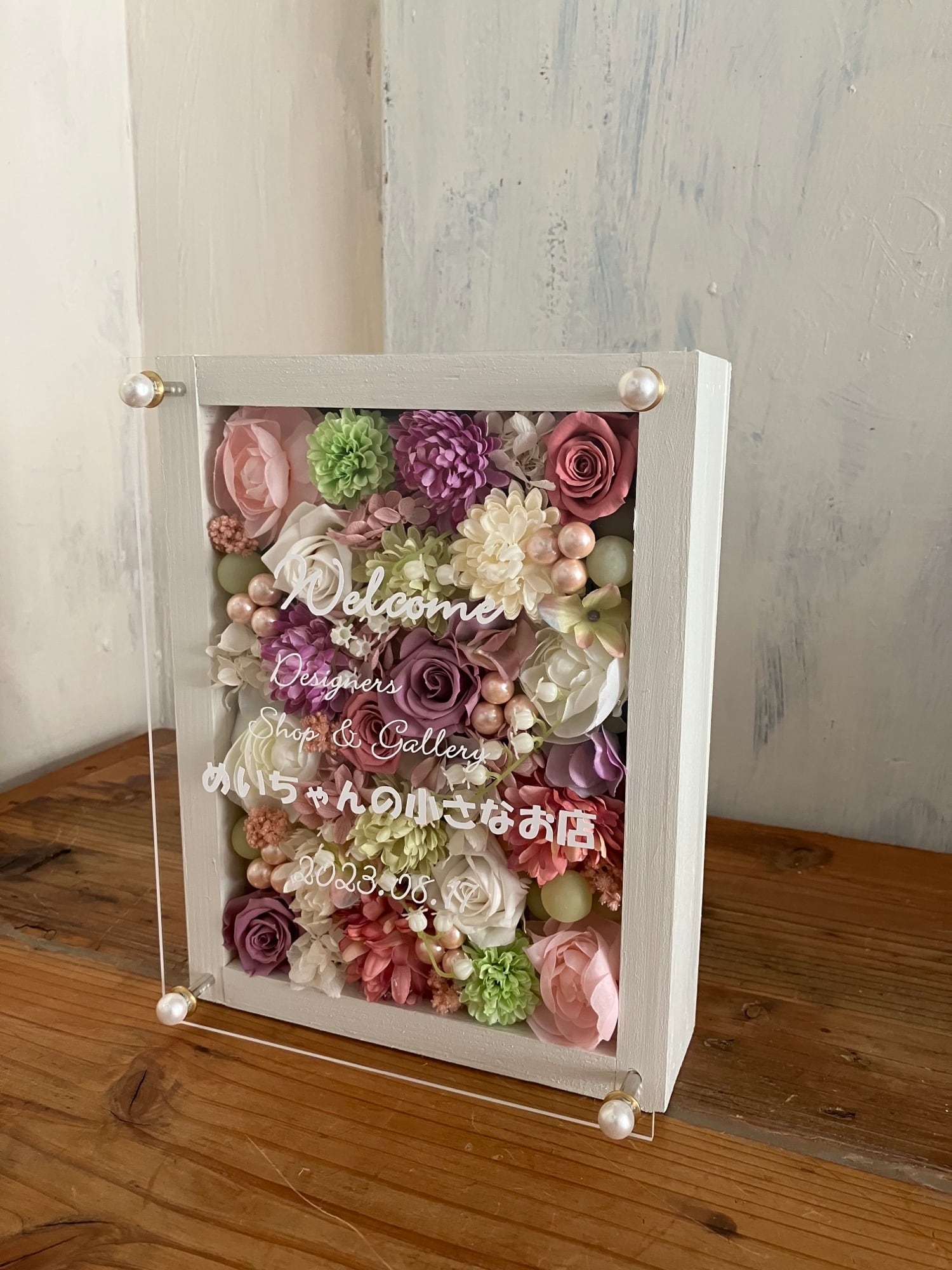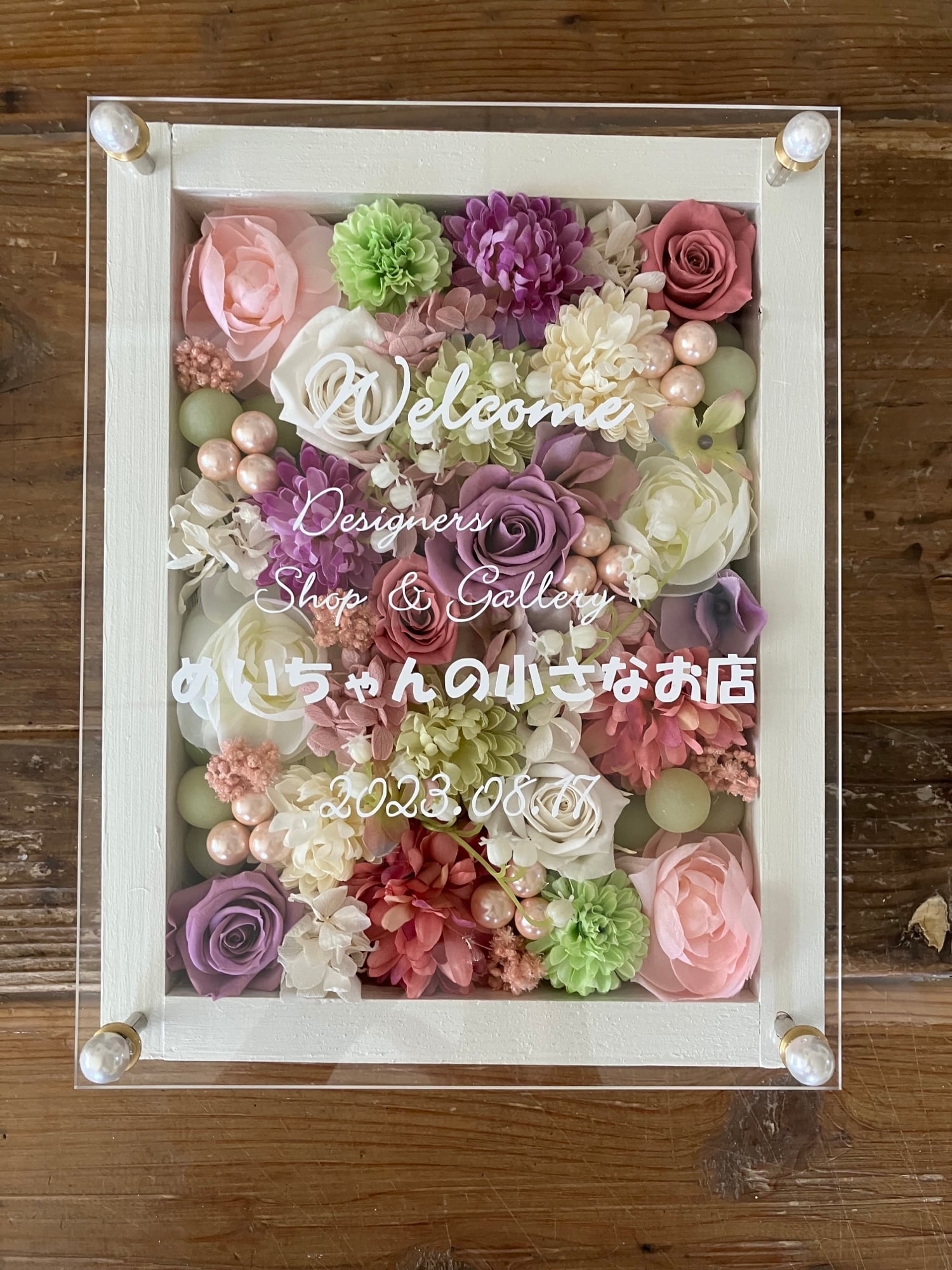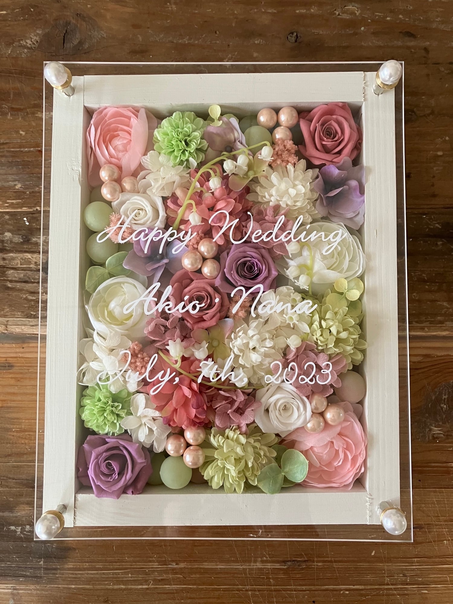 白色のウッドフレームにプリザーブドフラワーと造花をぎっしり詰め込み、アクリル板にはカッティングシートでメッセージをお入れします。
