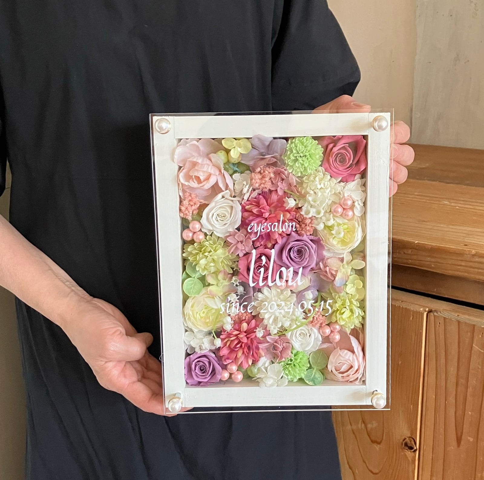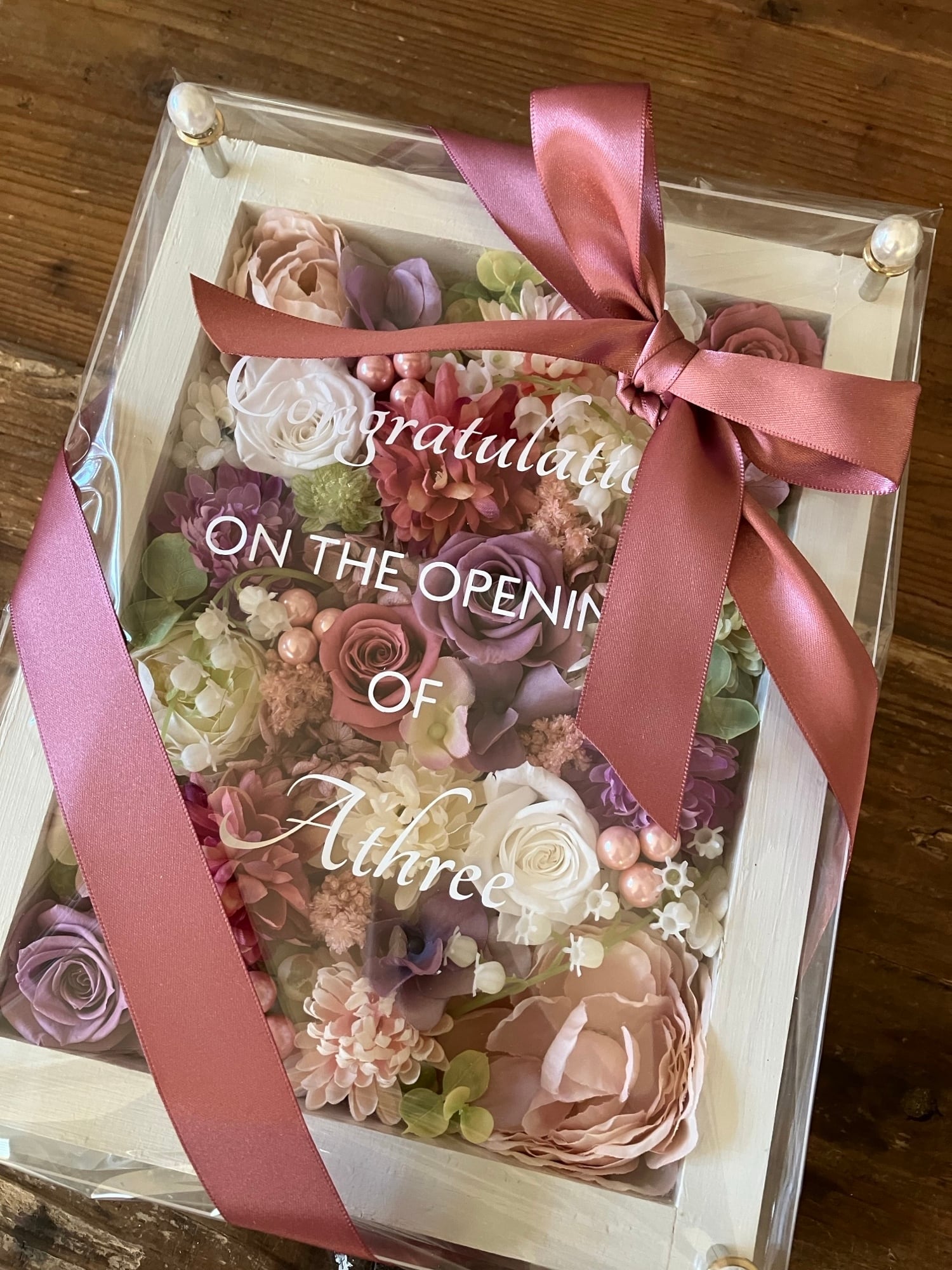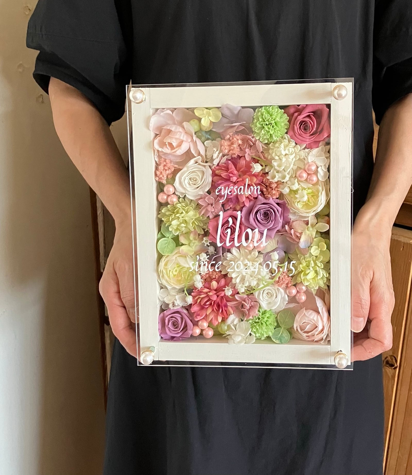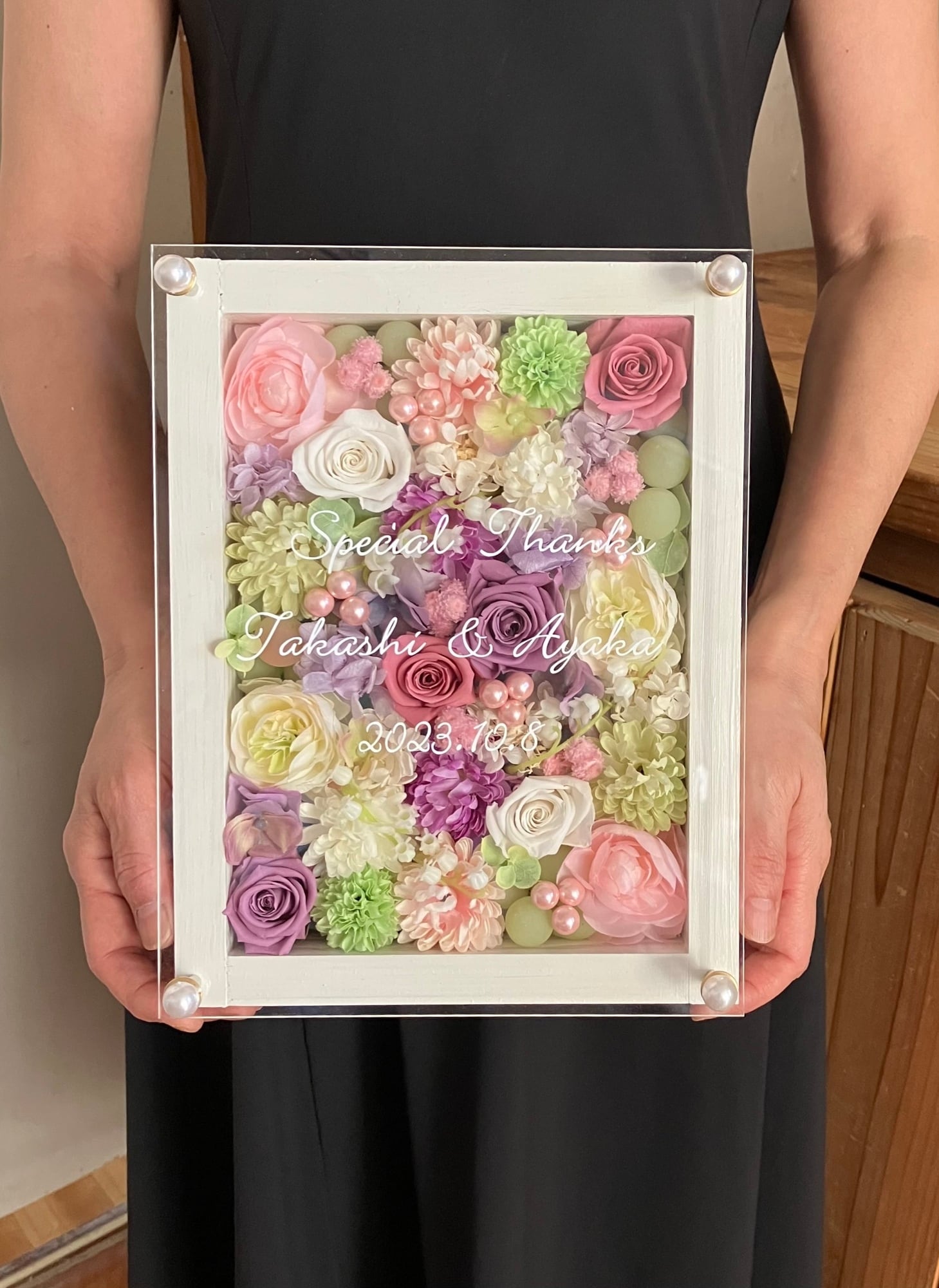 白色のウッドフレームにプリザーブドフラワーと造花をぎっしり詰め込み、アクリル板にはカッティングシートでメッセージをお入れします。