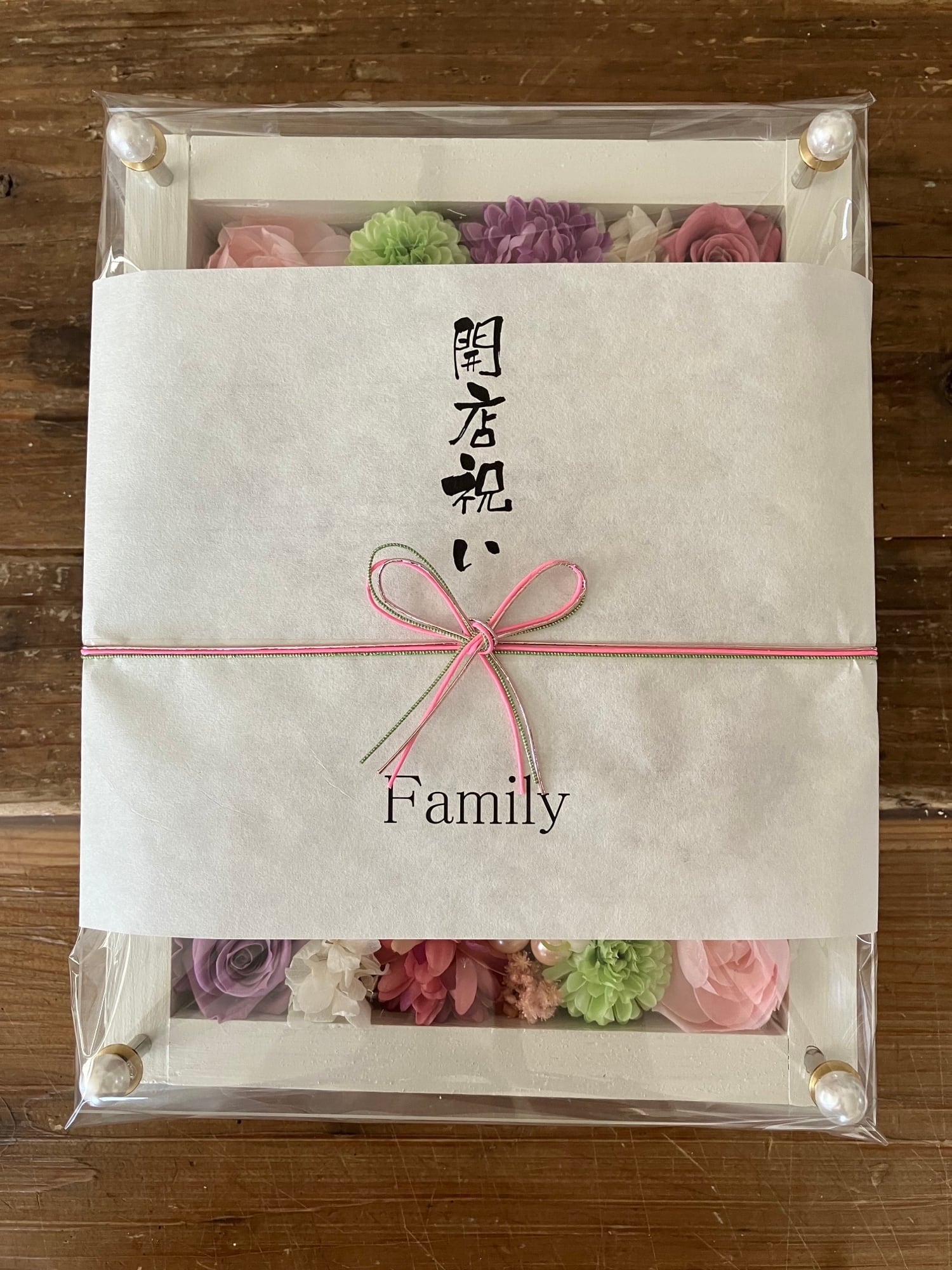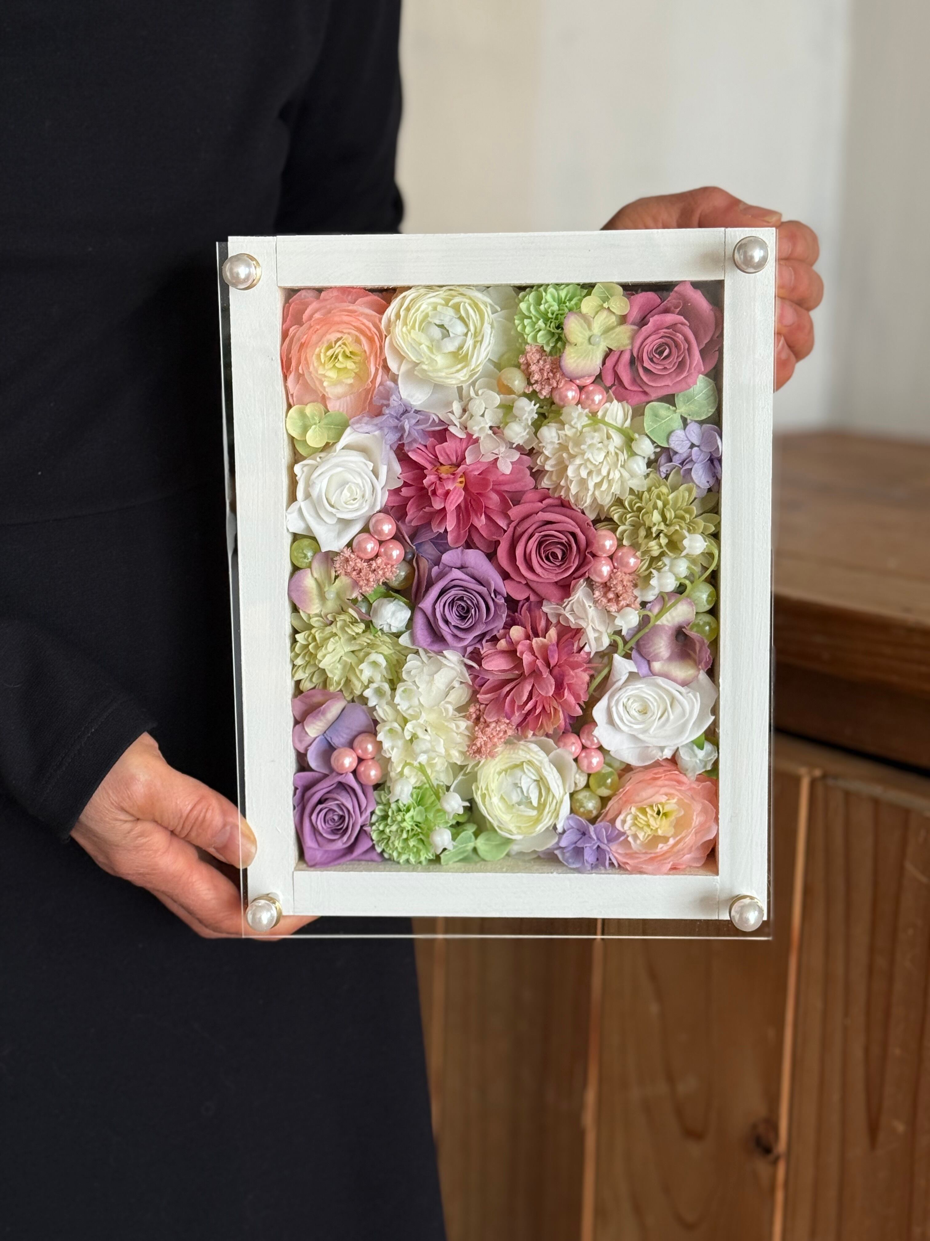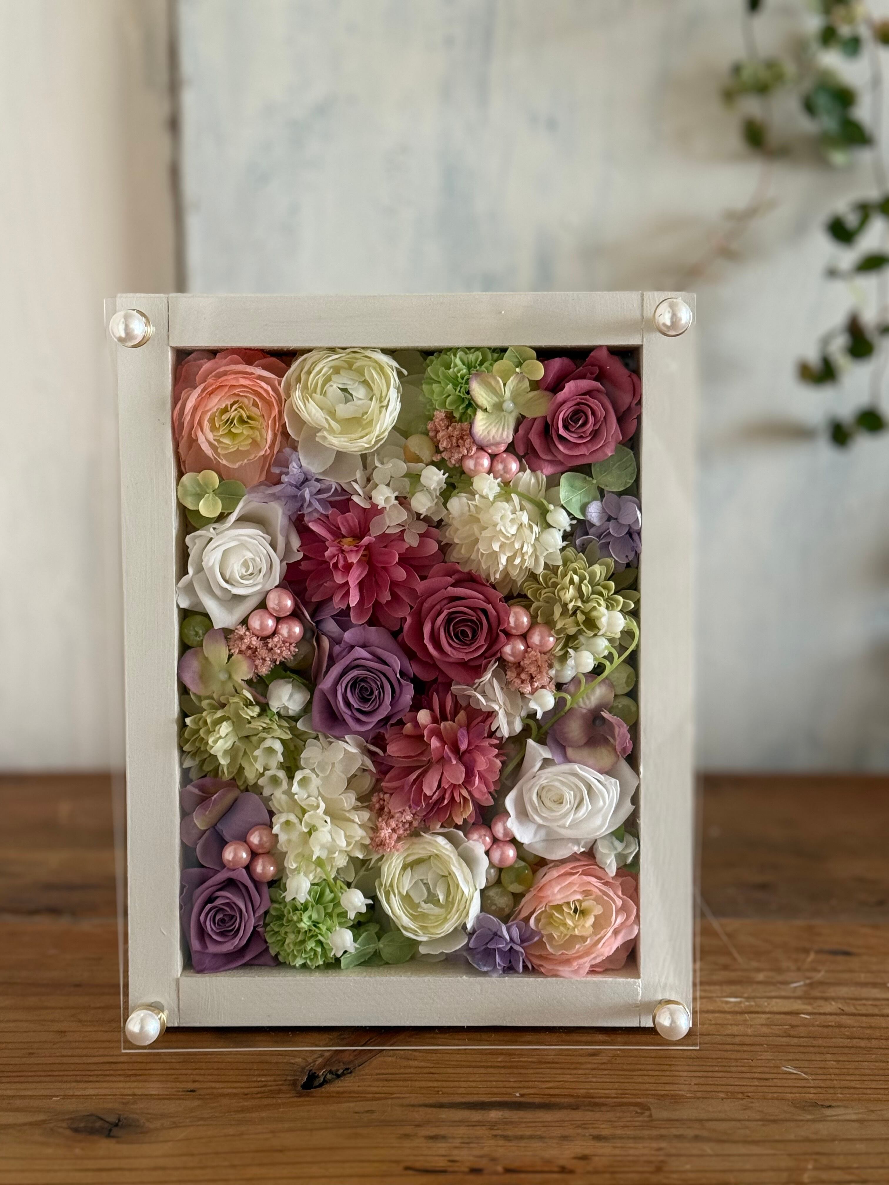結婚祝い・開店祝い・サロンオープン祝い【名入れ】プリザーブドフラワーアレンジ ウッドフレーム 白木枠〈白ピンクパープルグリーン〉