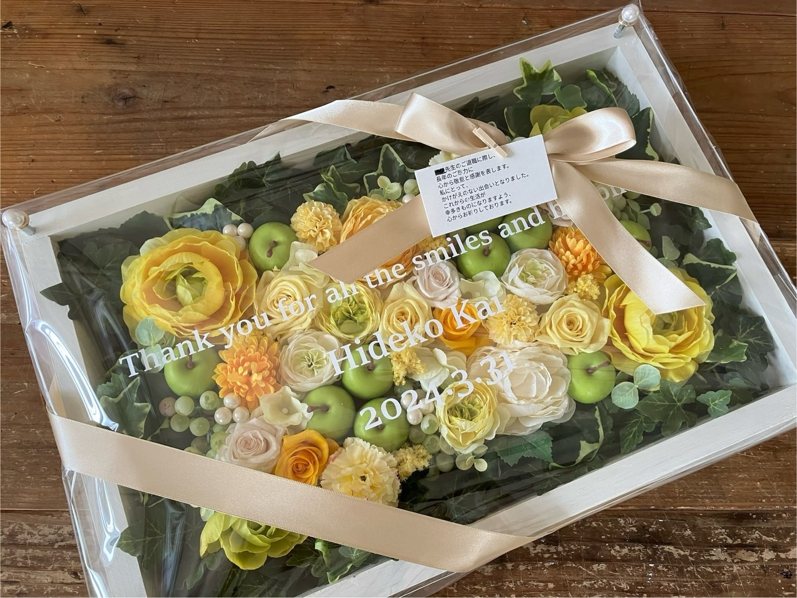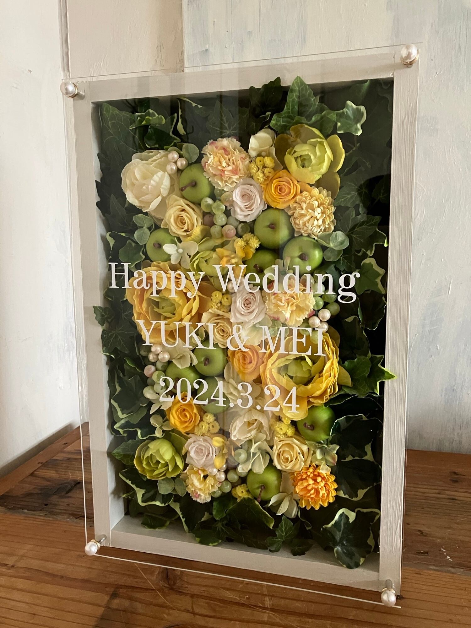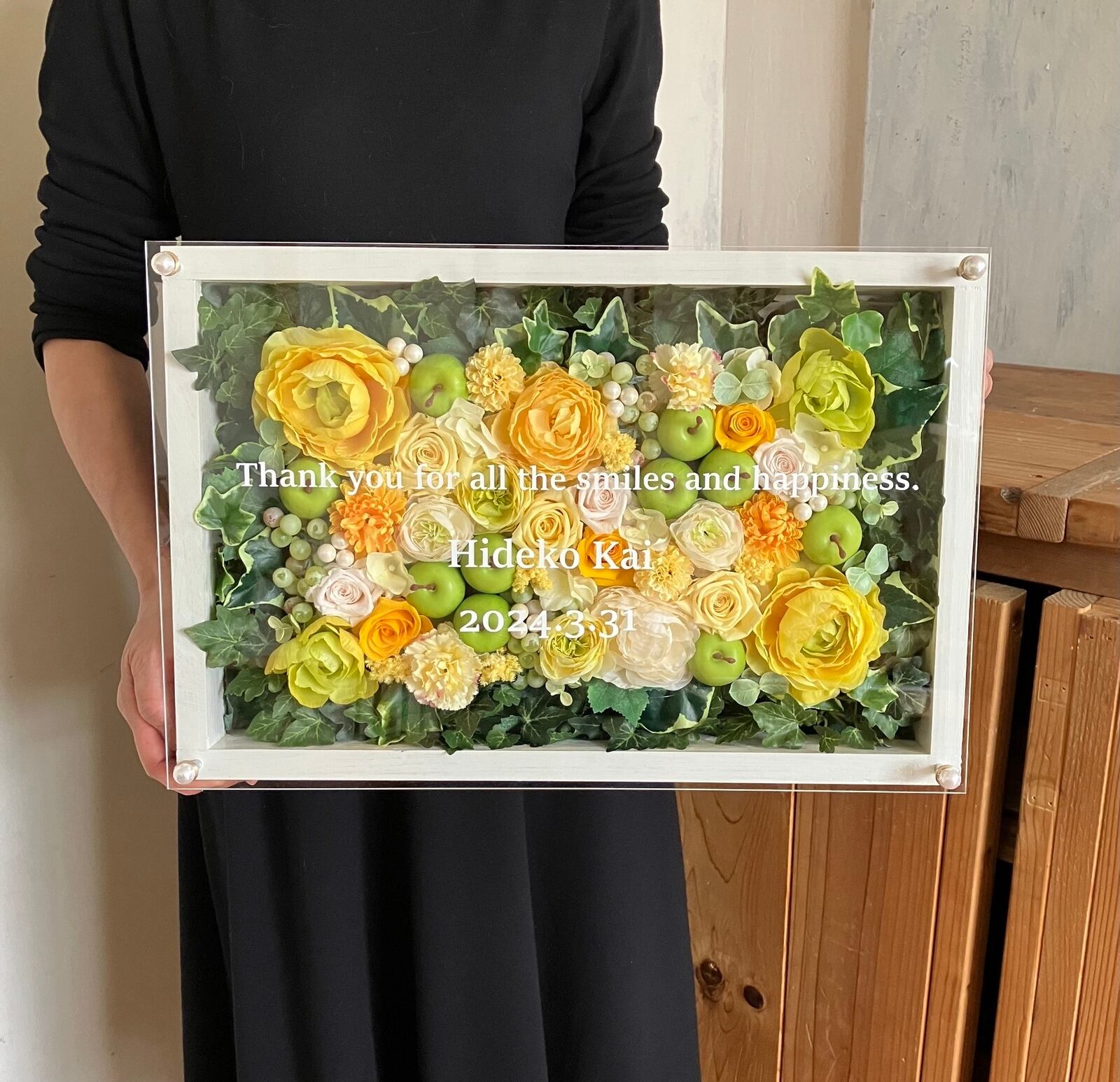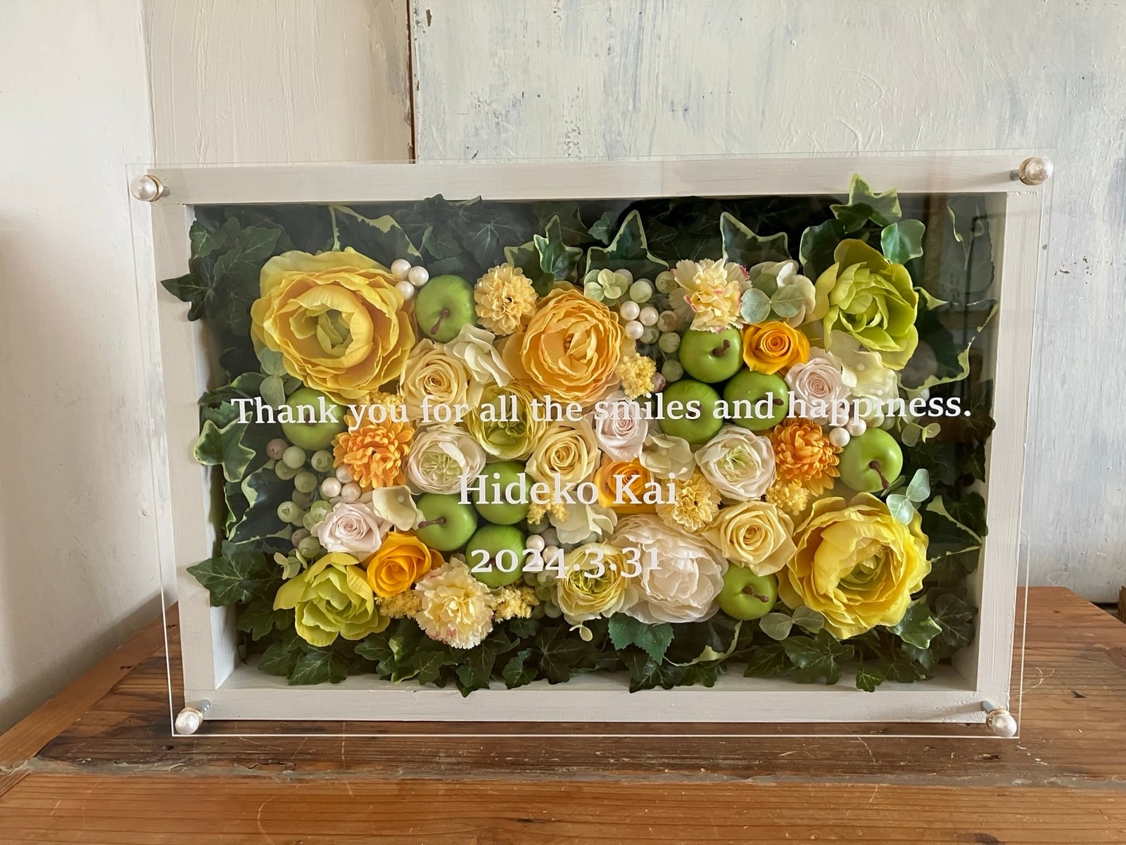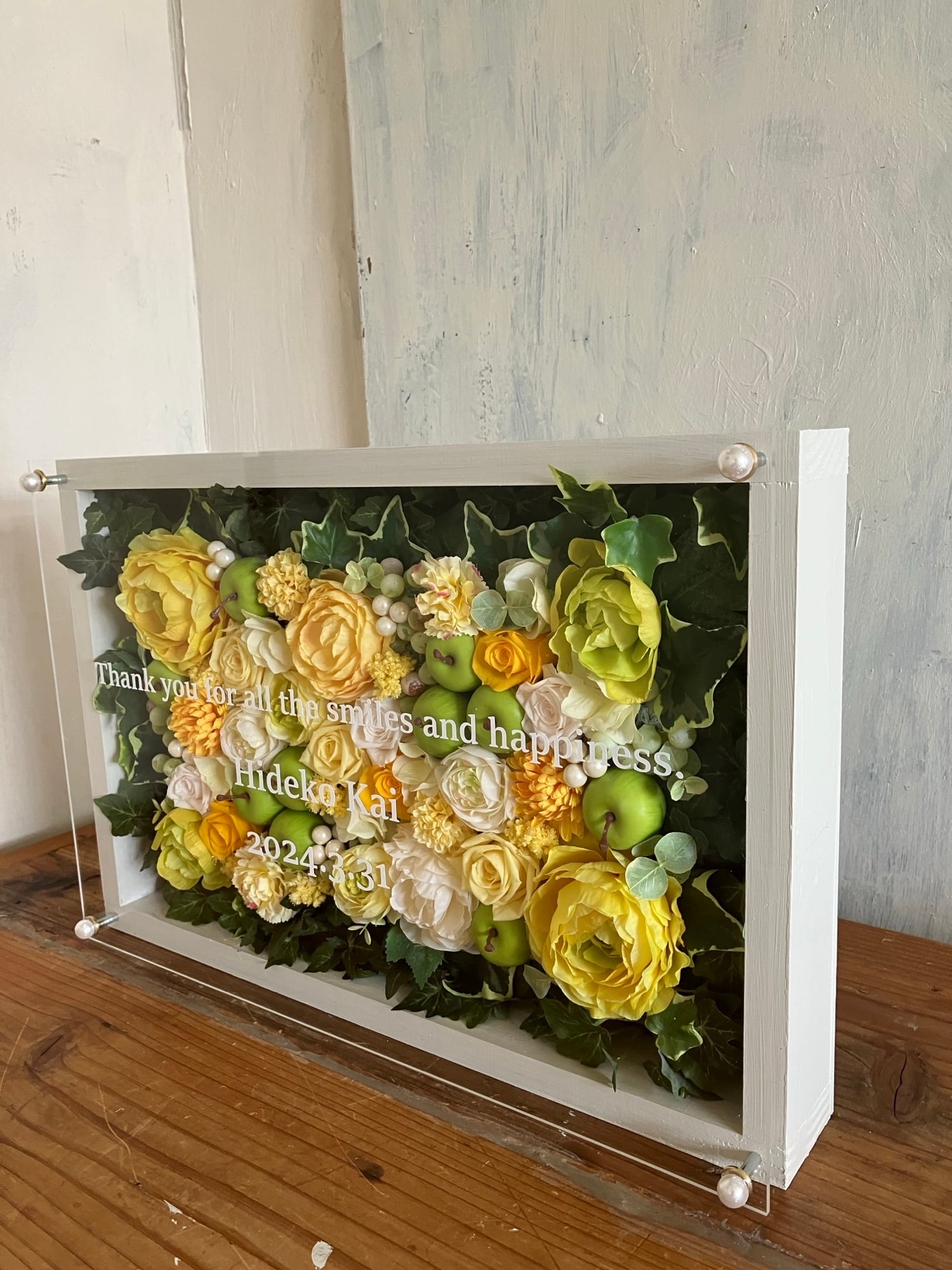ウッドフレームにプリザーブドフラワーと造花をぎっしり詰め込み、アクリル板にはカッティングシートでメッセージをお入れします。