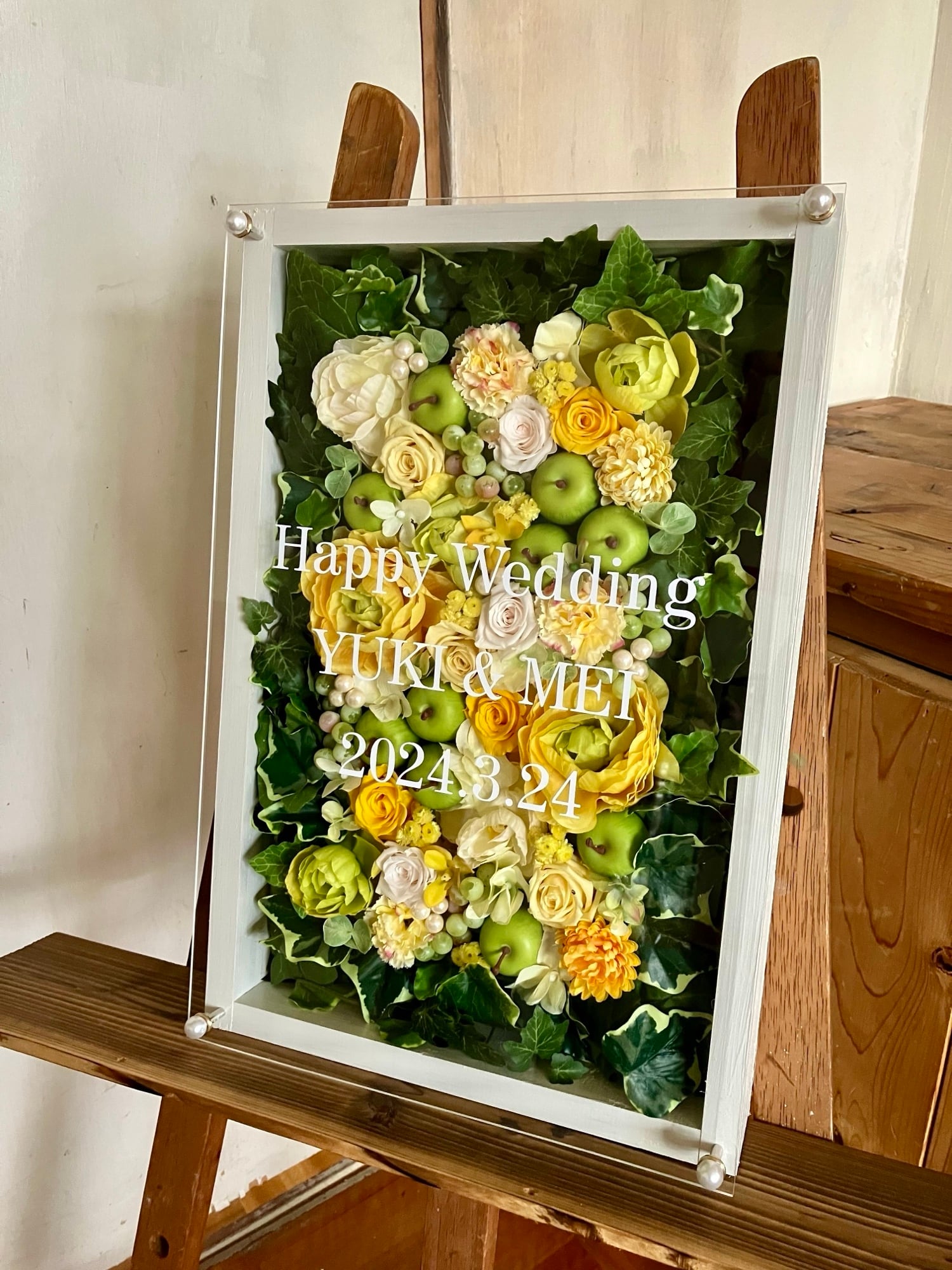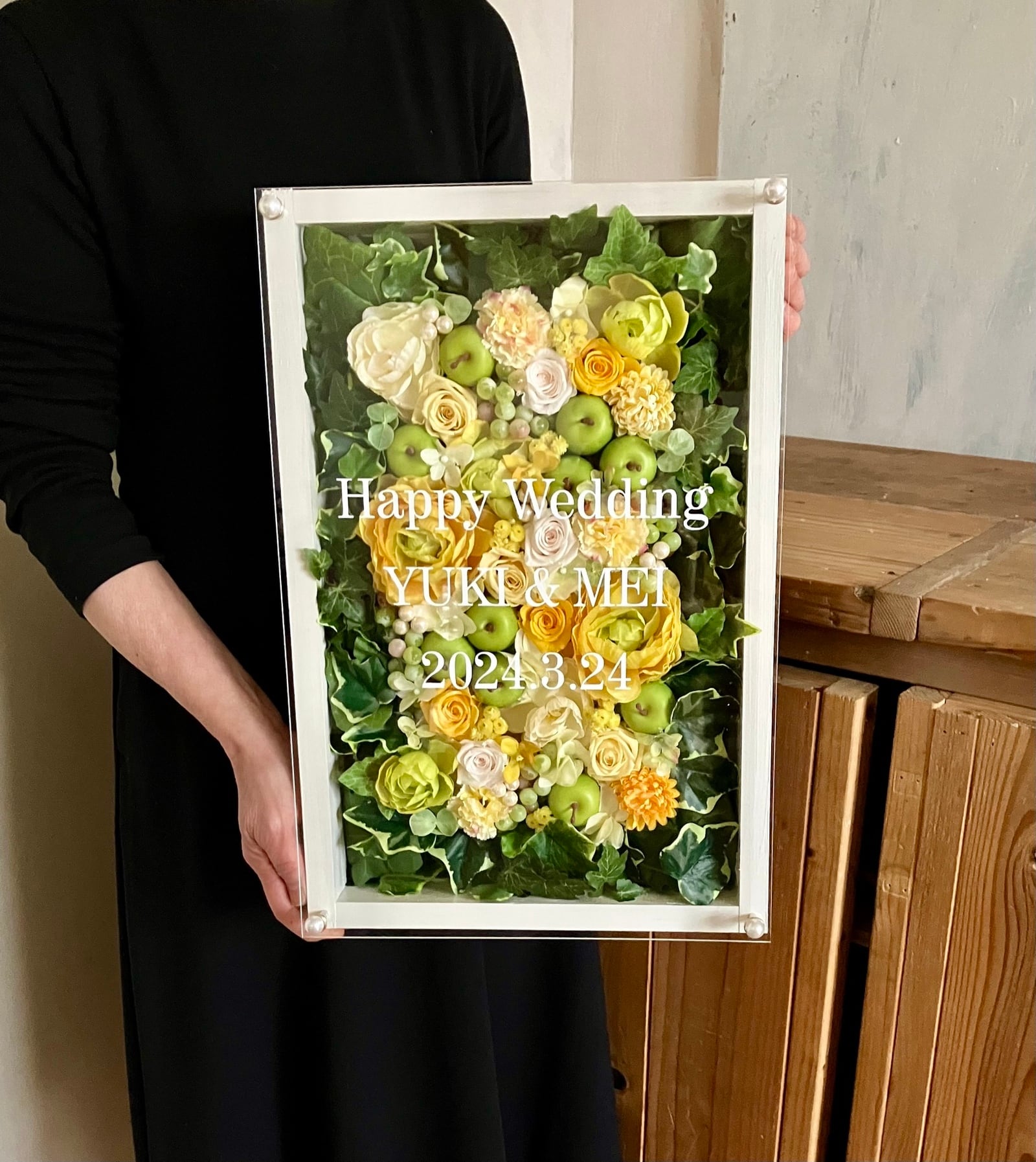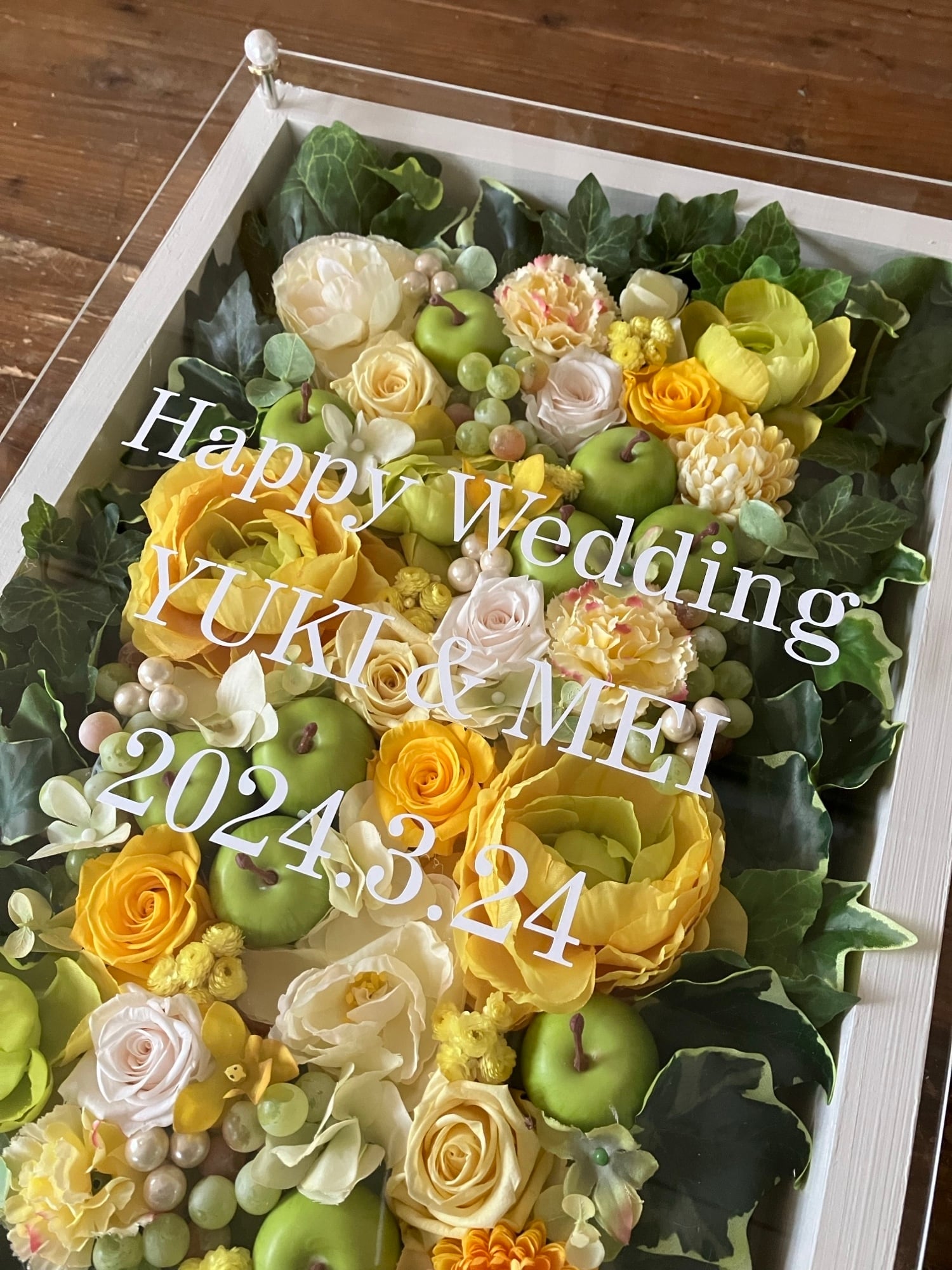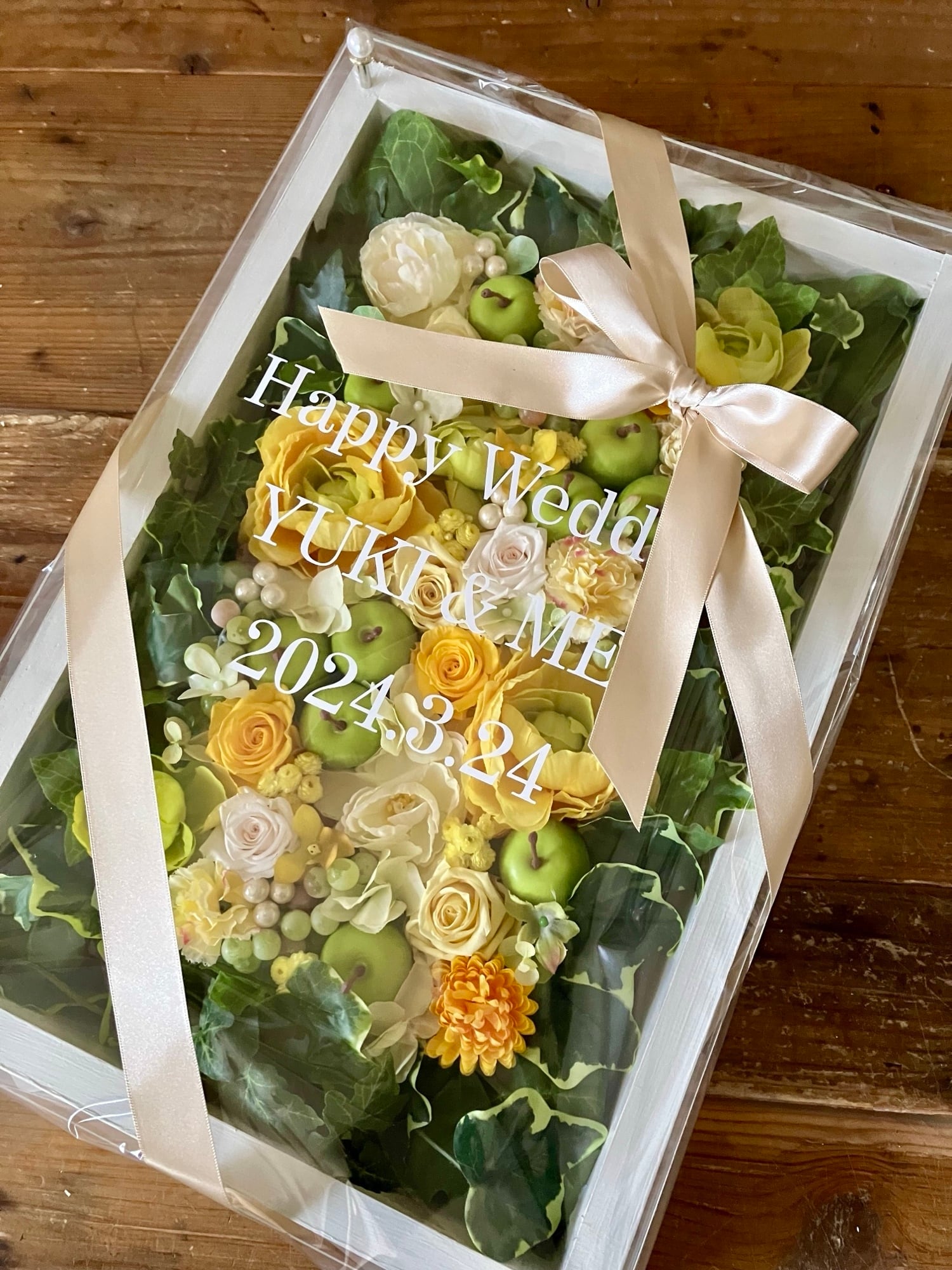 結婚祝い・退職祝い・ウェルカムボード【名入れ】プリザーブドフラワーアレンジ ウッドフレーム・大きい白木枠 アイビー〈イエロー〉