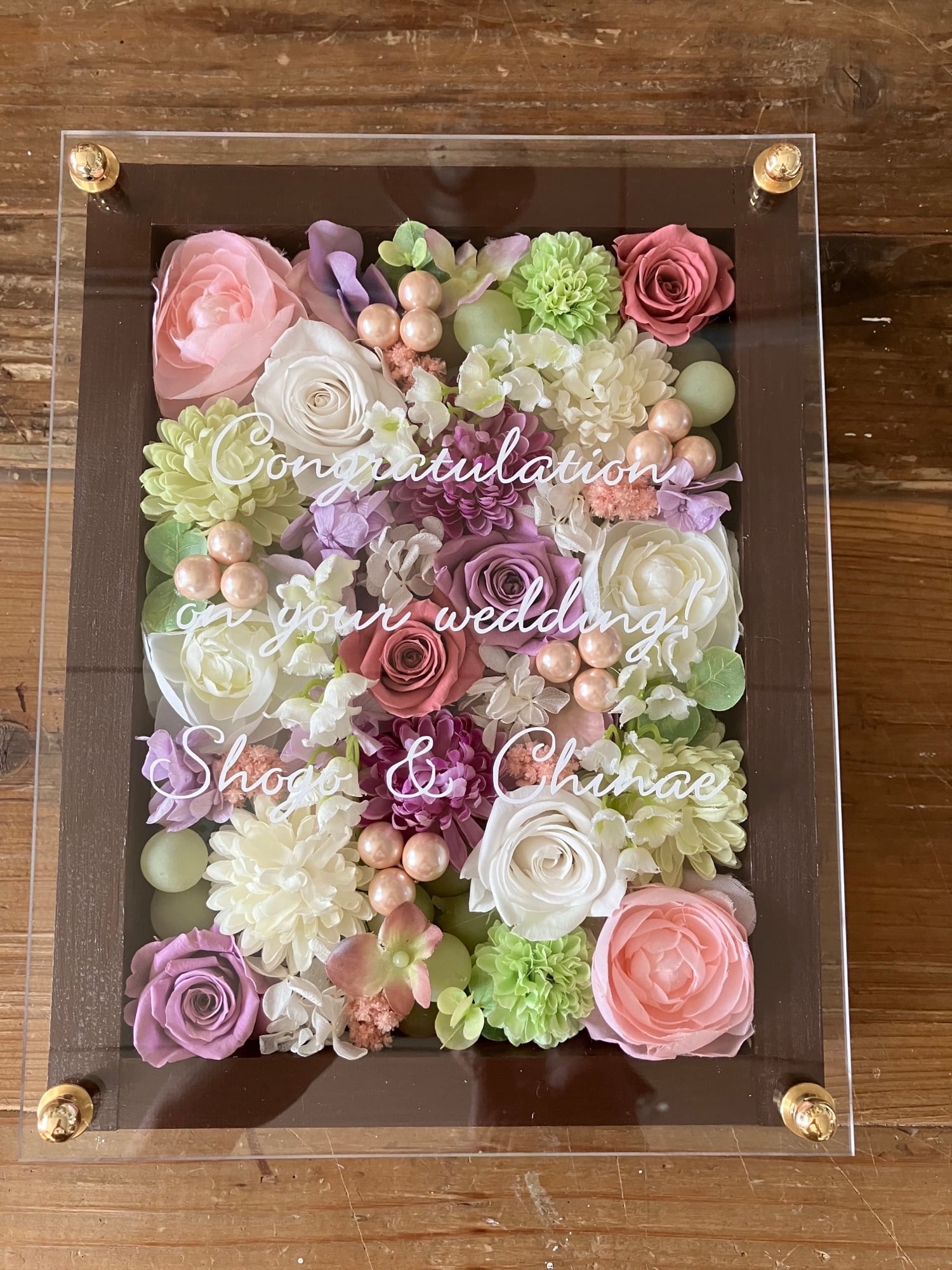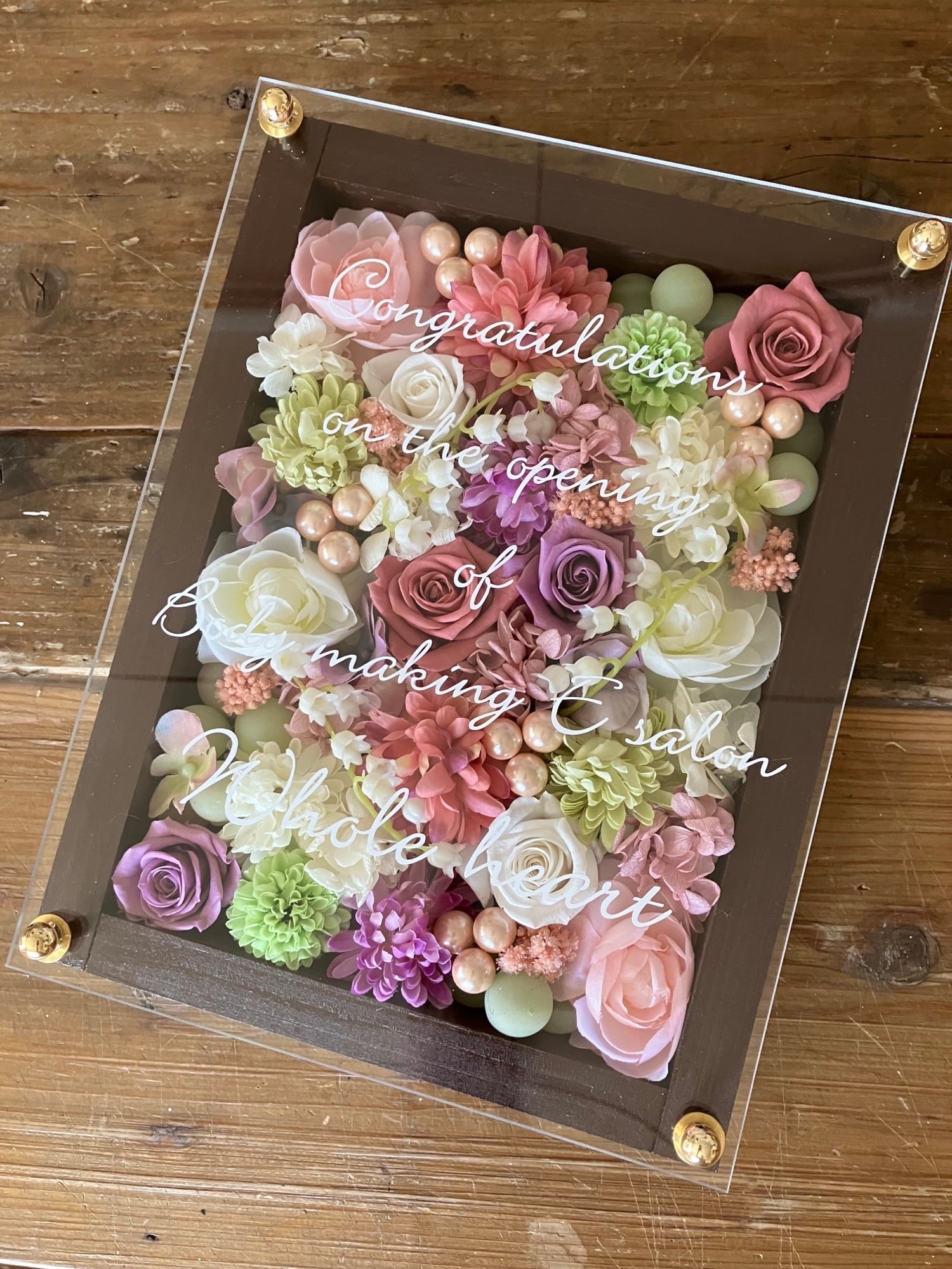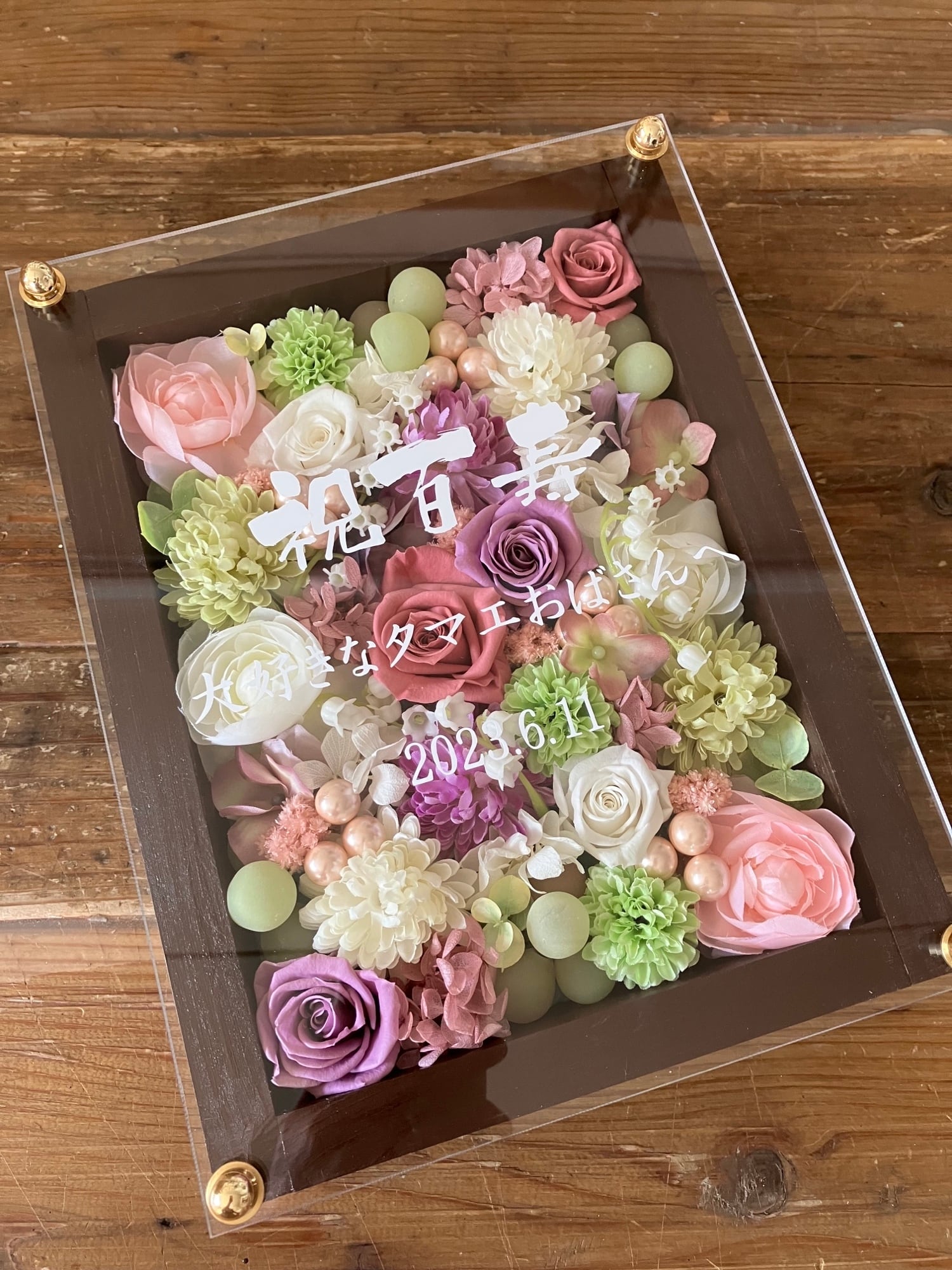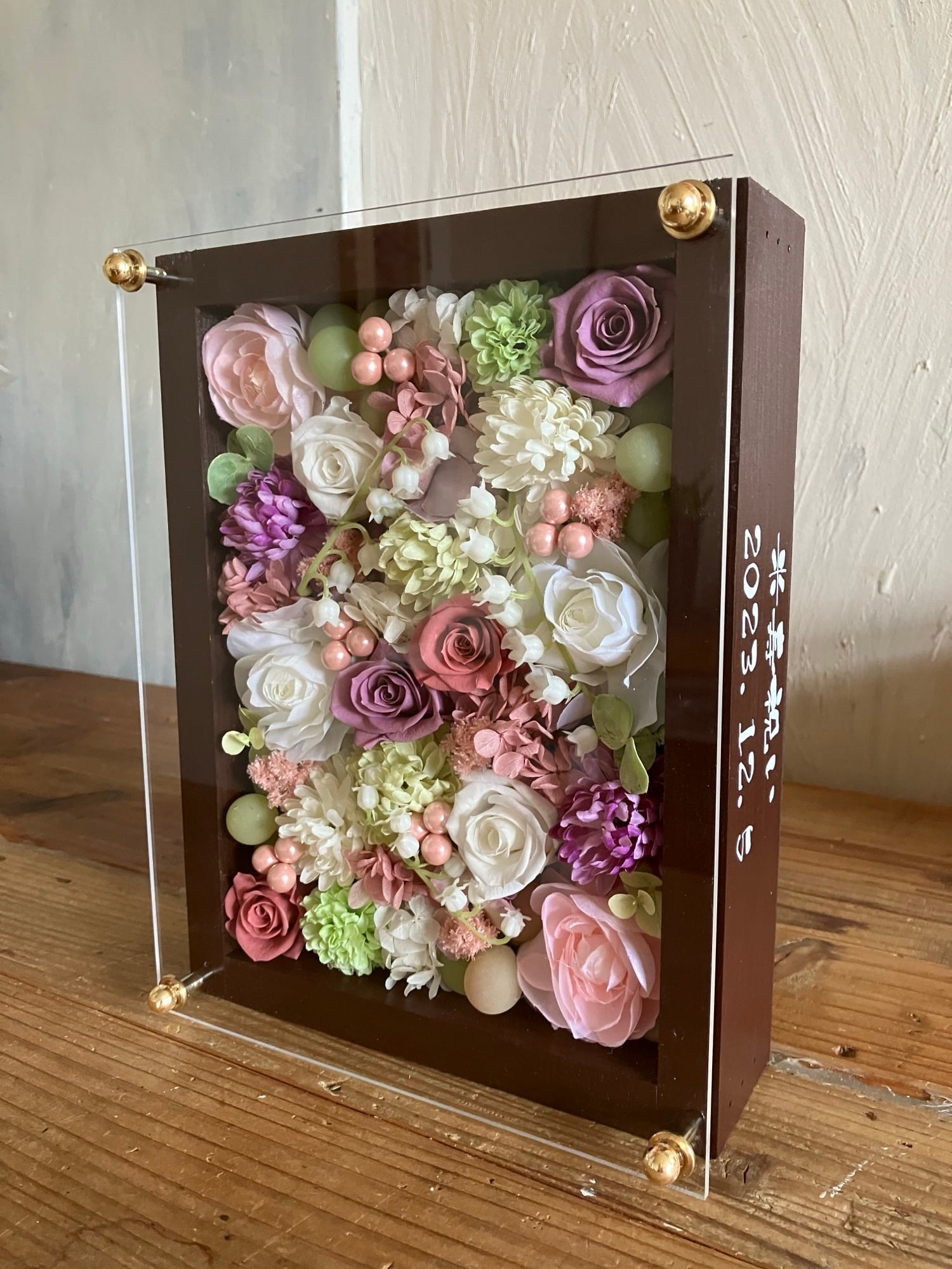 白色のウッドフレームにプリザーブドフラワーと造花をぎっしり詰め込み、アクリル板にはカッティングシートでメッセージをお入れします。