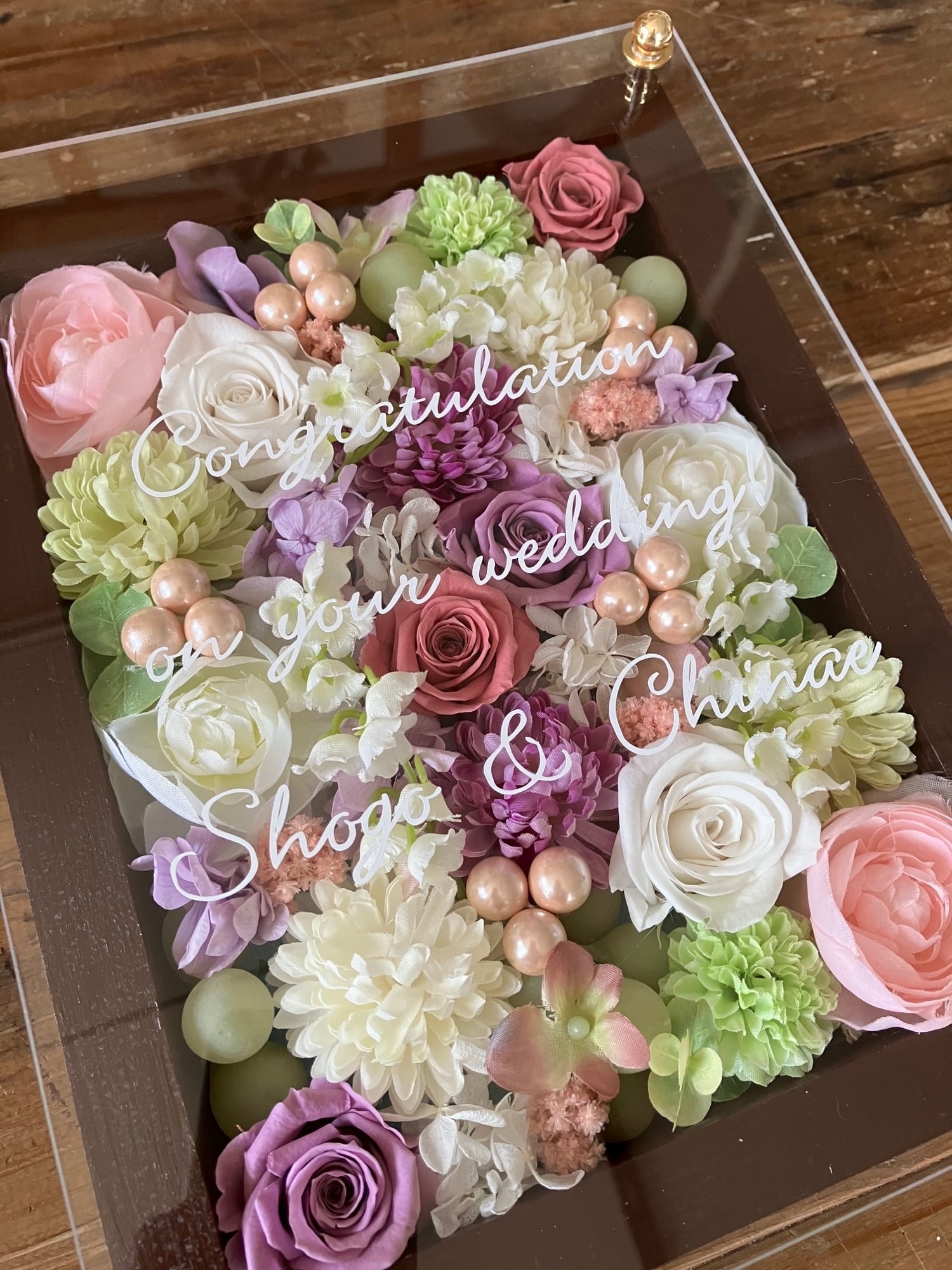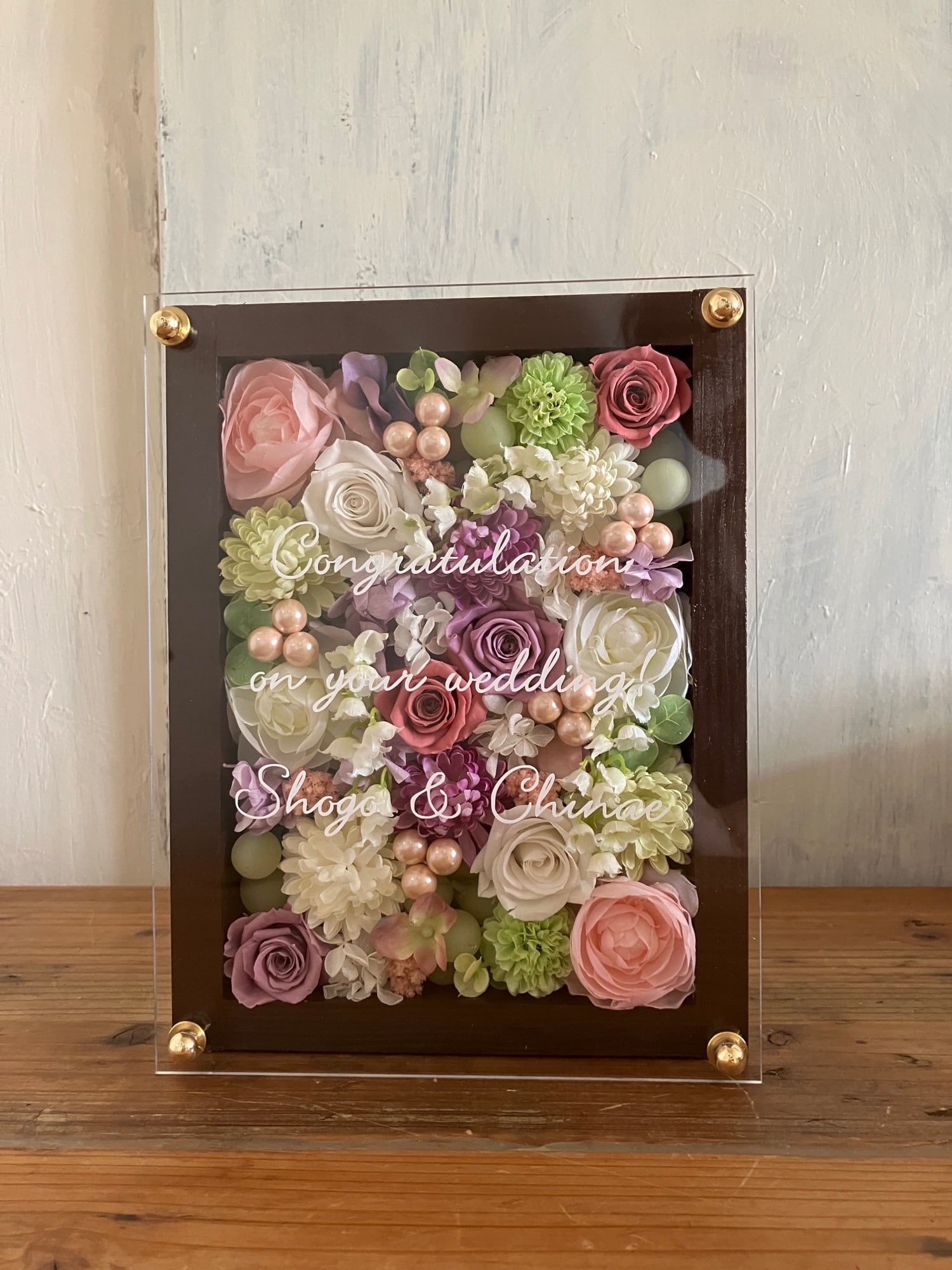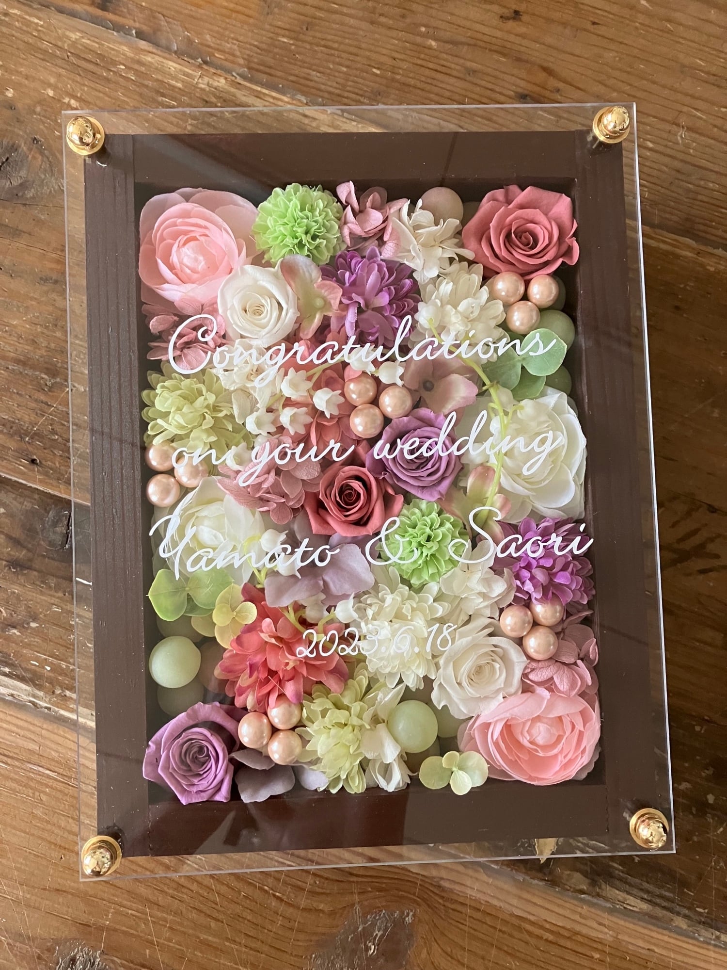 白色のウッドフレームにプリザーブドフラワーと造花をぎっしり詰め込み、アクリル板にはカッティングシートでメッセージをお入れします。