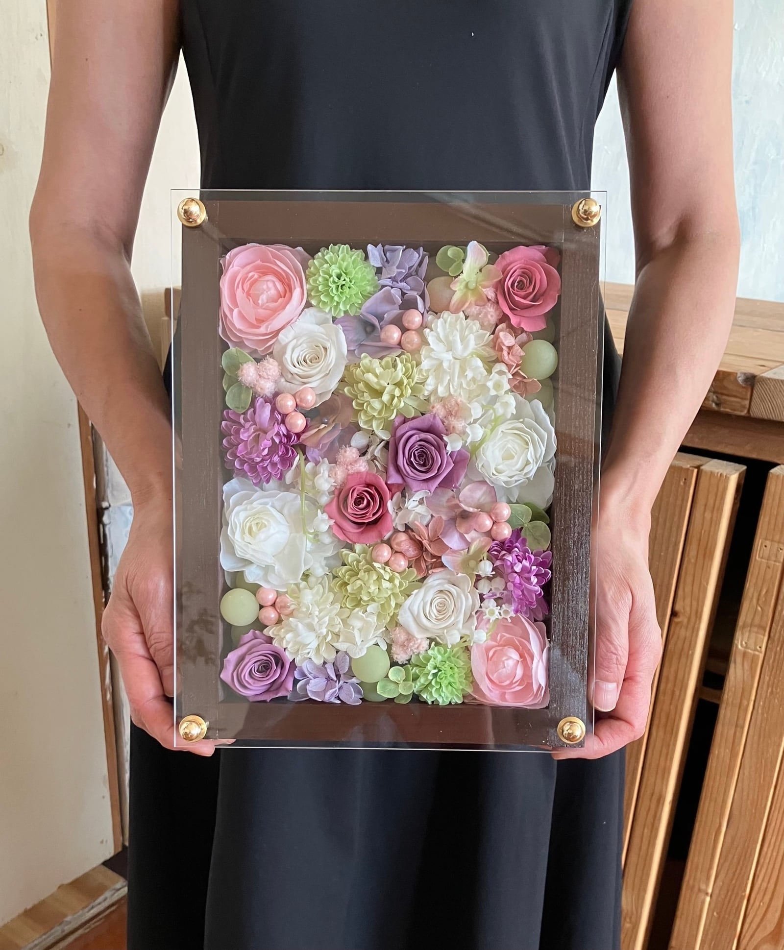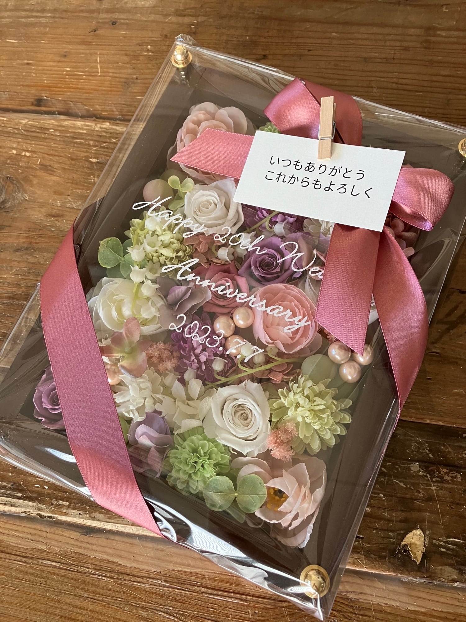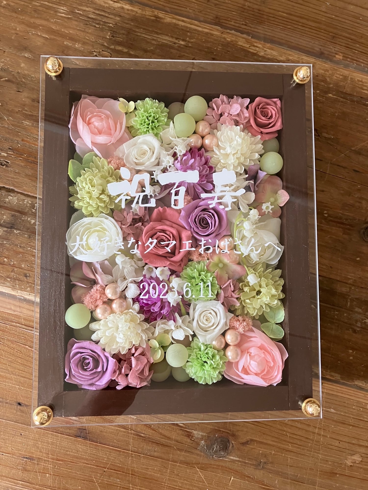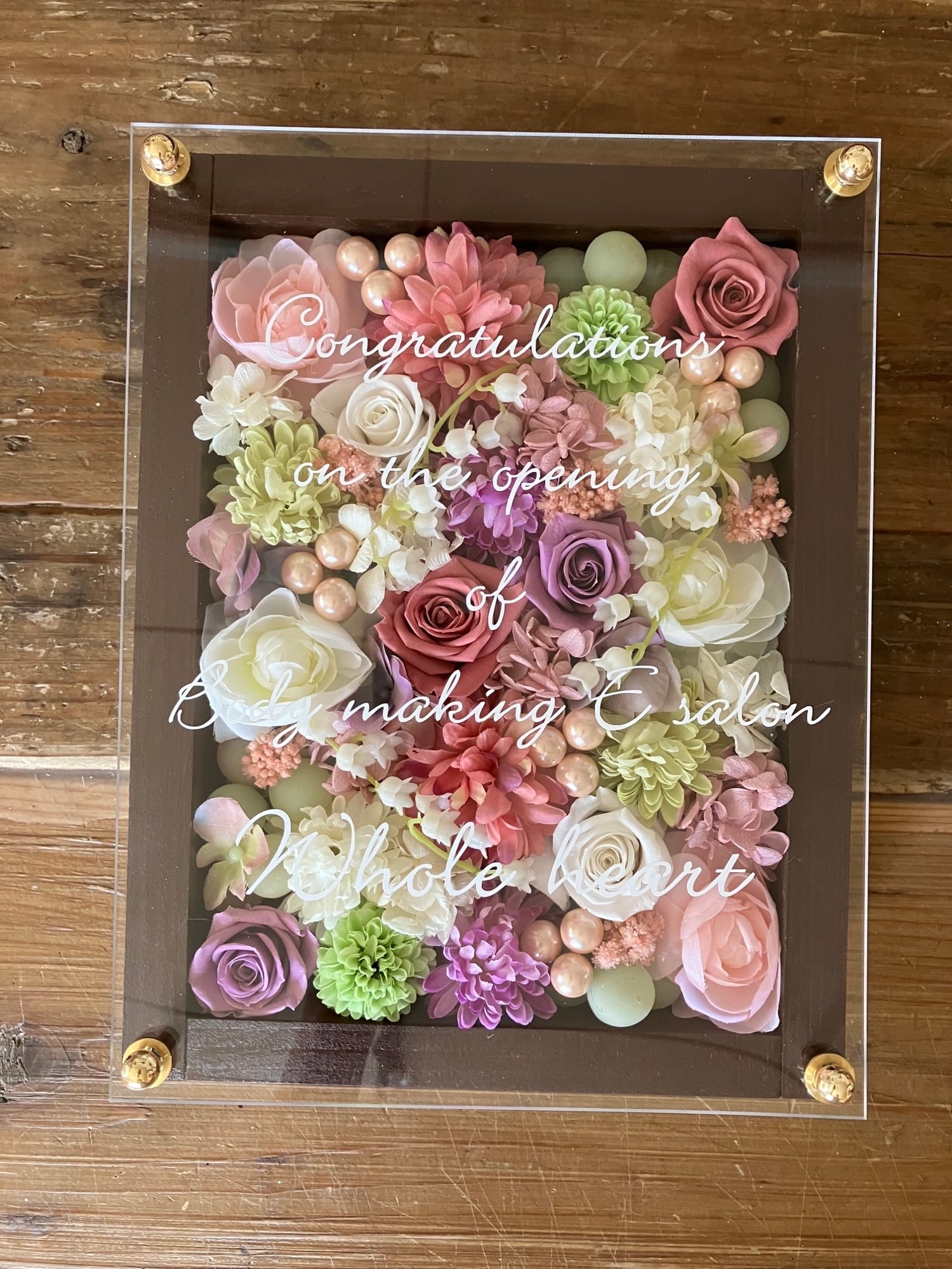 白色のウッドフレームにプリザーブドフラワーと造花をぎっしり詰め込み、アクリル板にはカッティングシートでメッセージをお入れします。