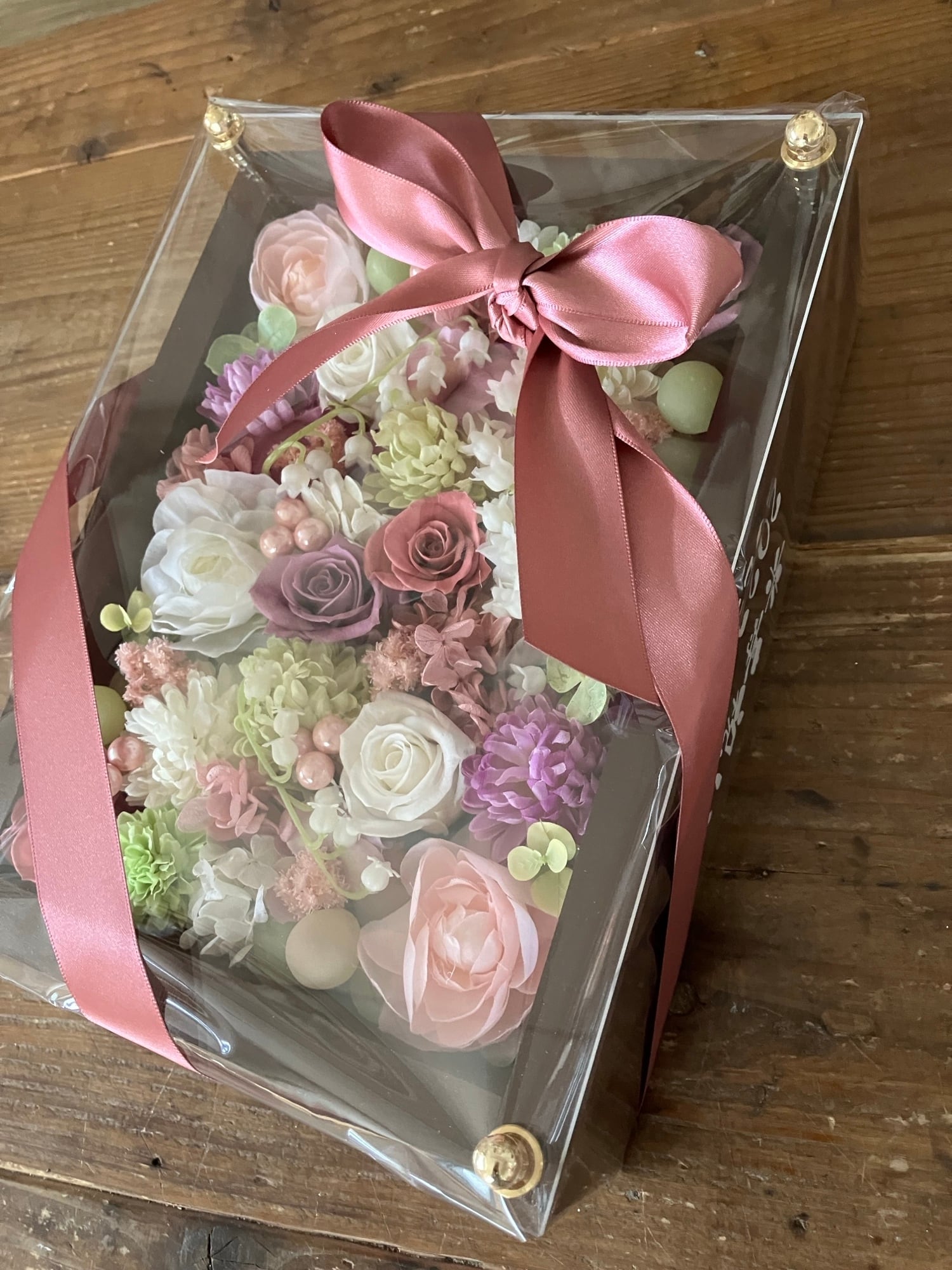 お花のギフト|プリザーブドフラワーアレンジ 茶木枠〈パープル・ピンク・白・グリーン〉名入れ可/結婚・退職・開店祝いに