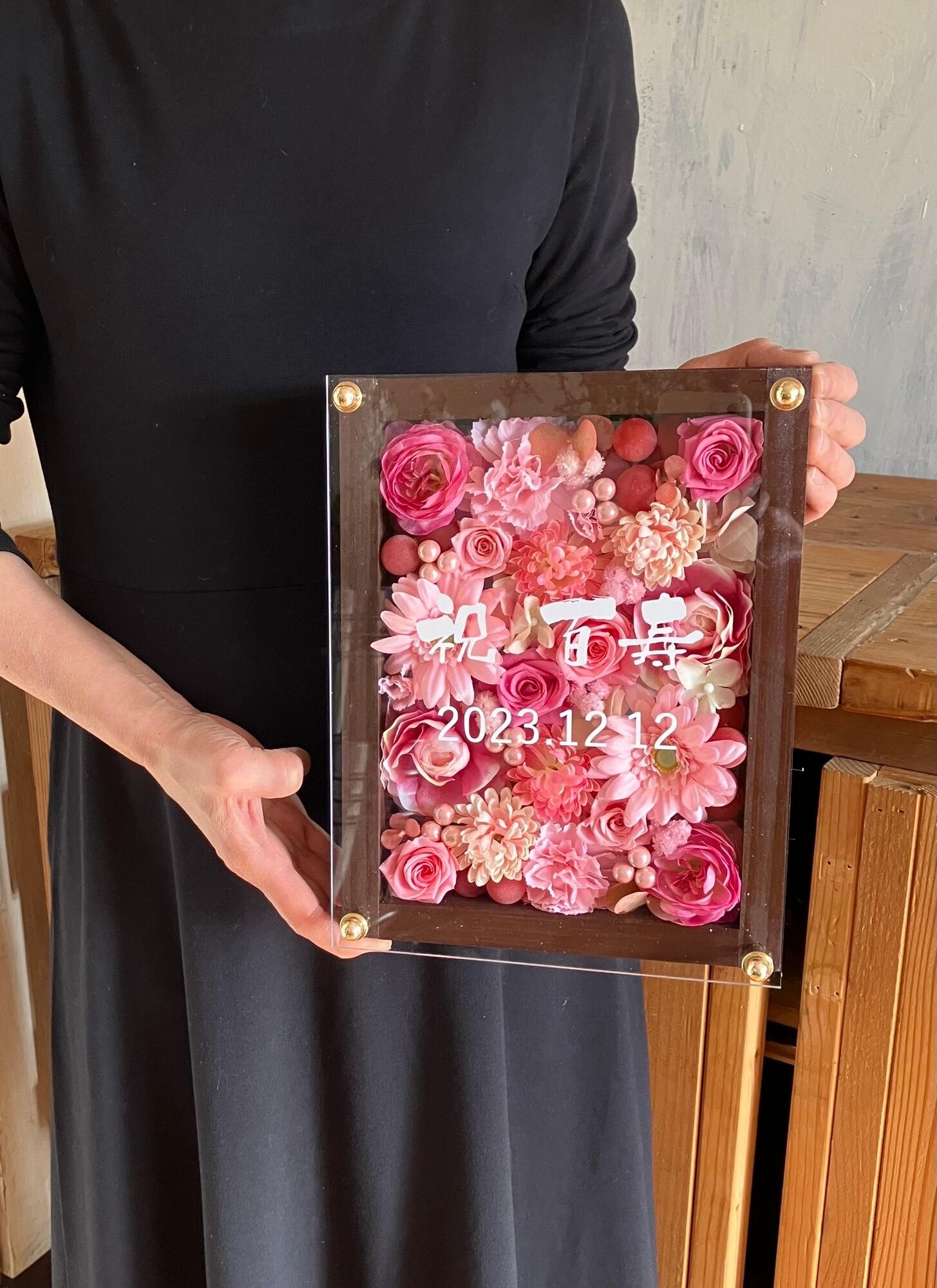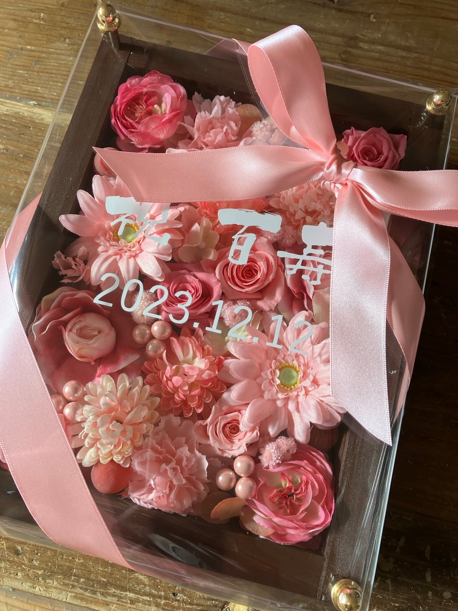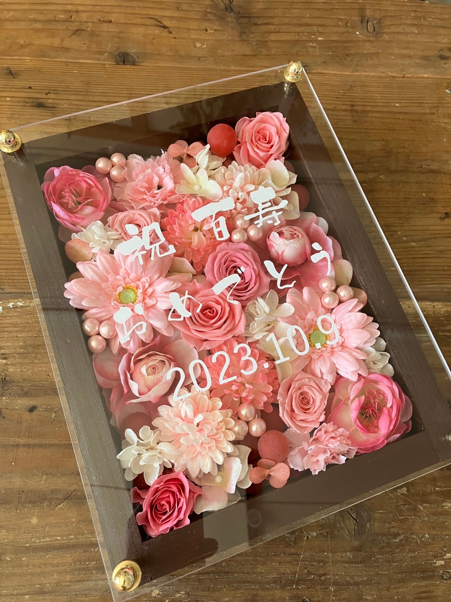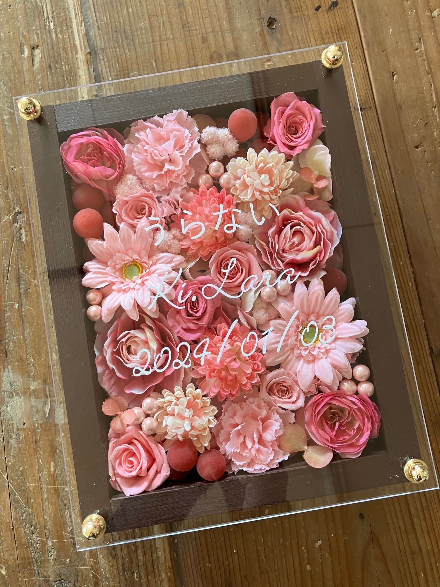 茶色のウッドフレームにプリザーブドフラワーと造花をぎっしり詰め込み、アクリル板にはカッティングシートでメッセージをお入れします。