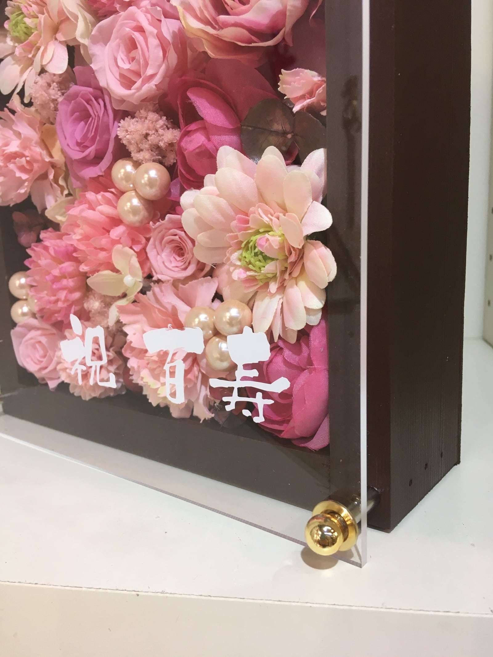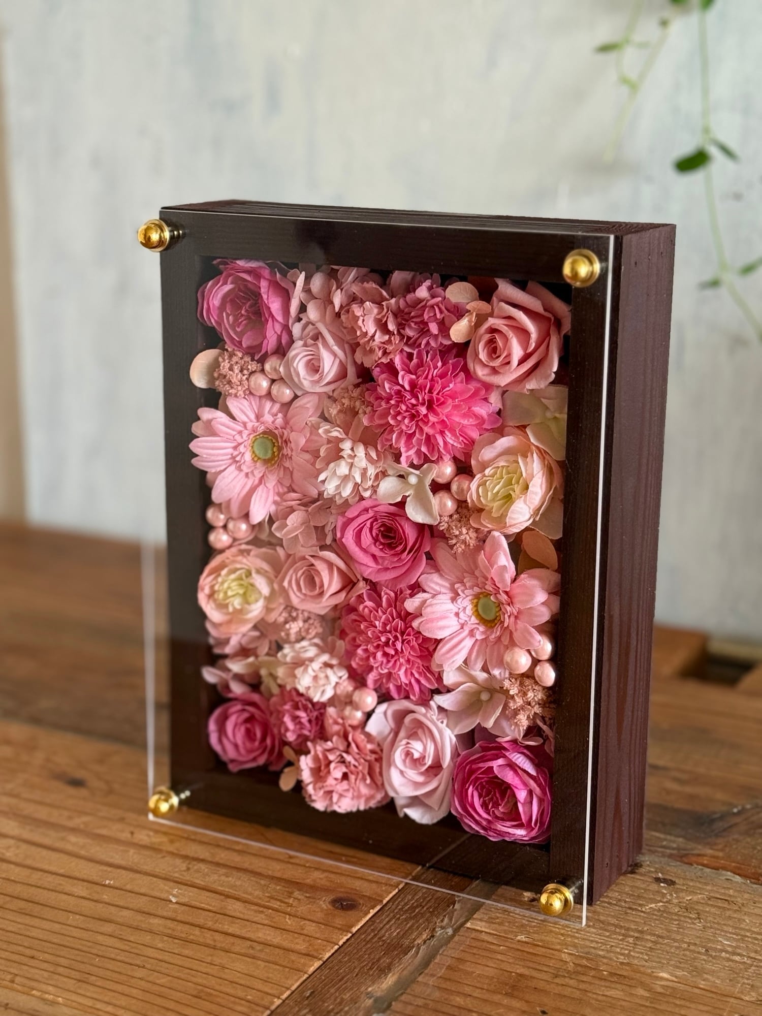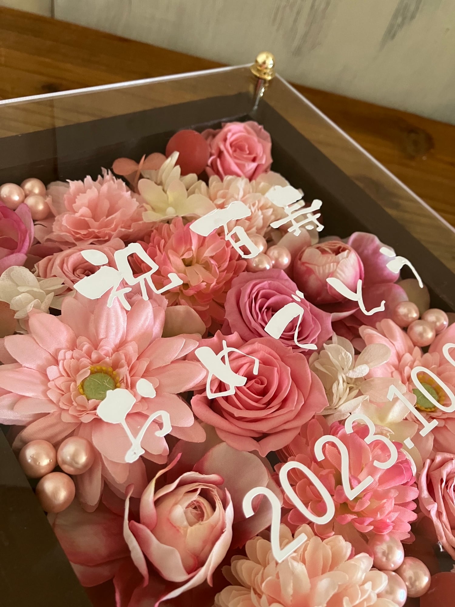 茶色のウッドフレームにプリザーブドフラワーと造花をぎっしり詰め込み、アクリル板にはカッティングシートでメッセージをお入れします。
