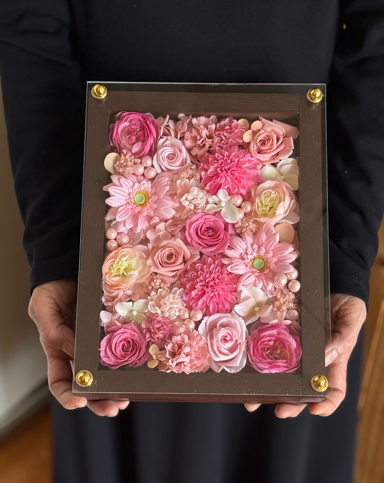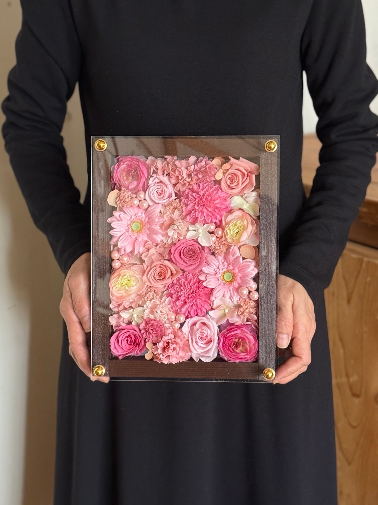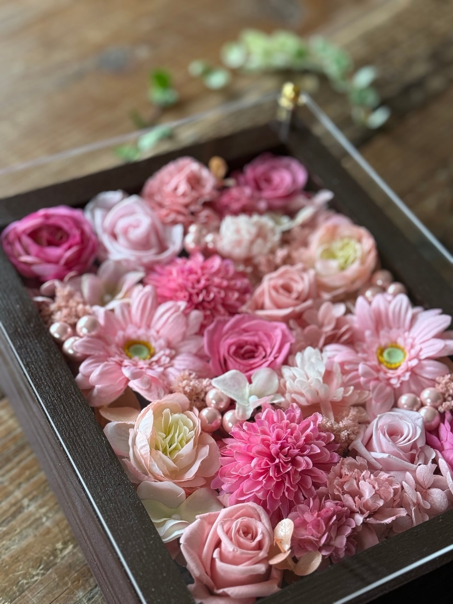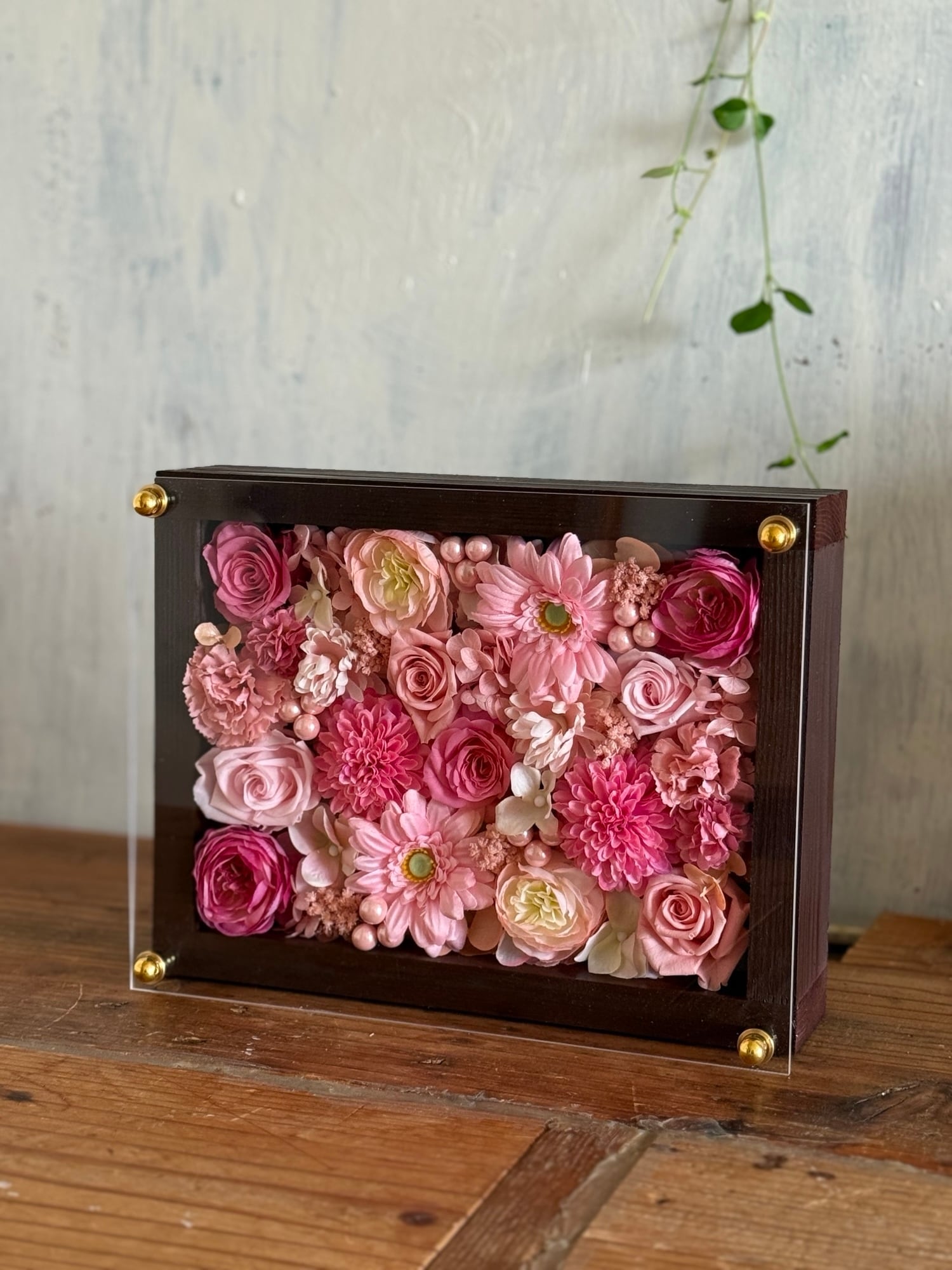 茶色のウッドフレームにプリザーブドフラワーと造花をぎっしり詰め込み、アクリル板にはカッティングシートでメッセージをお入れします。
