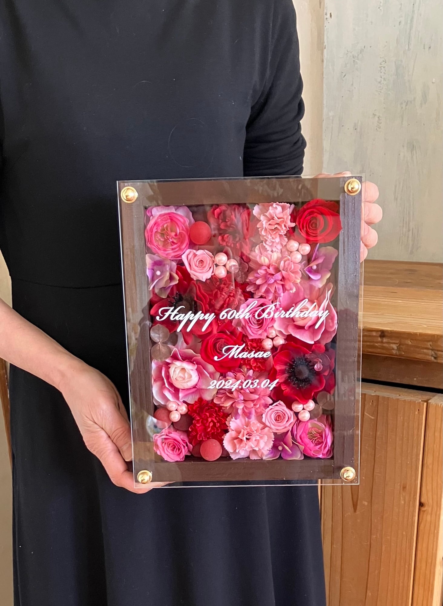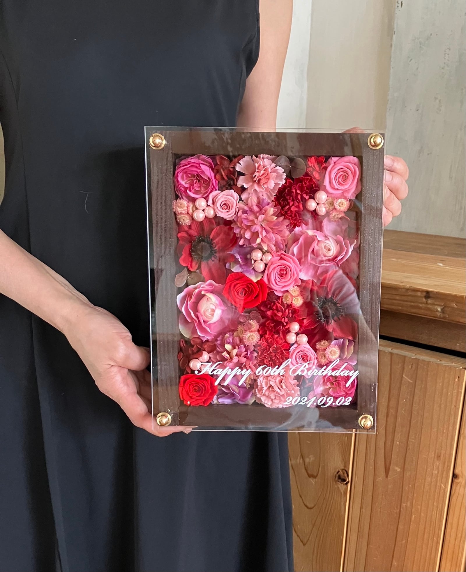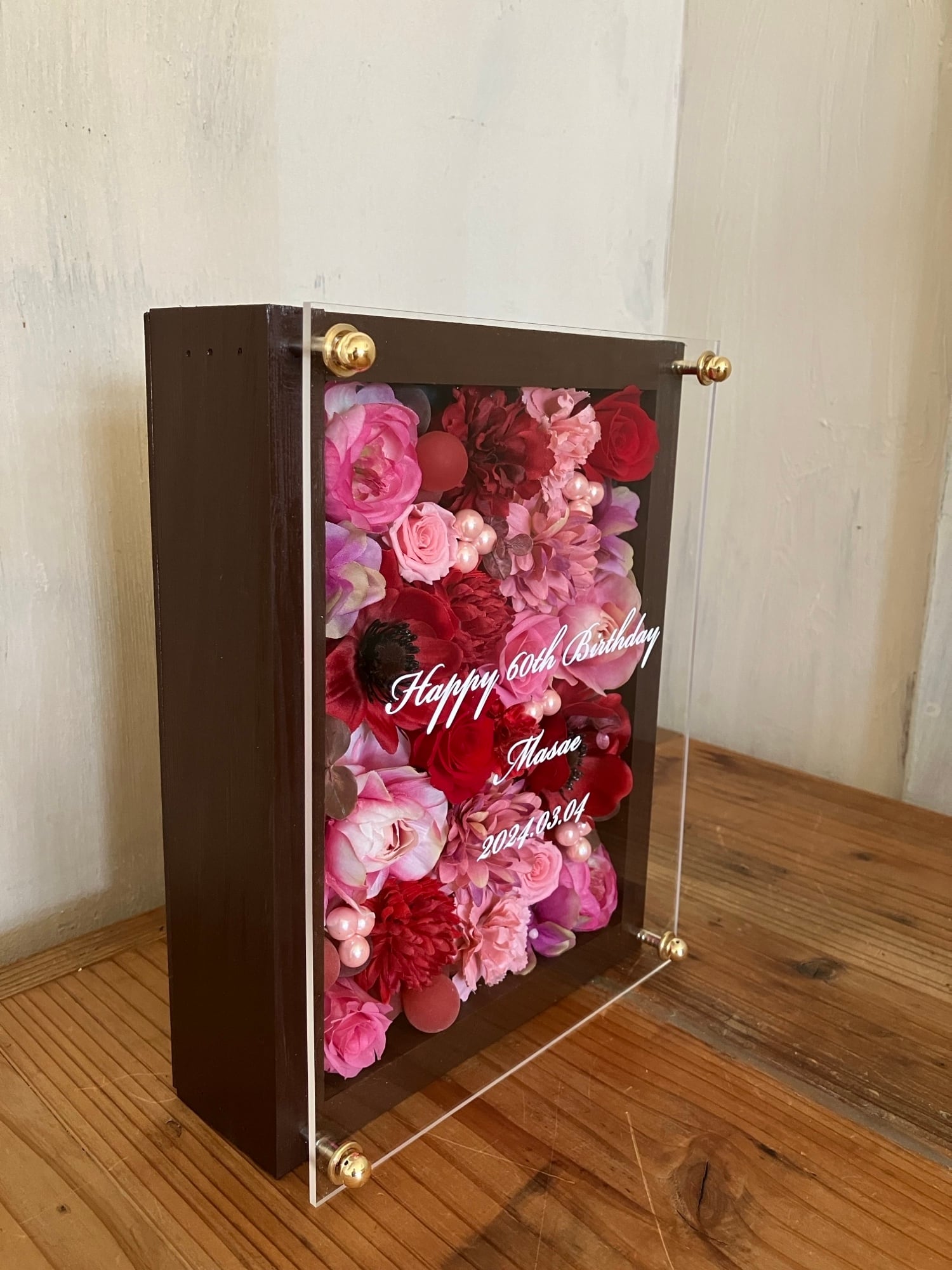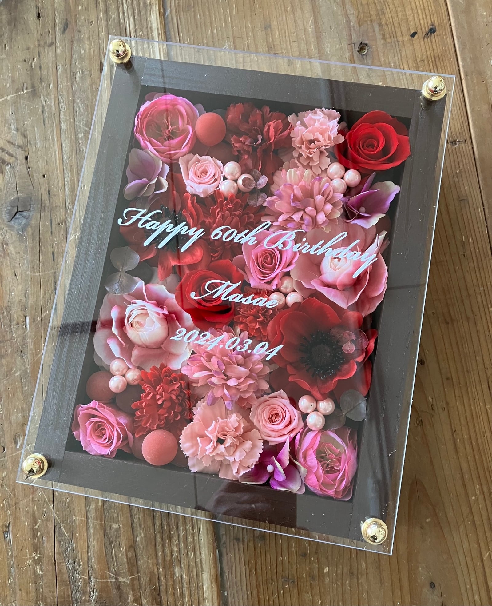 茶色のウッドフレームにプリザーブドフラワーと造花をぎっしり詰め込み、アクリル板にはカッティングシートでメッセージをお入れします。