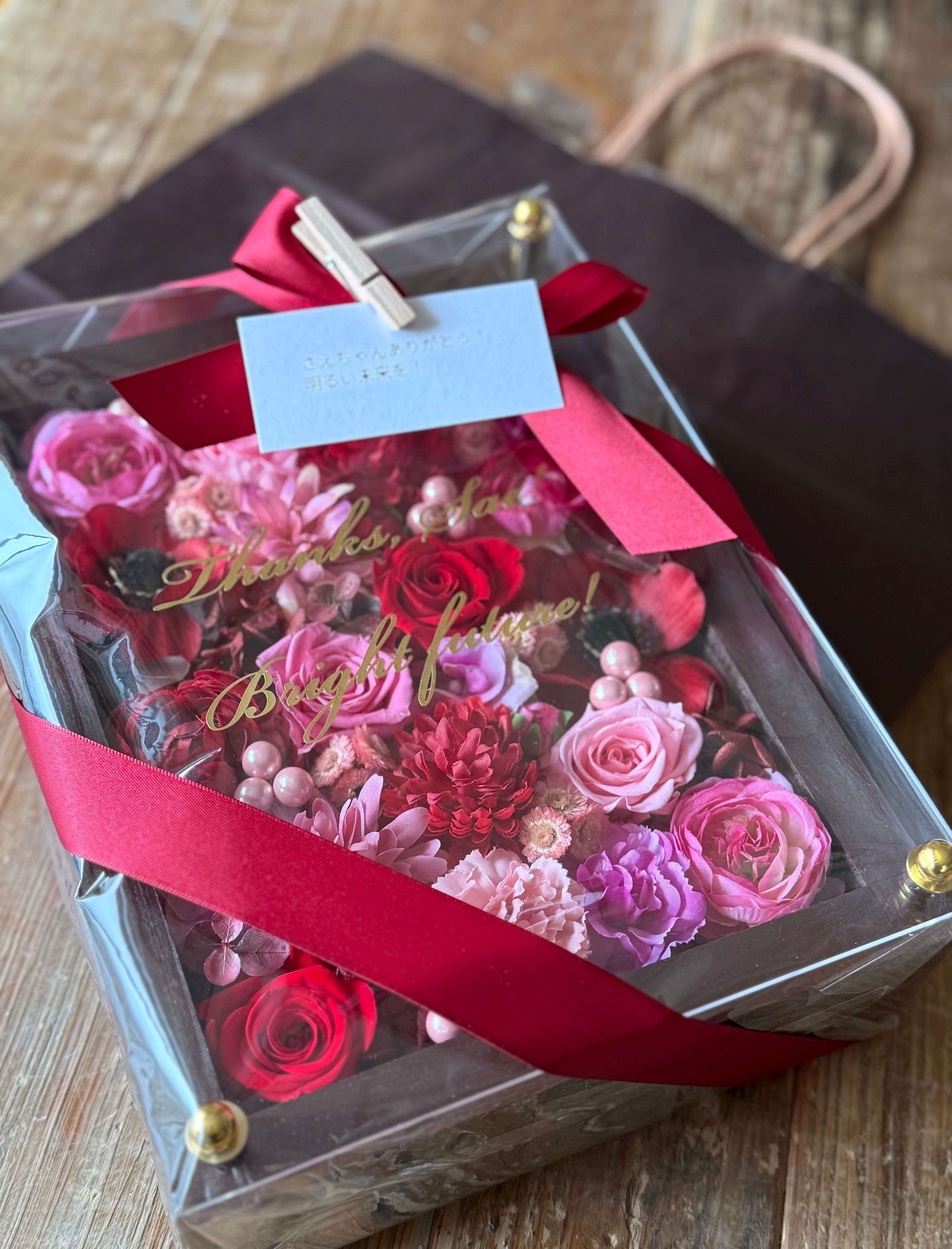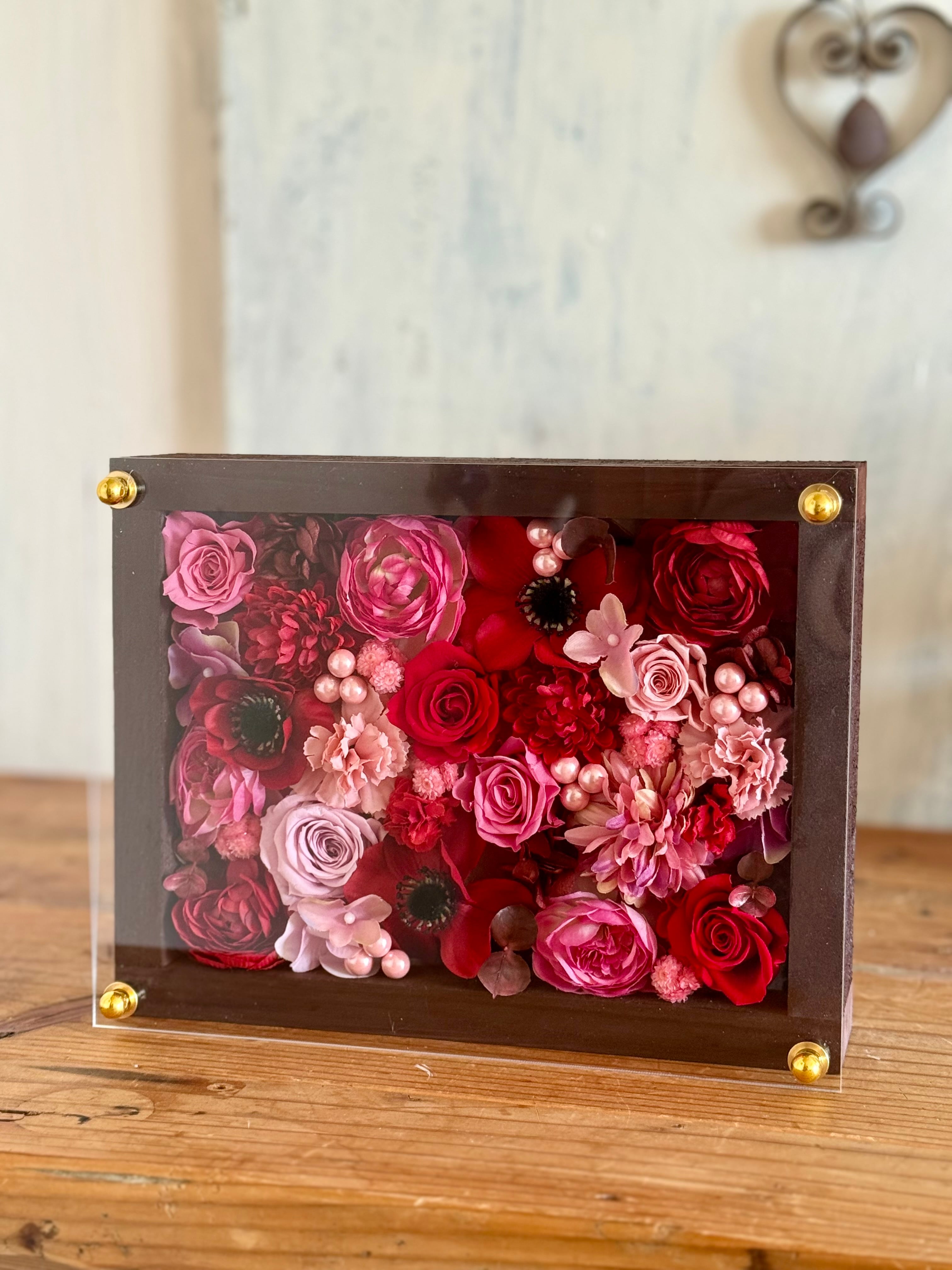 茶色のウッドフレームにプリザーブドフラワーと造花をぎっしり詰め込みアクリル板にはカッティングシートでメッセージをお入れします。