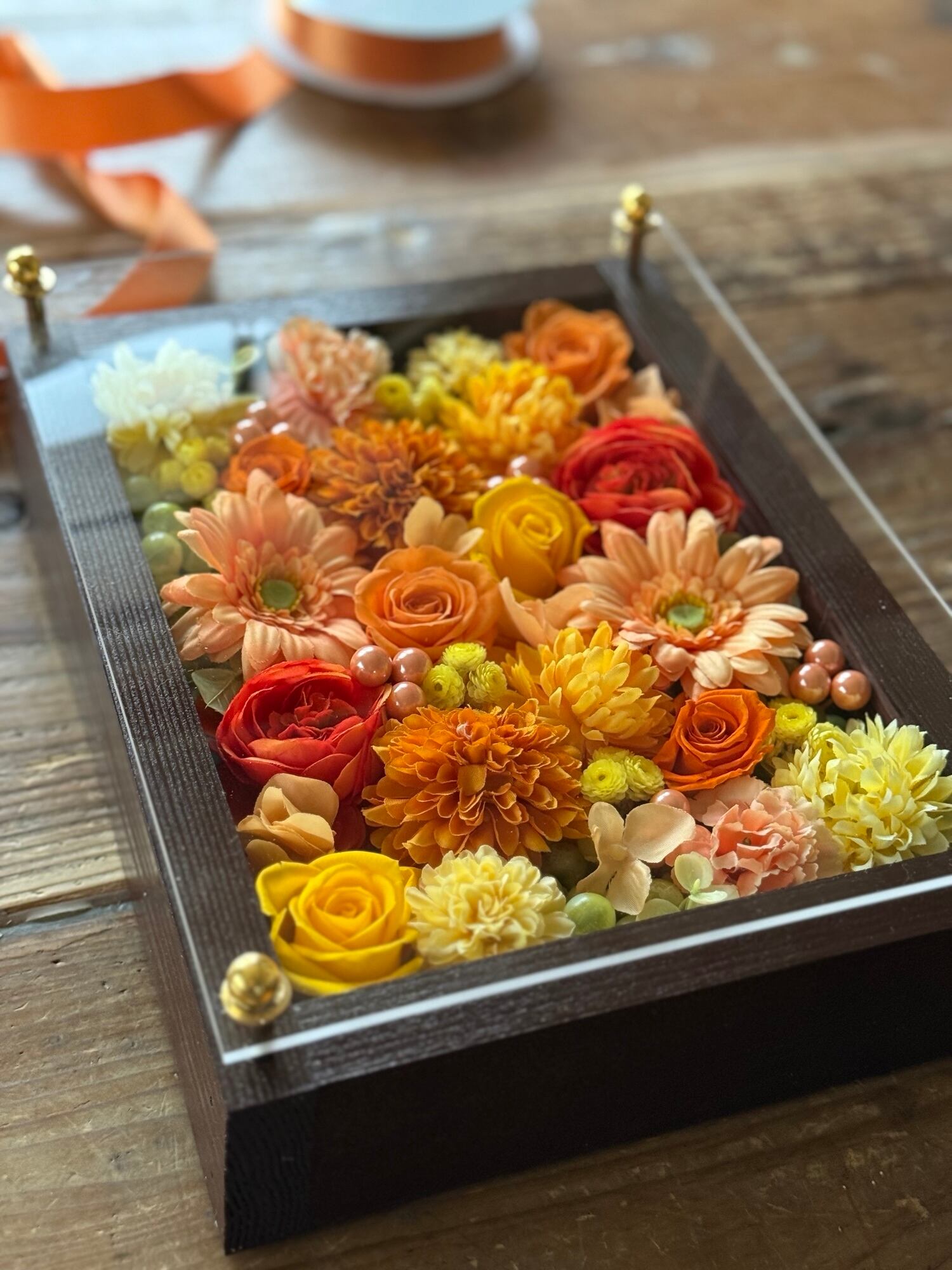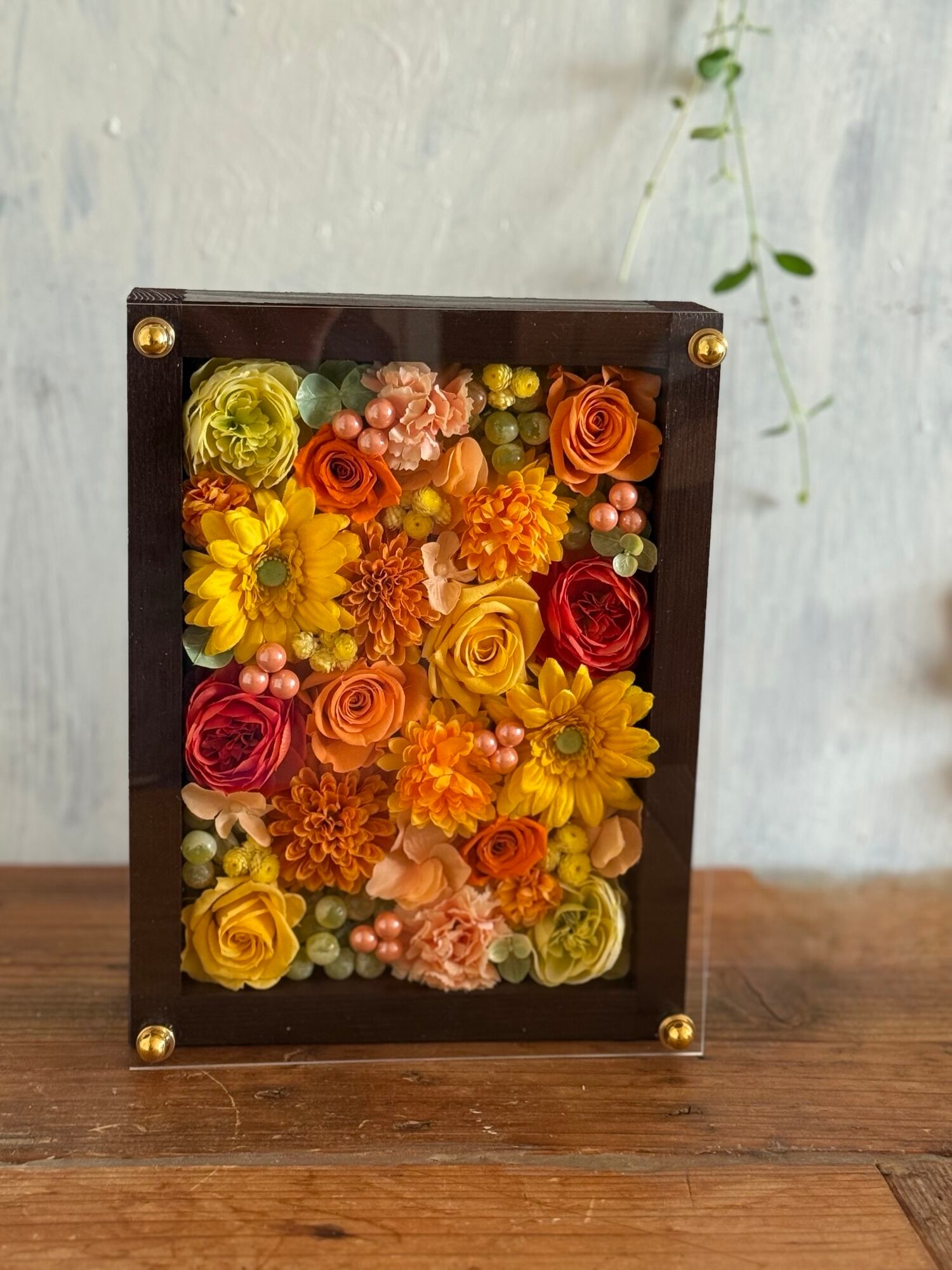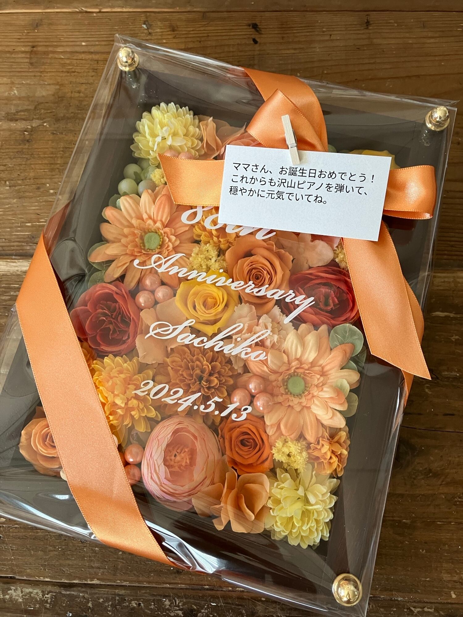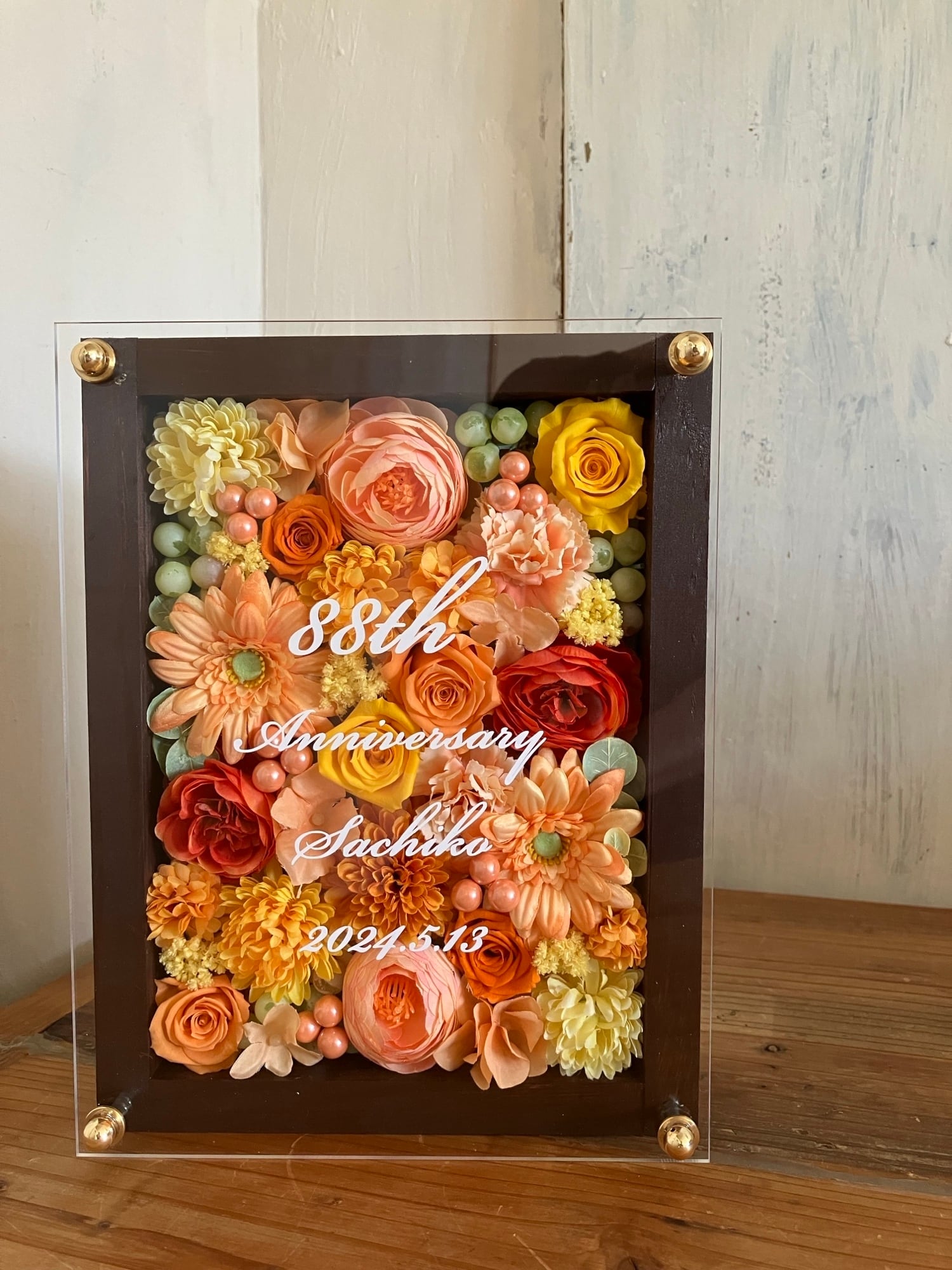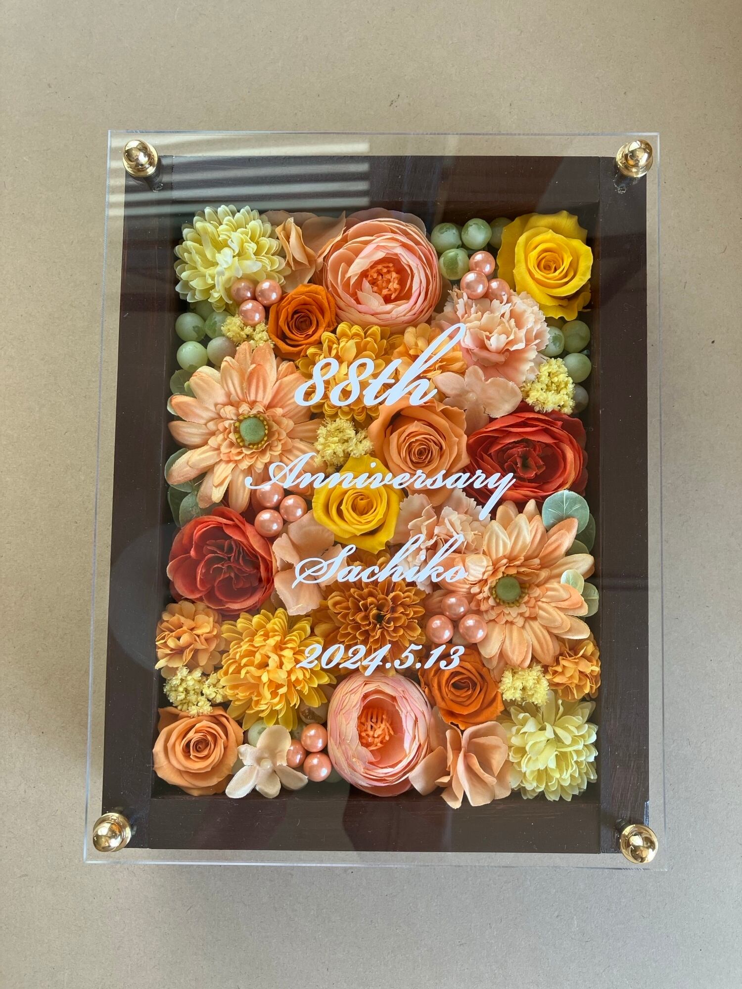茶色のウッドフレームにプリザーブドフラワーと造花をぎっしり詰め込み、アクリル板にはカッティングシートでメッセージをお入れします。