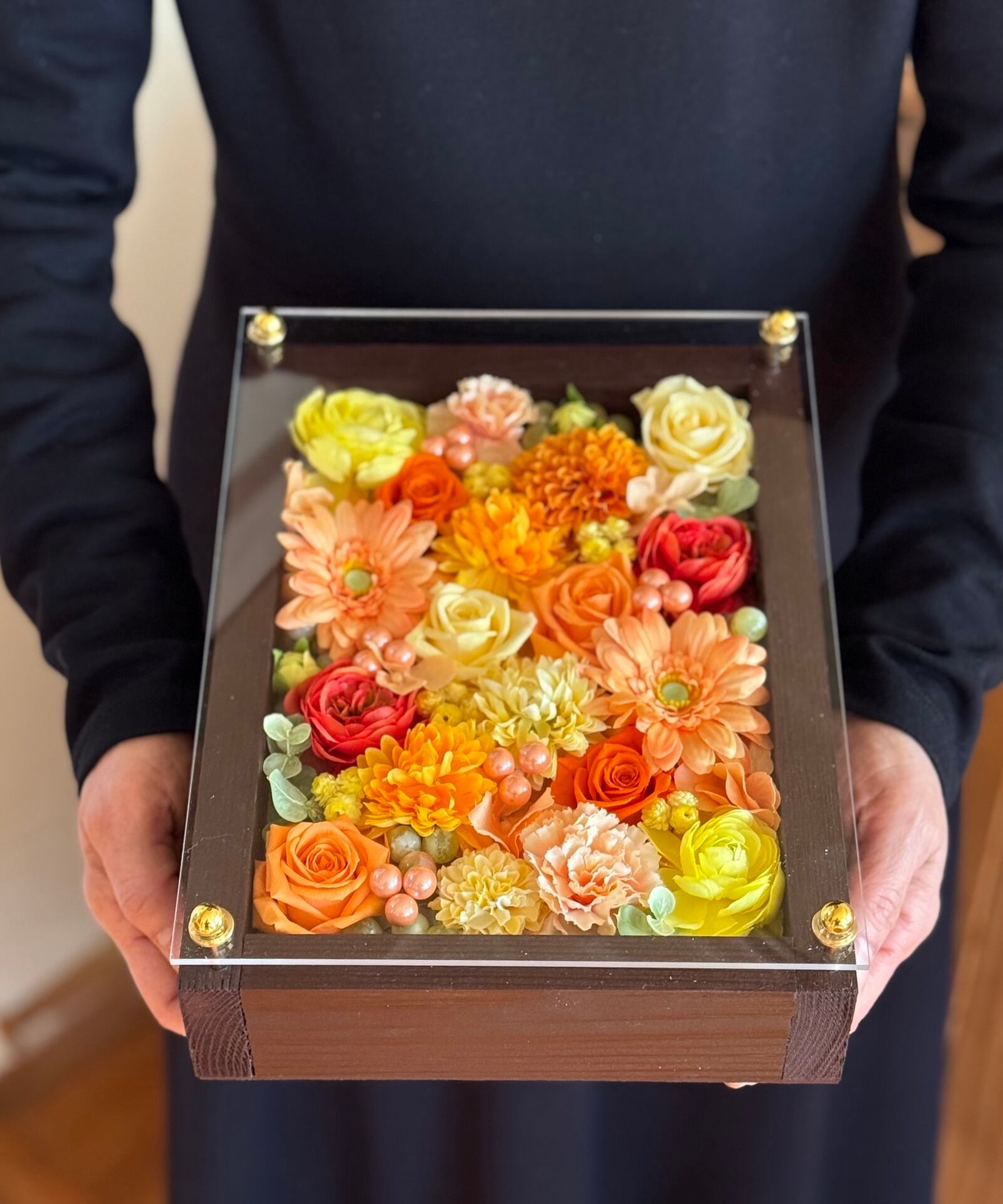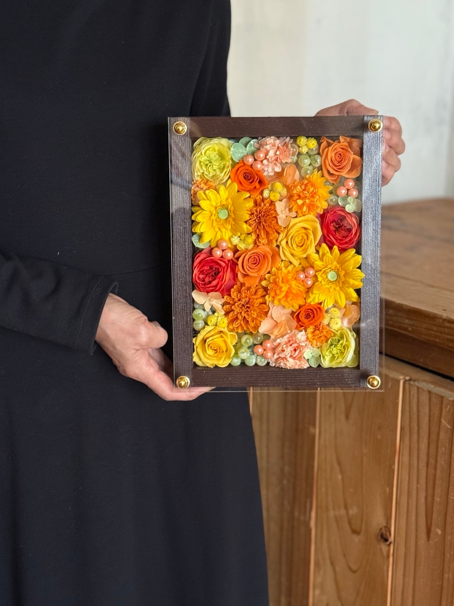 お花のギフト|プリザーブドフラワーアレンジ 茶木枠〈イエローオレンジ〉名入れ可/米寿・周年祝いに