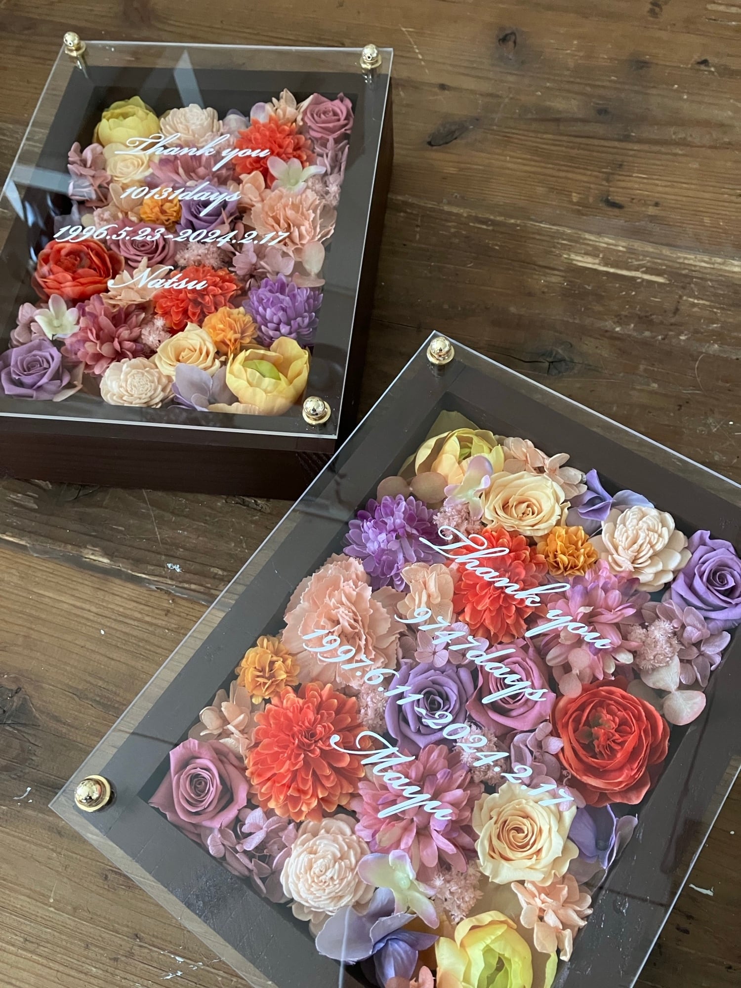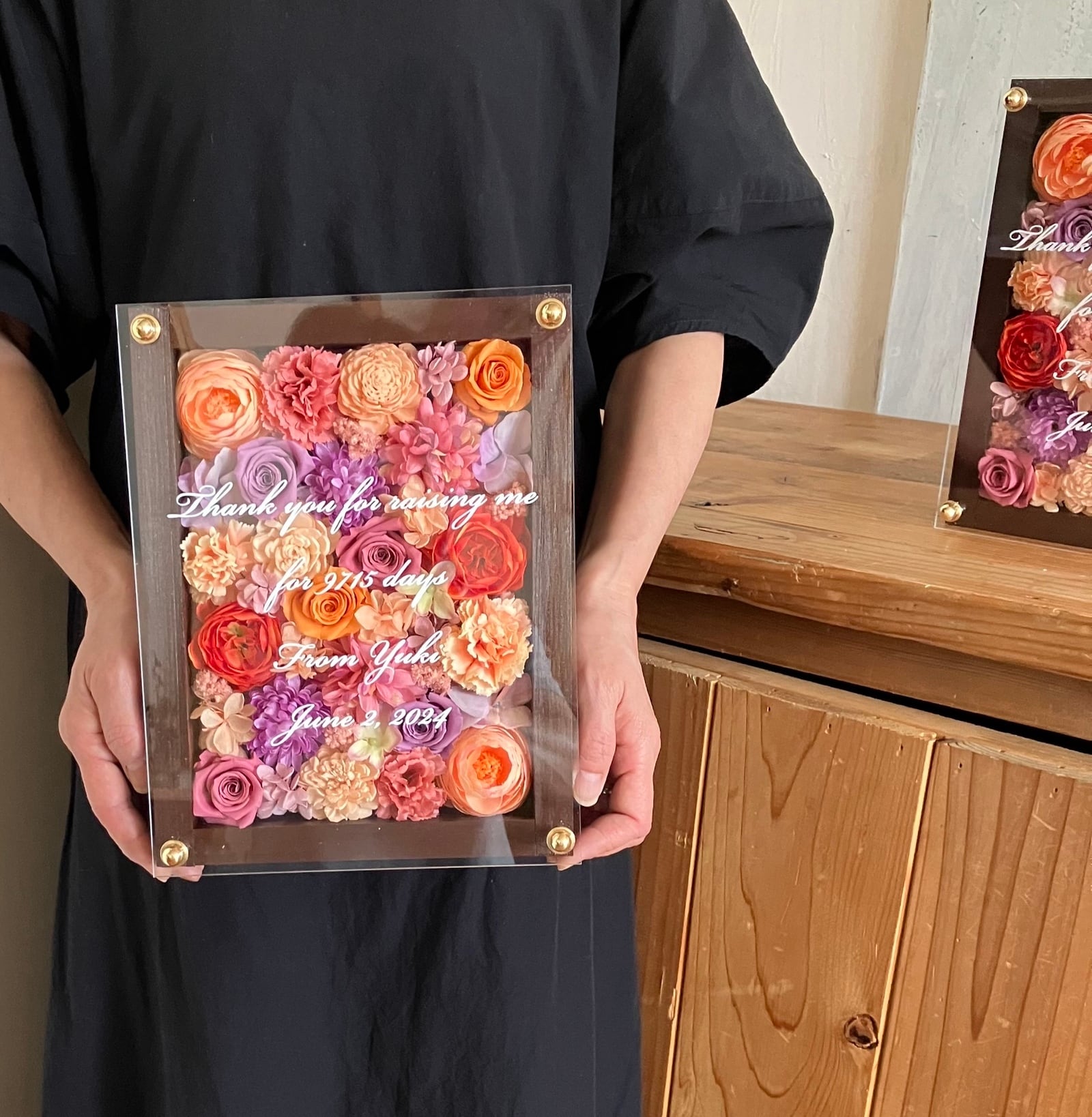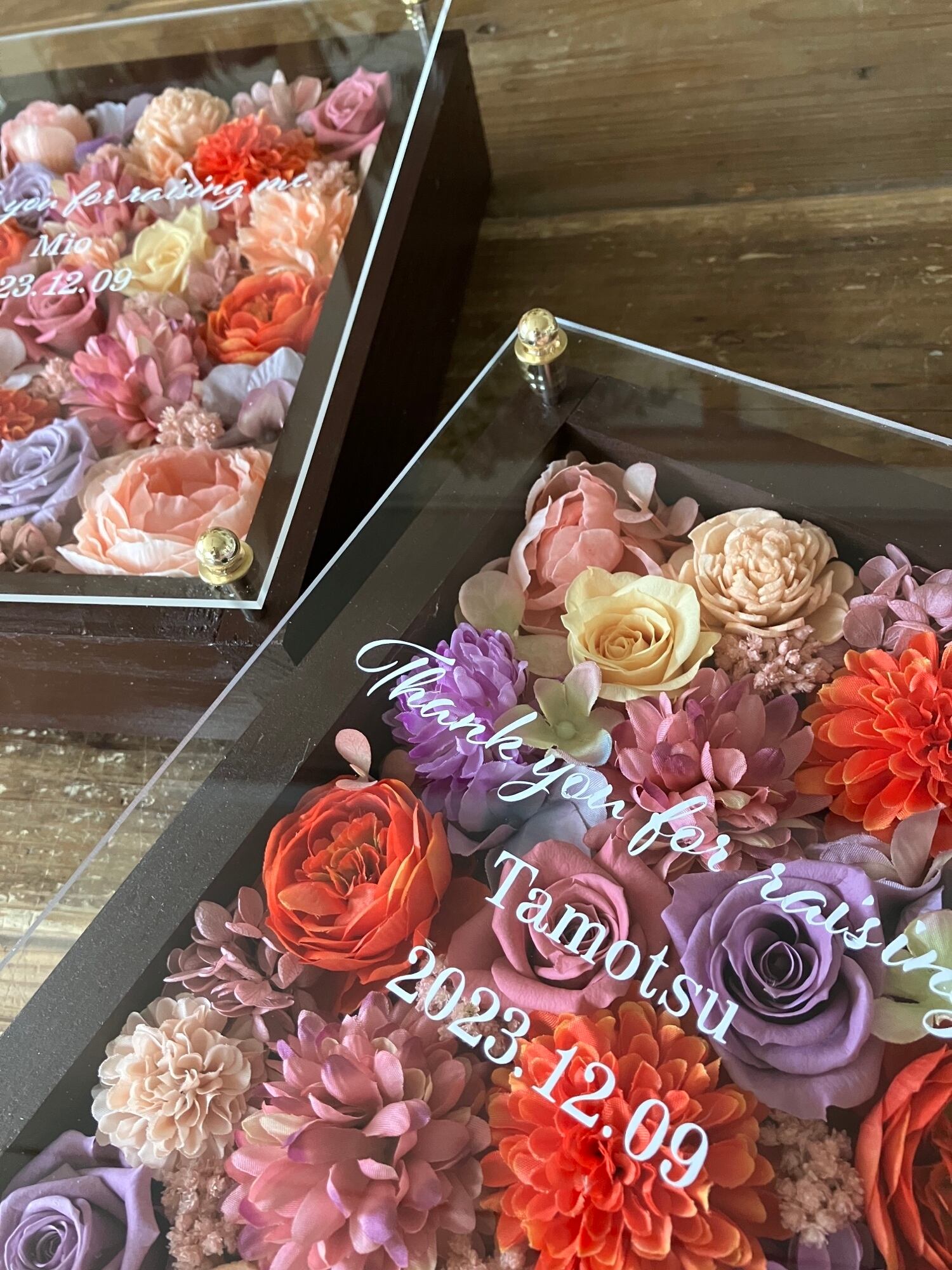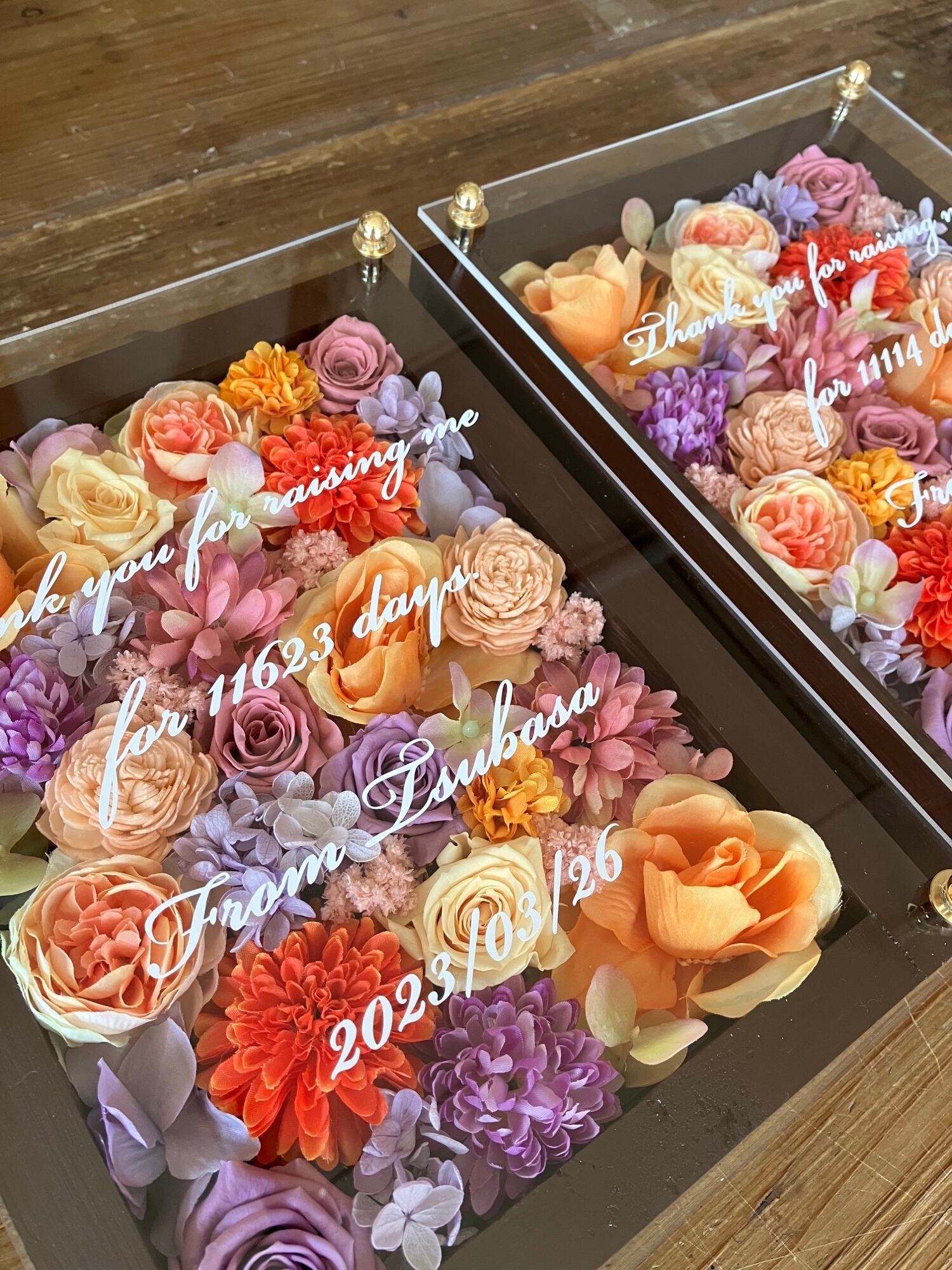 茶色のウッドフレームにプリザーブドフラワーと造花をぎっしり詰め込み、アクリル板にはカッティングシートでメッセージをお入れします。