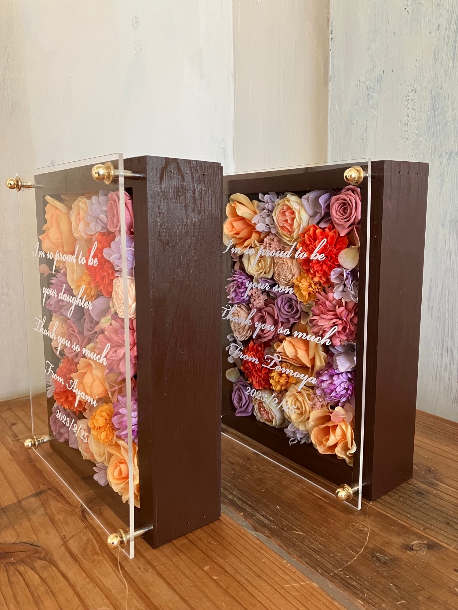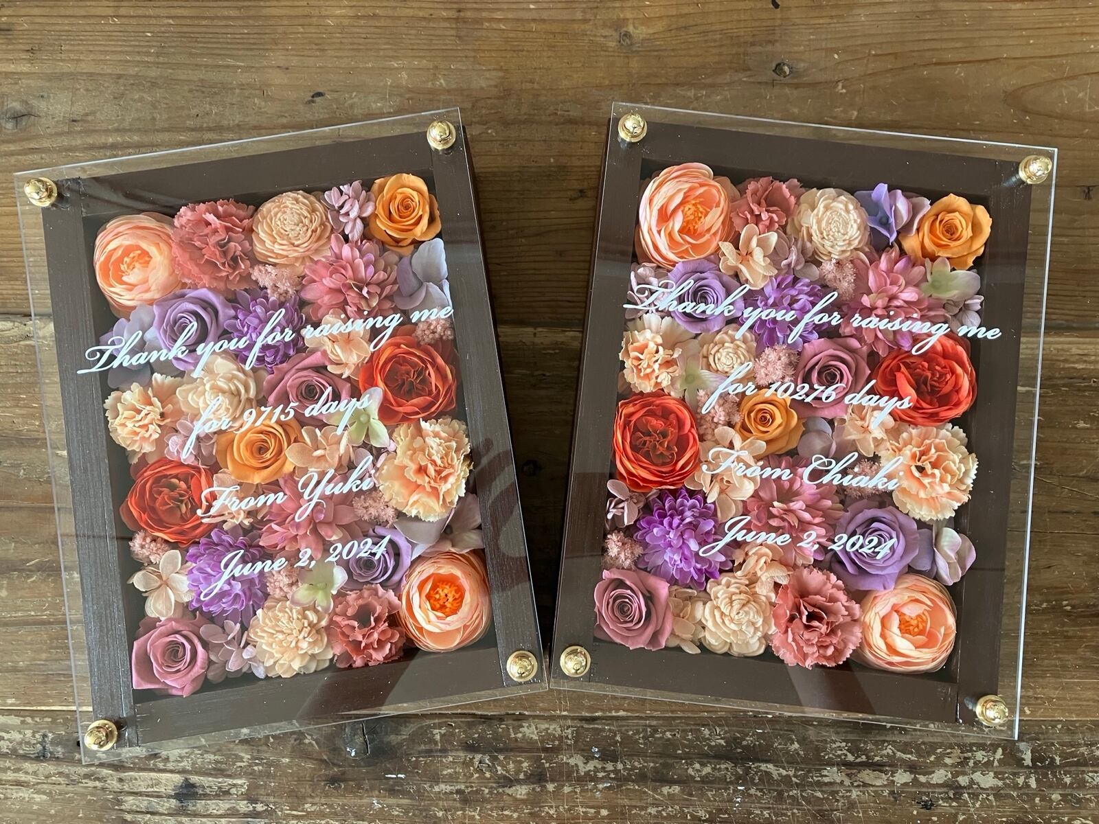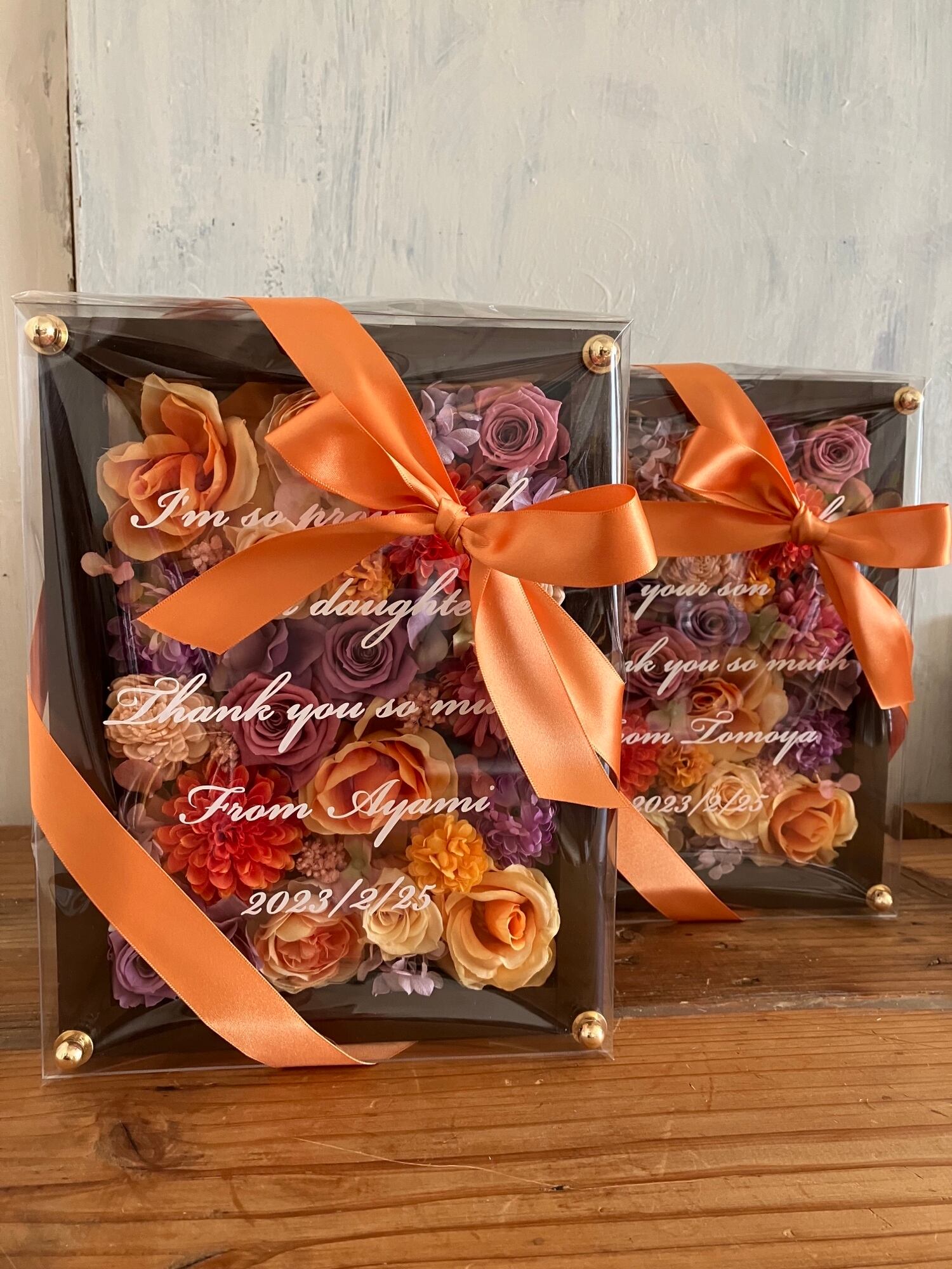 感謝のギフト|結婚式両親贈呈品 プリザーブドフラワーアレンジ ウッドフレーム 茶木枠〈オレンジピンクパープルペア〉文字入れ 2個セット