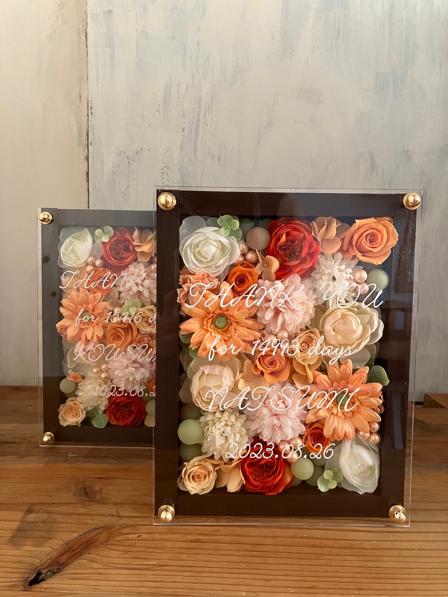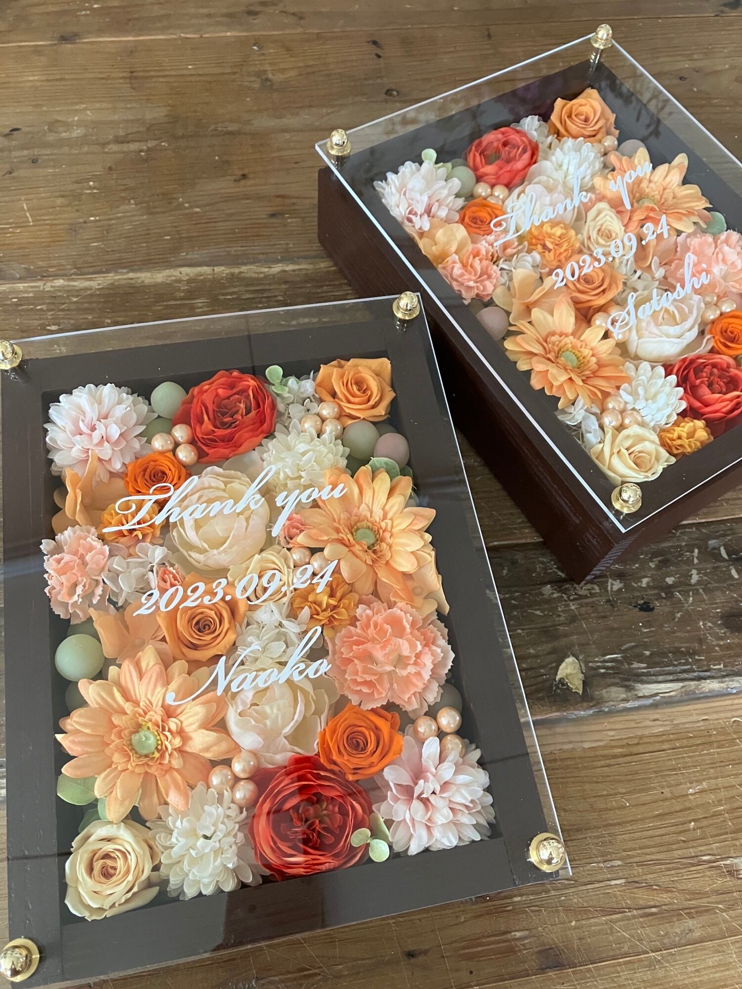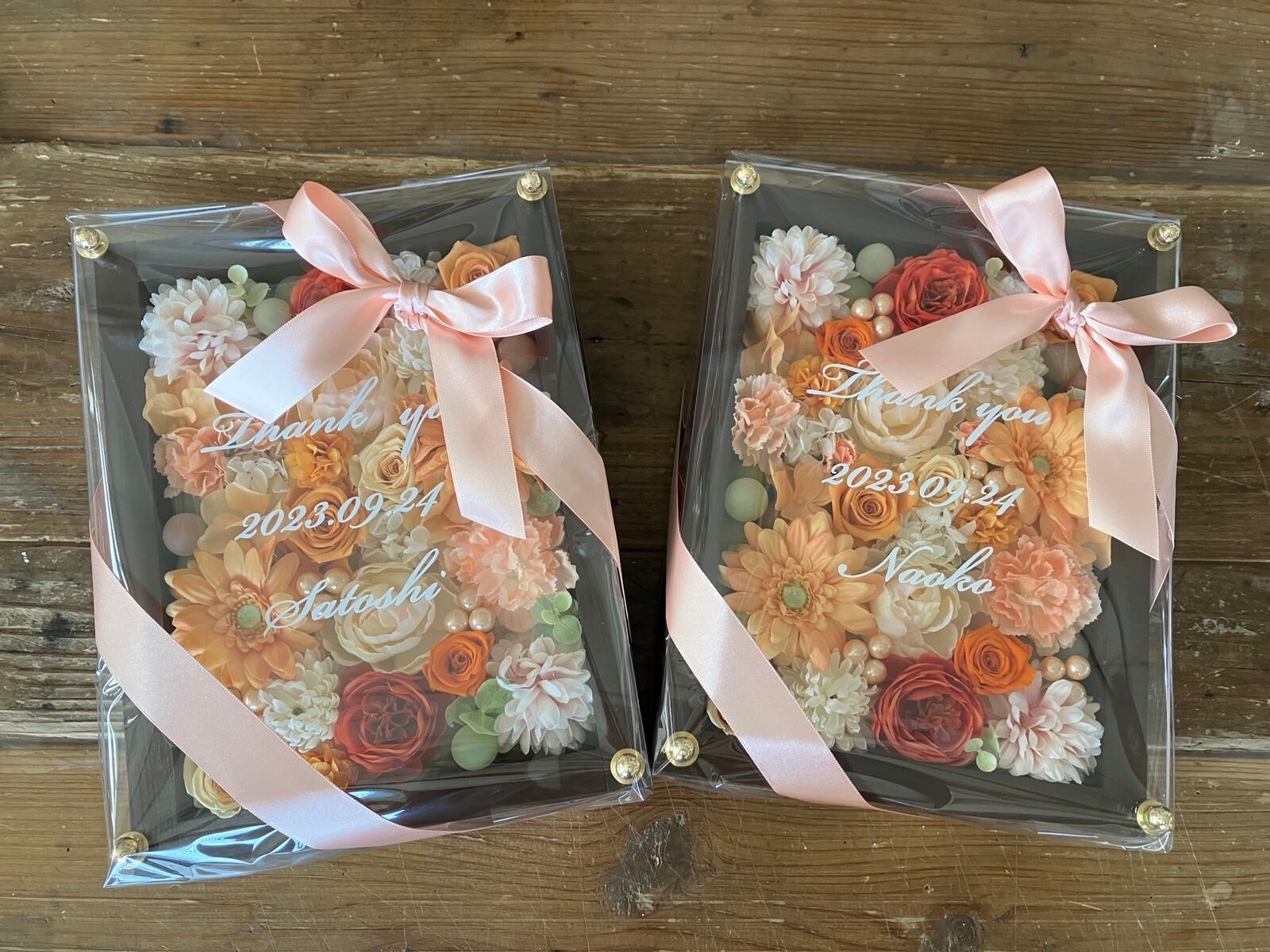 感謝のギフト| 結婚式両親贈呈品 プリザーブドフラワーアレンジ ウッドフレーム 茶木枠〈オレンジ白ベージュペア〉文字入れ 2個セット