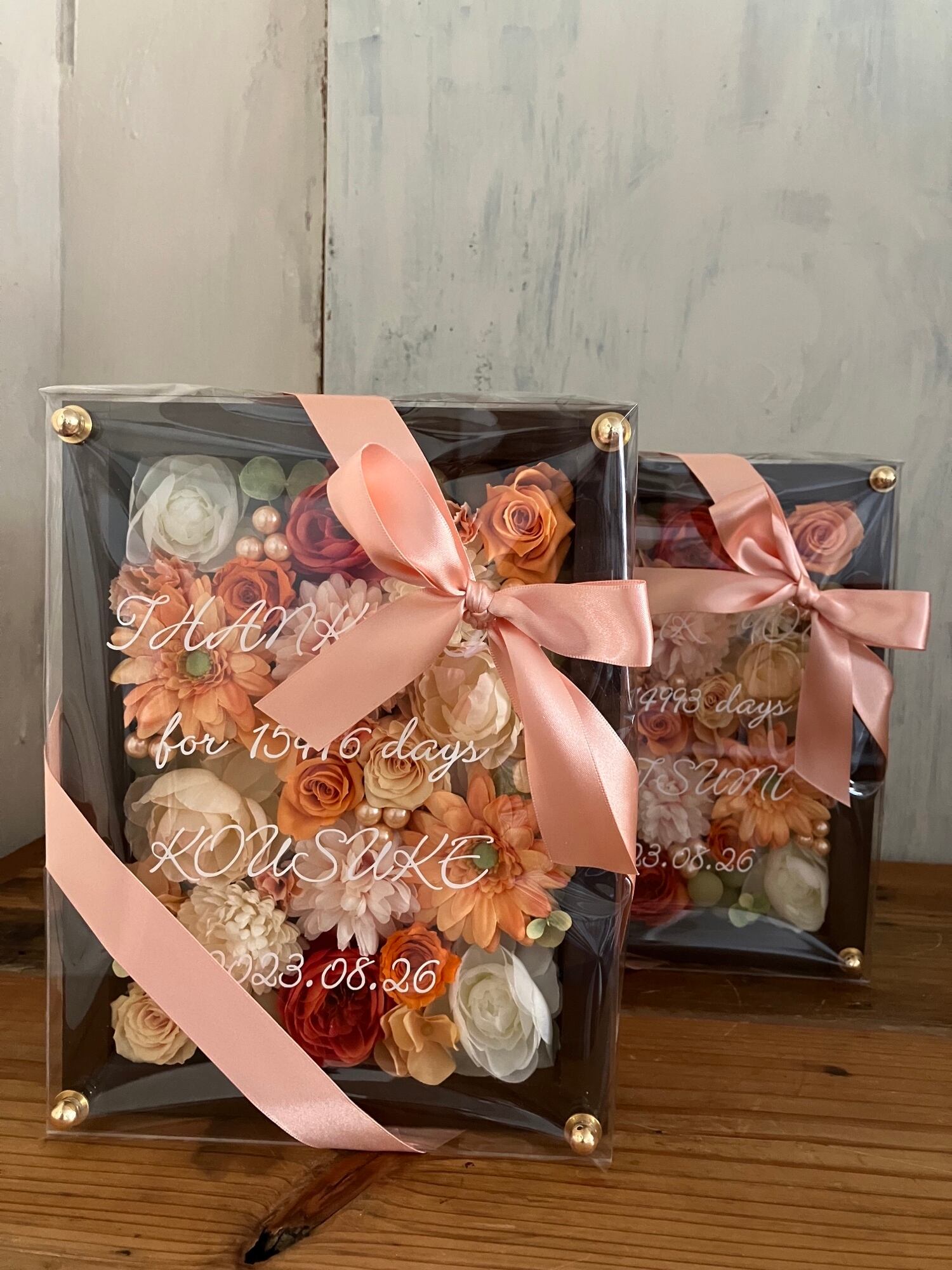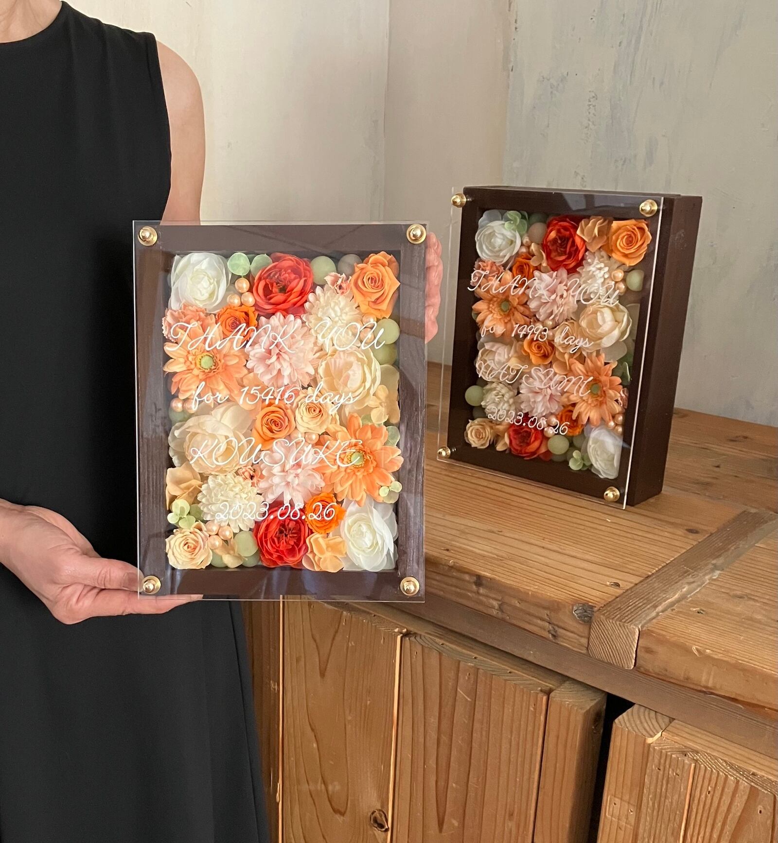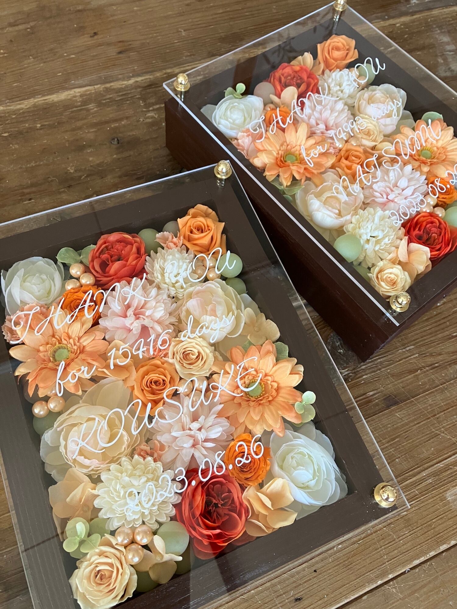 感謝のギフト| 結婚式両親贈呈品 プリザーブドフラワーアレンジ ウッドフレーム 茶木枠〈オレンジ白ベージュペア〉文字入れ 2個セット