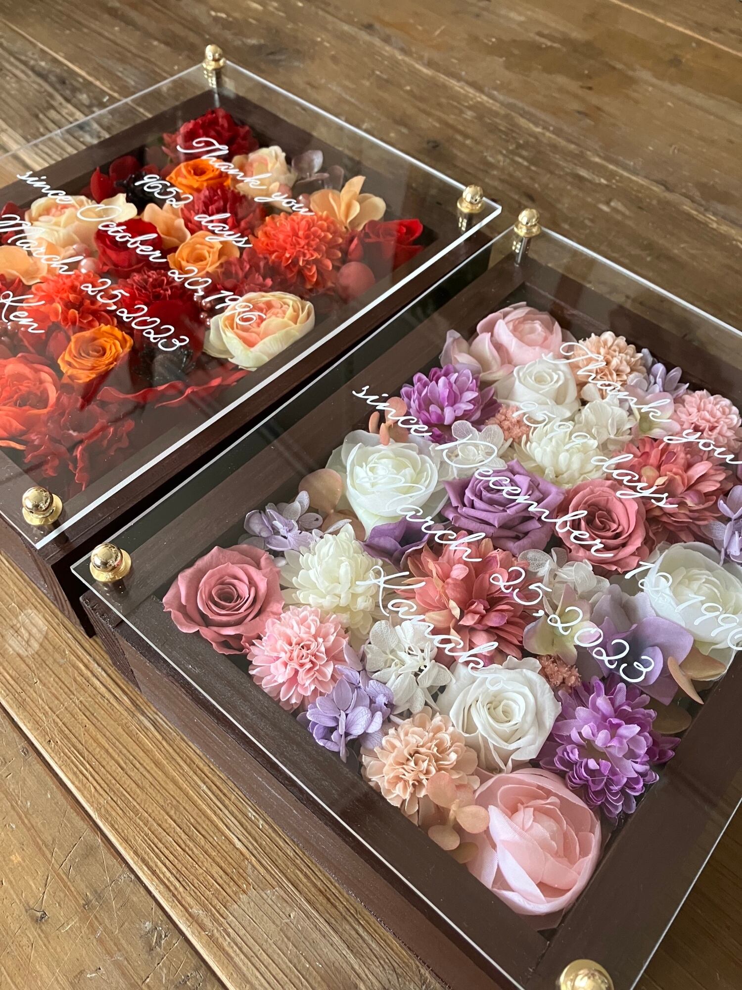感謝のギフト|結婚式 両親贈呈品 プリザーブドフラワーアレンジ ウッドフレーム 茶木枠〈ピンクパープル白&赤オレンジ〉文字入れ 2個セット