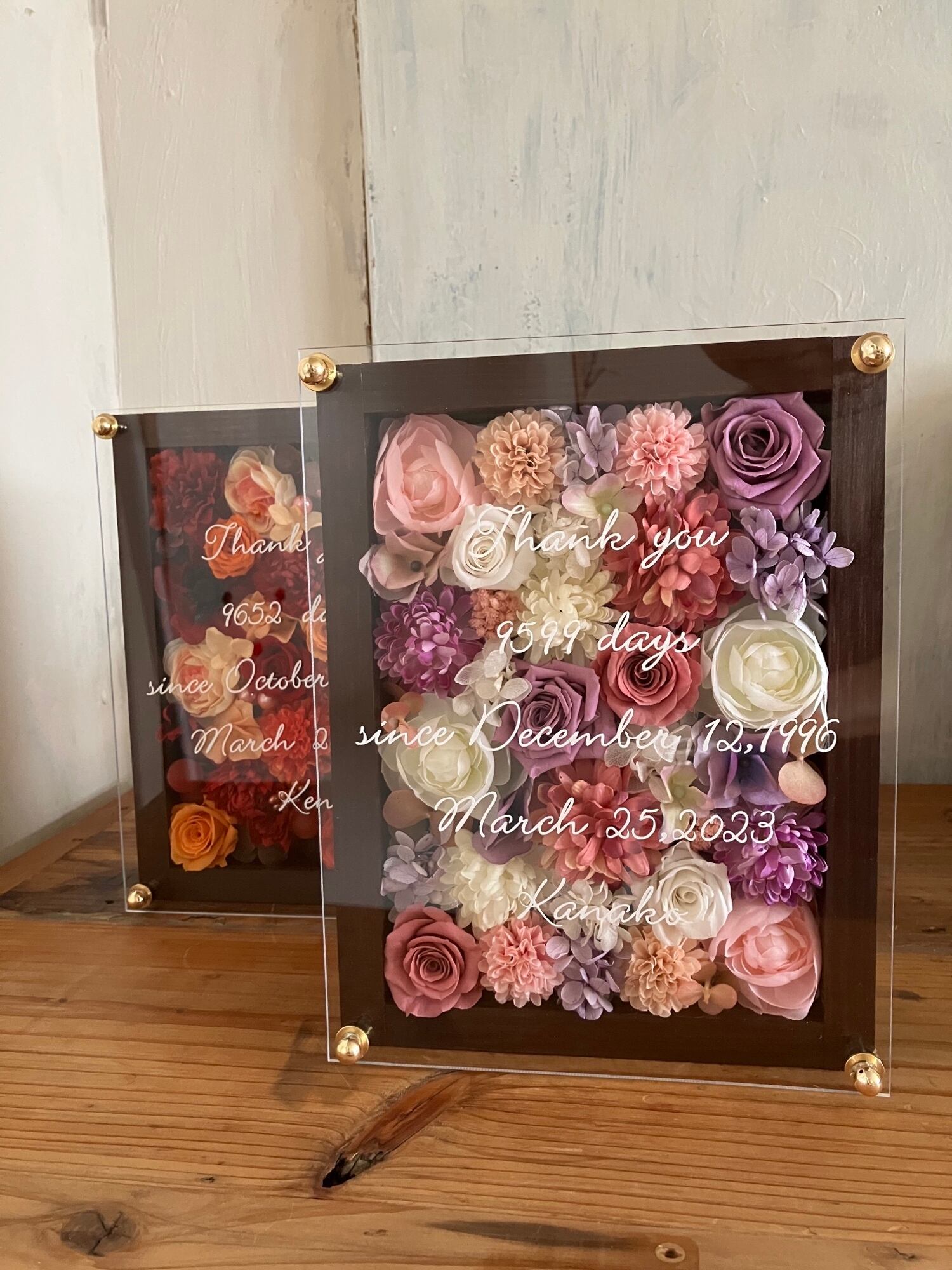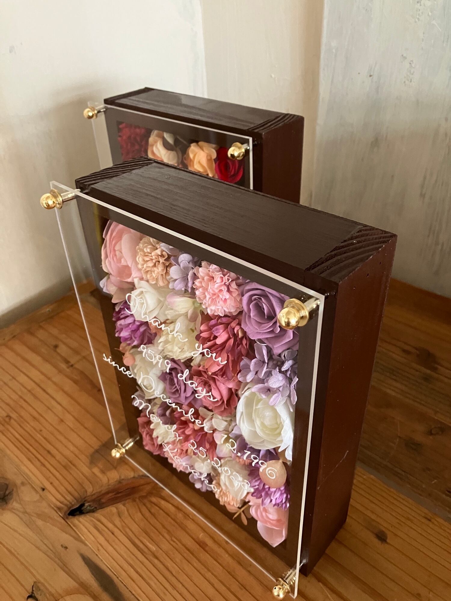 茶色のウッドフレームにプリザーブドフラワーと造花をぎっしり詰め込み、アクリル板にはカッティングシートでメッセージをお入れします。
