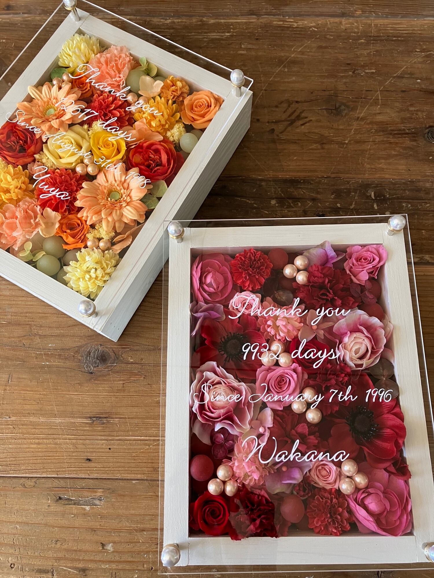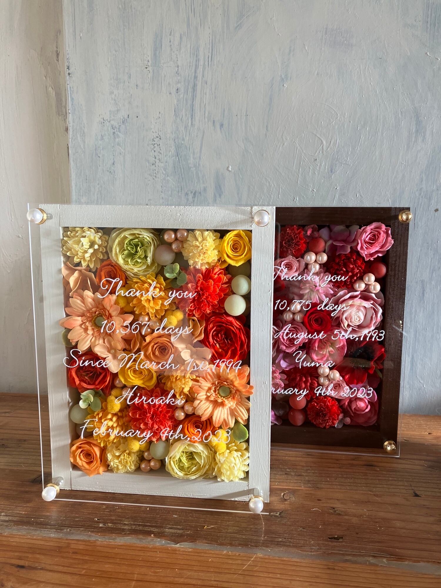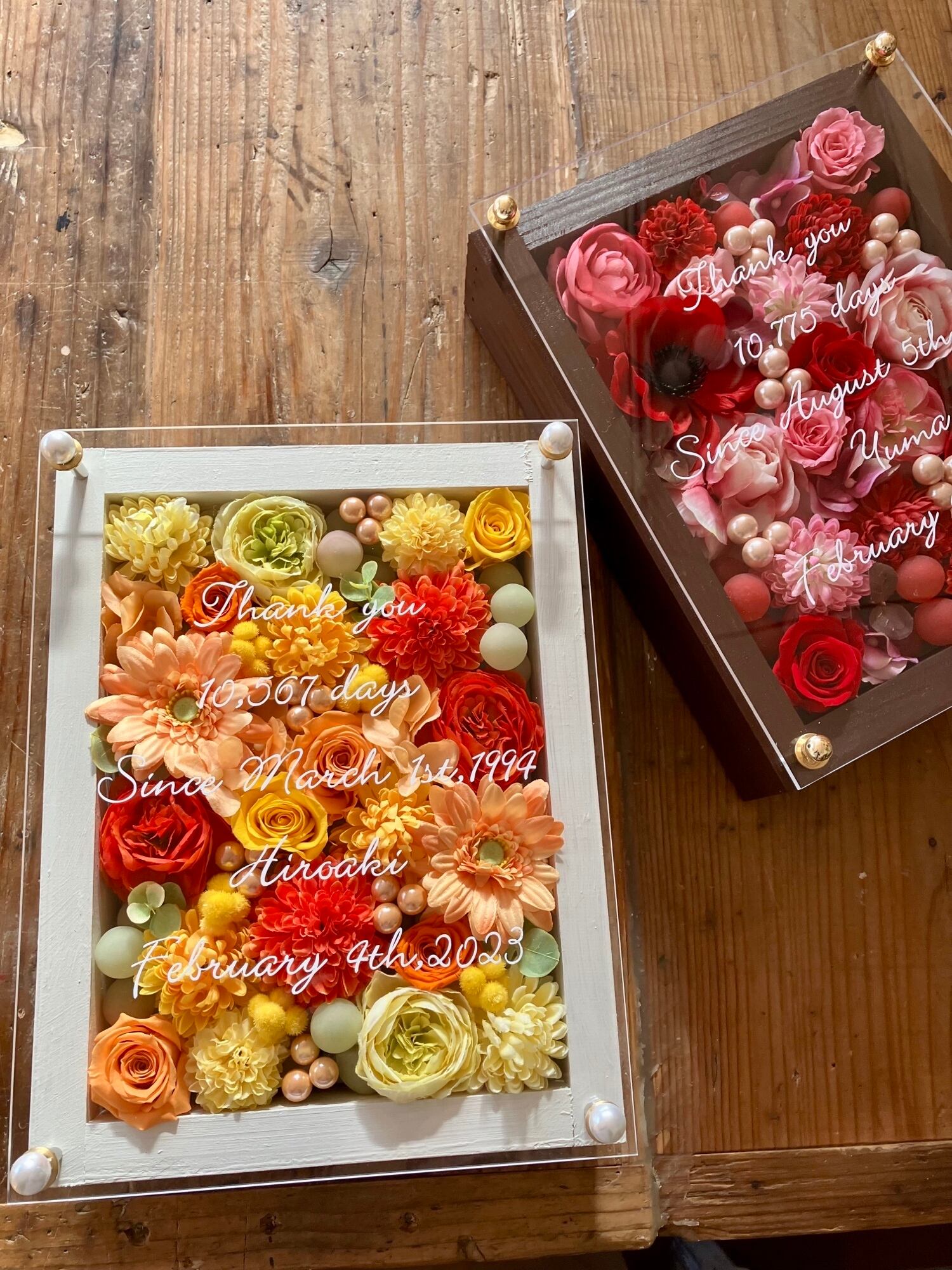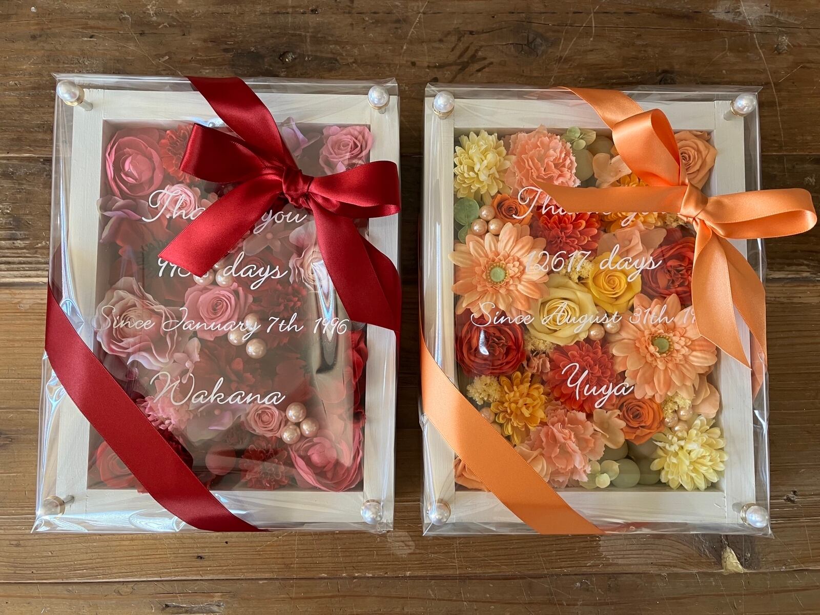 感謝のギフト|結婚式両親贈呈品 プリザーブドフラワーアレンジ ウッドフレーム〈赤ピンク&イエローオレンジ〉文字入れ 2個セット