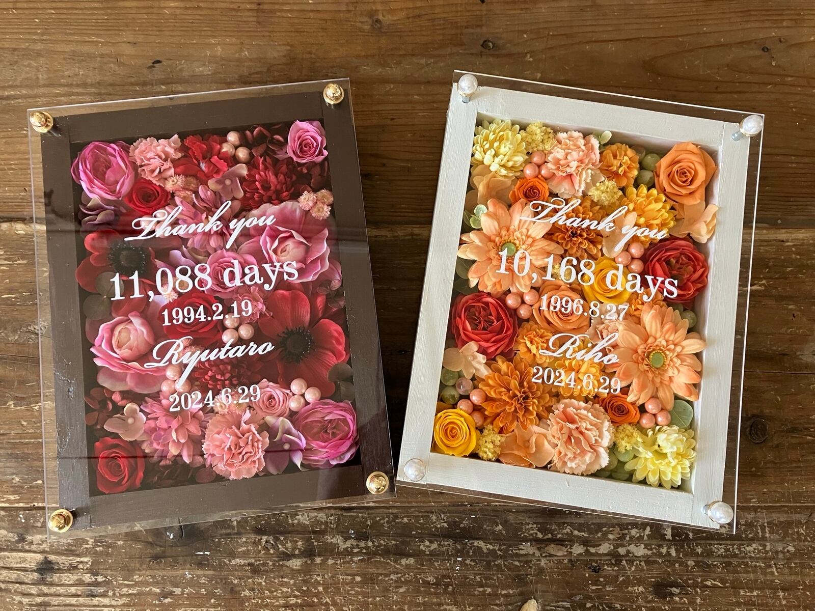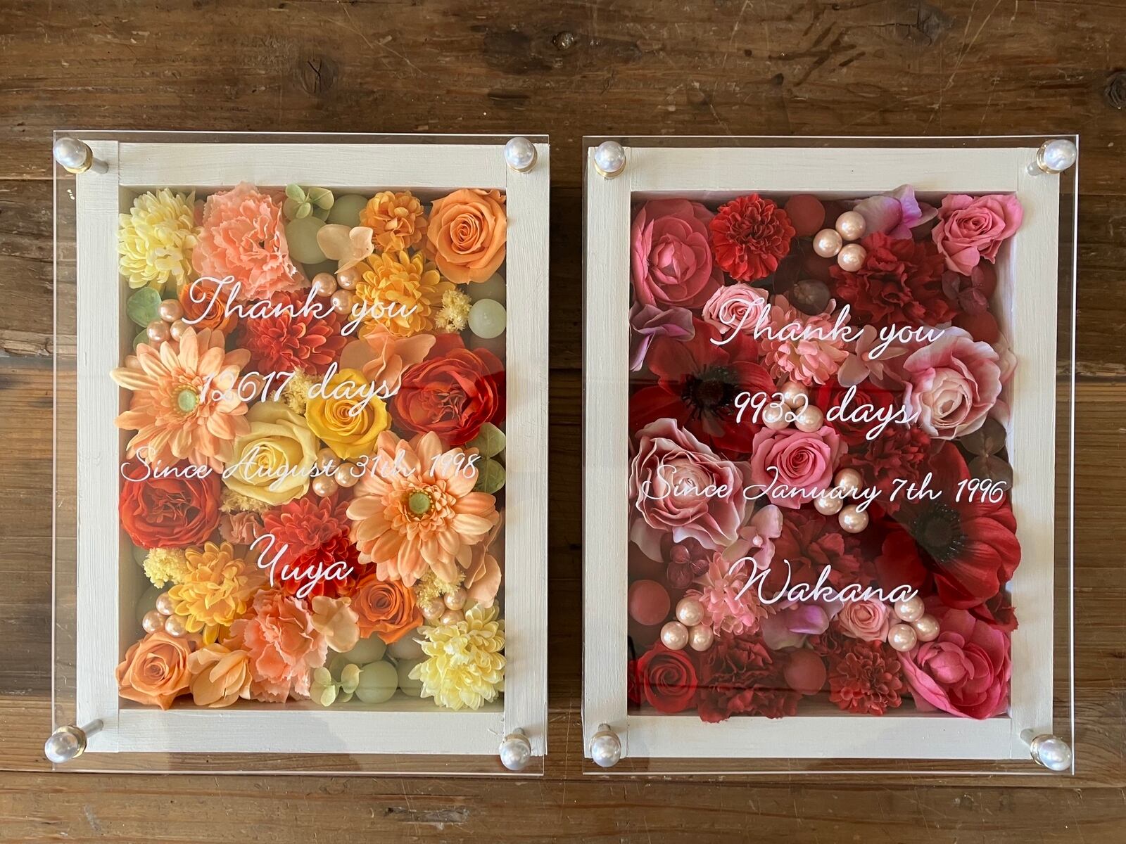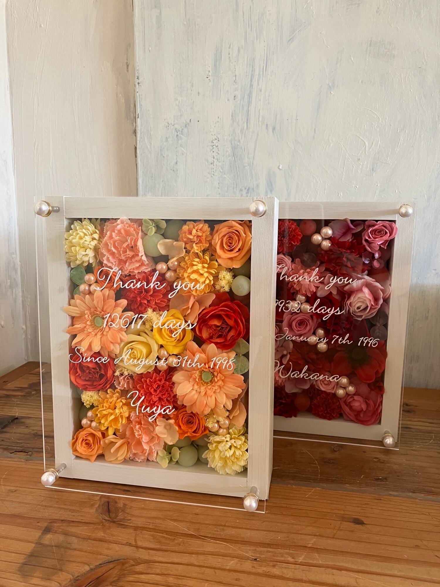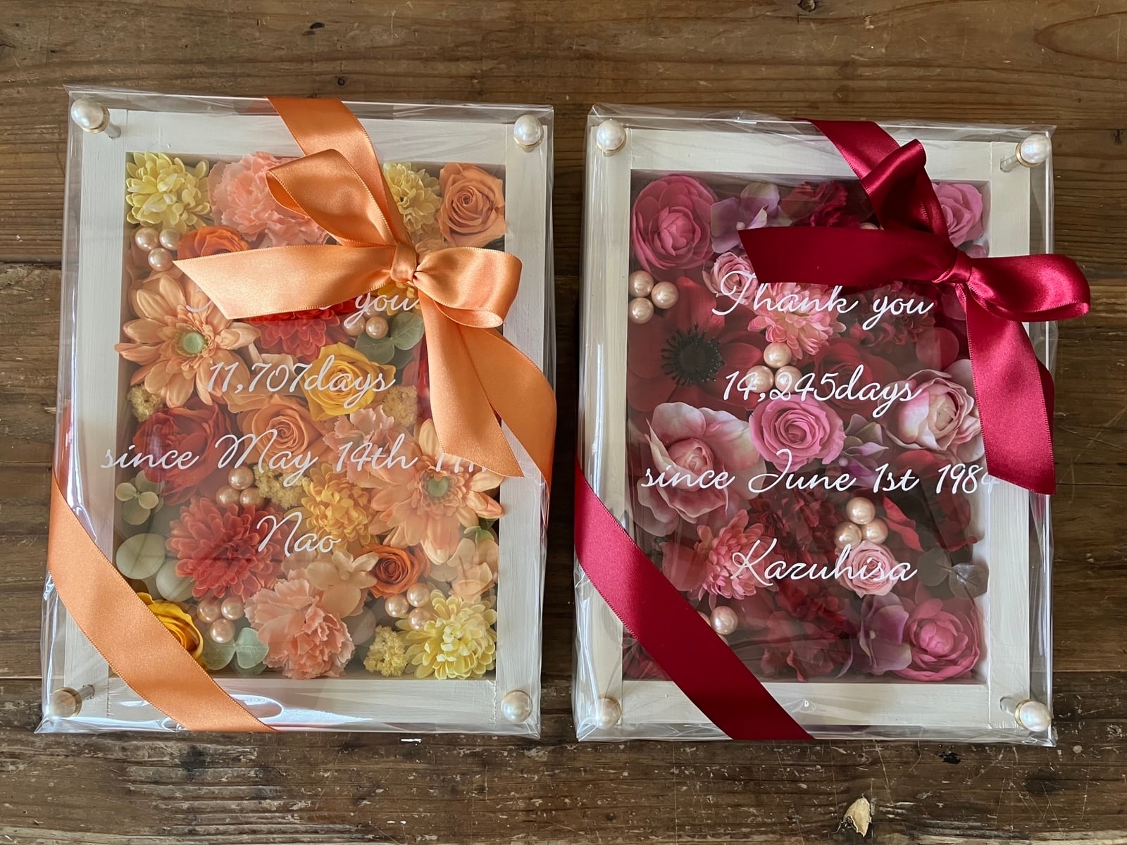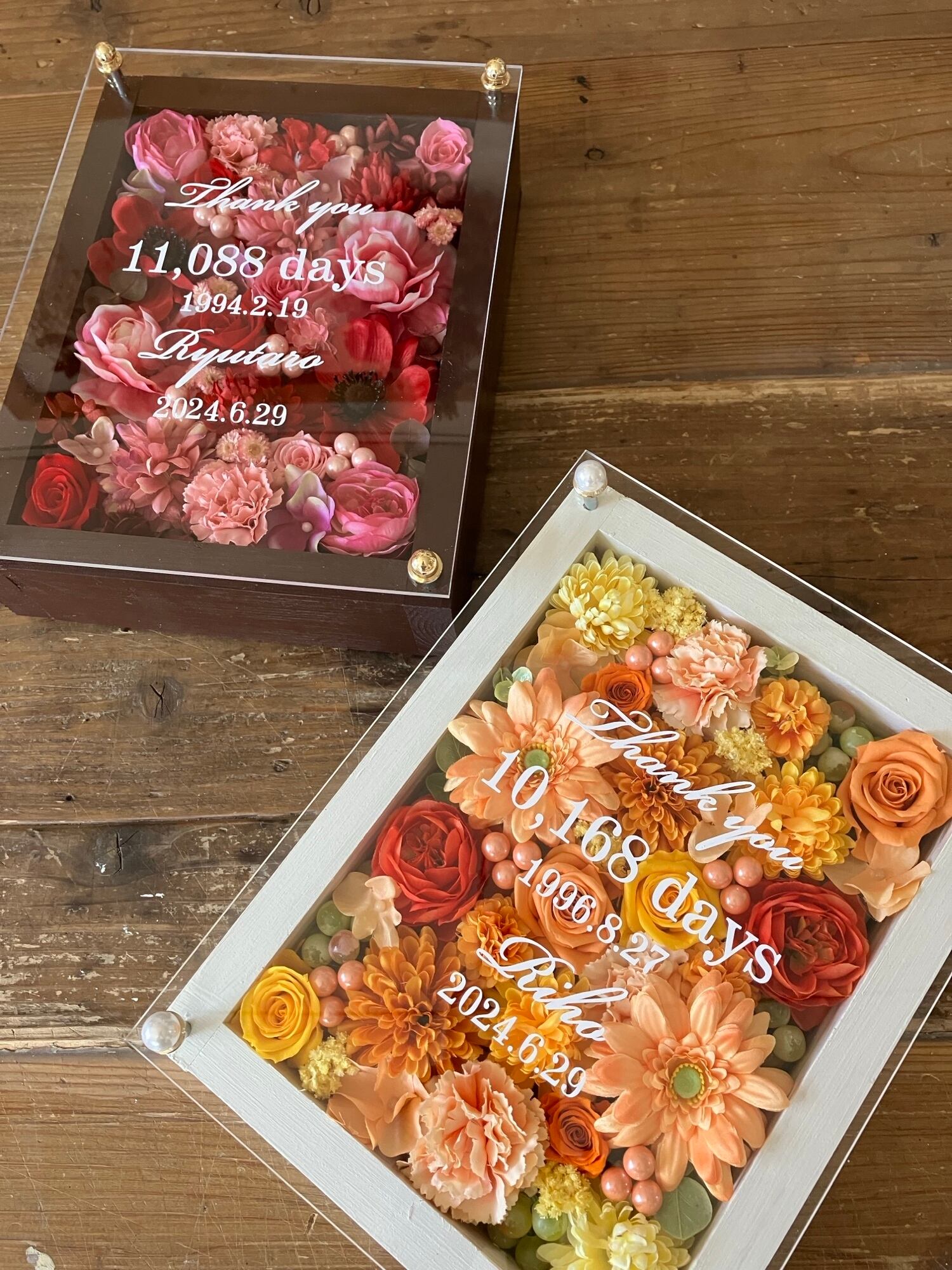 感謝のギフト|結婚式両親贈呈品 プリザーブドフラワーアレンジ ウッドフレーム〈赤ピンク&イエローオレンジ〉文字入れ 2個セット