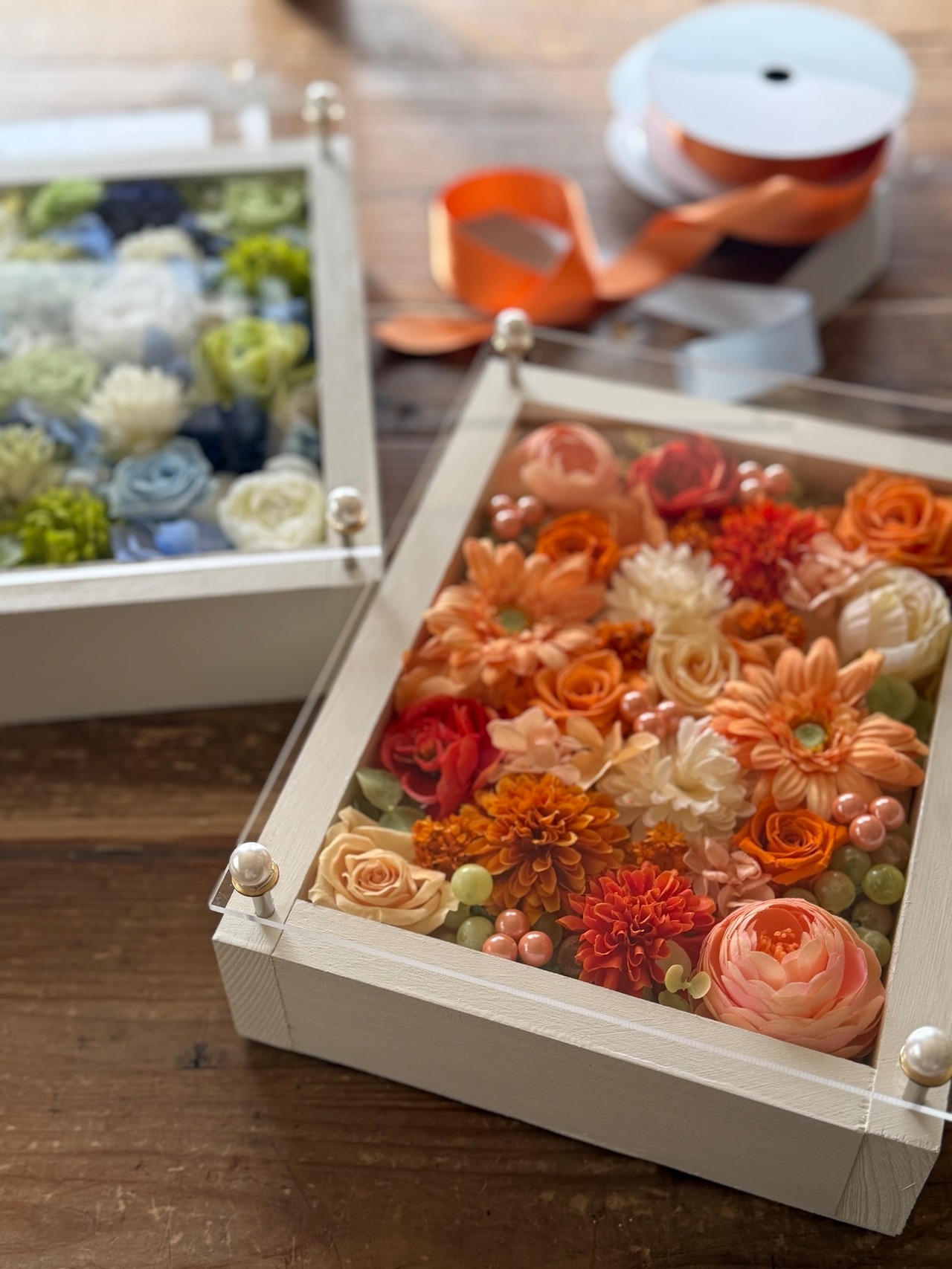 子育て感謝状・両親贈呈品 2個セット【名入れ】プリザーブドフラワーアレンジ ウッドフレーム 白木枠〈オレンジ&白ブルーグリーン〉結婚式 ギフト