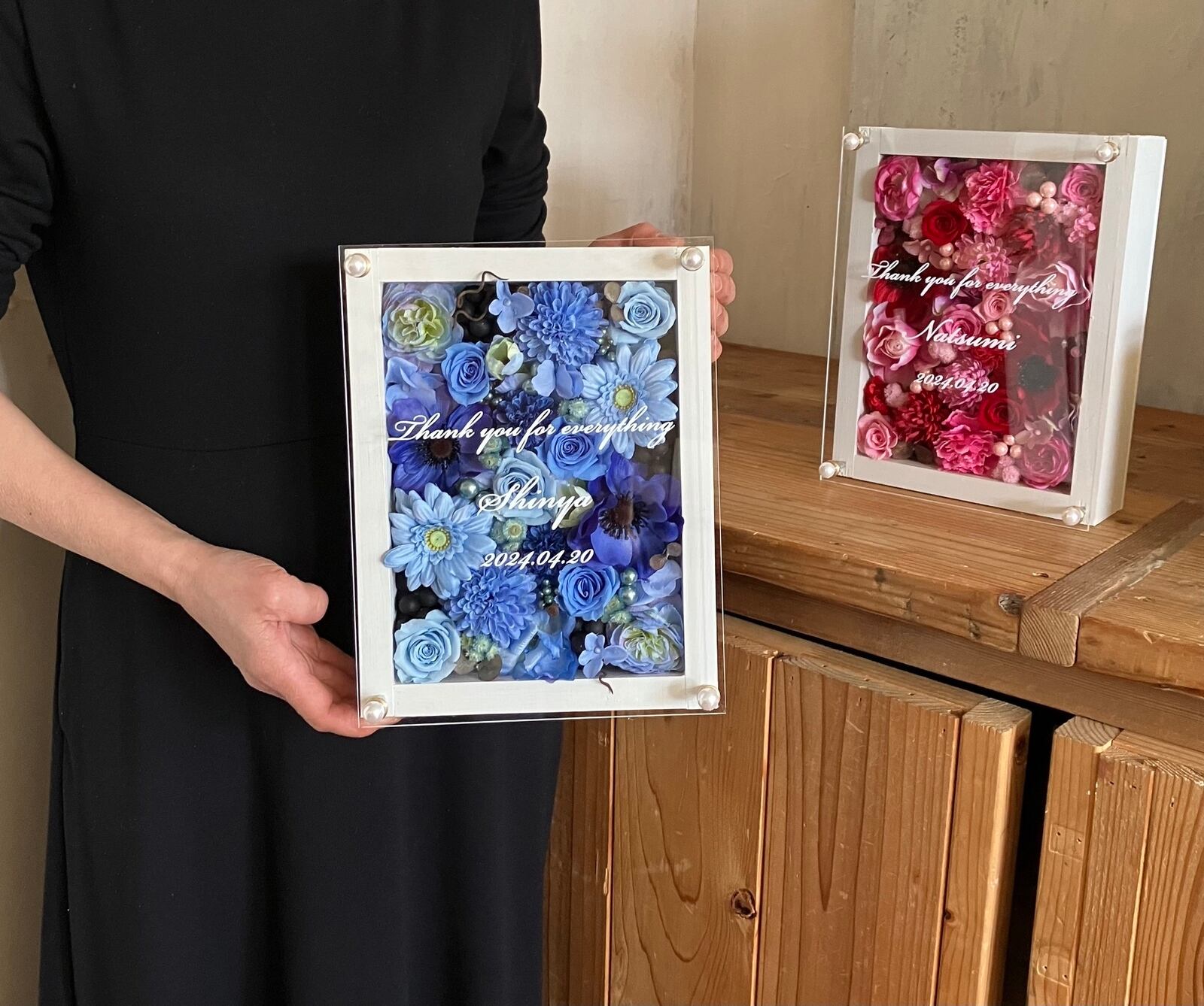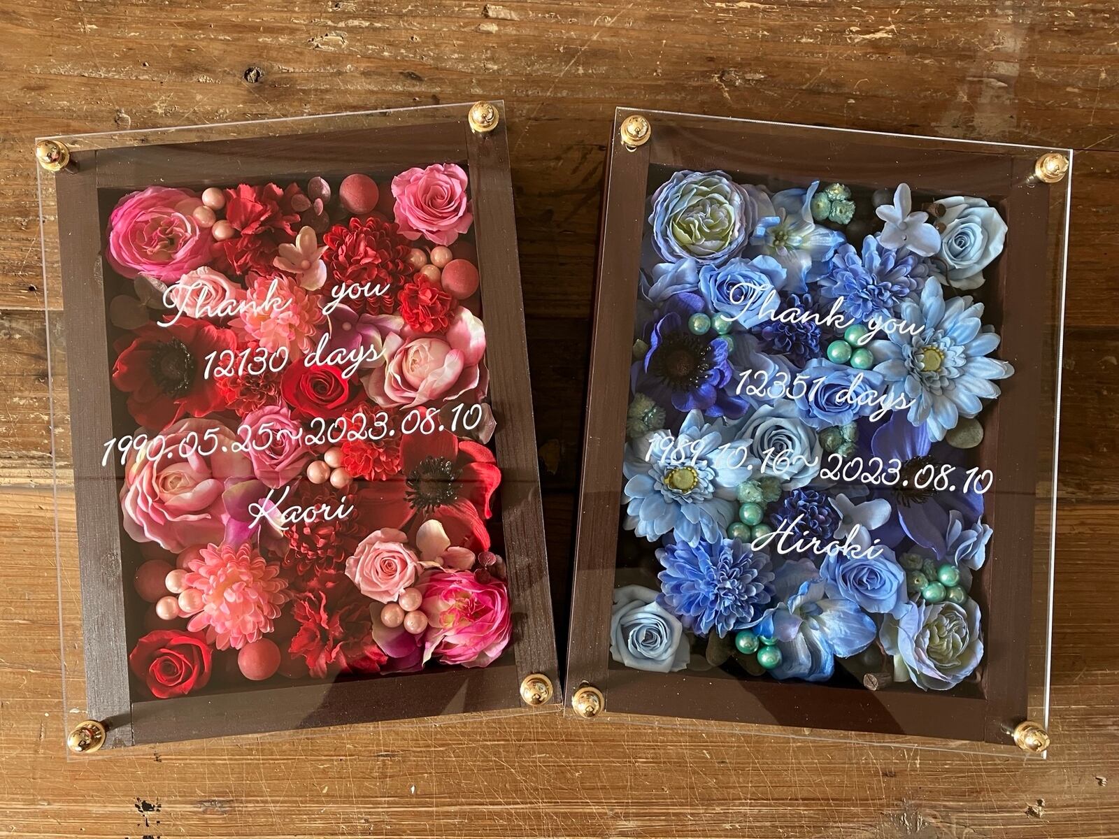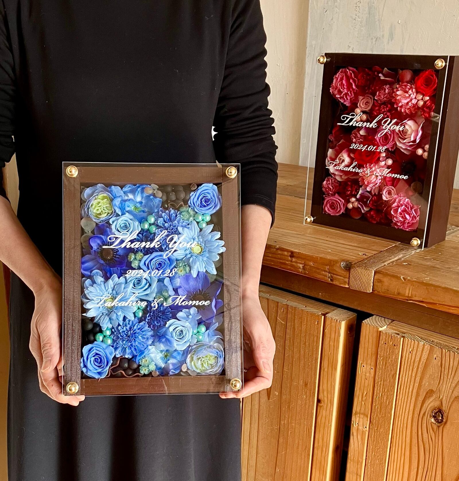 感謝のギフト|結婚式両親贈呈品 プリザーブドフラワーアレンジ ウッドフレーム〈ブルー&赤ピンク〉文字入れ 2個セット