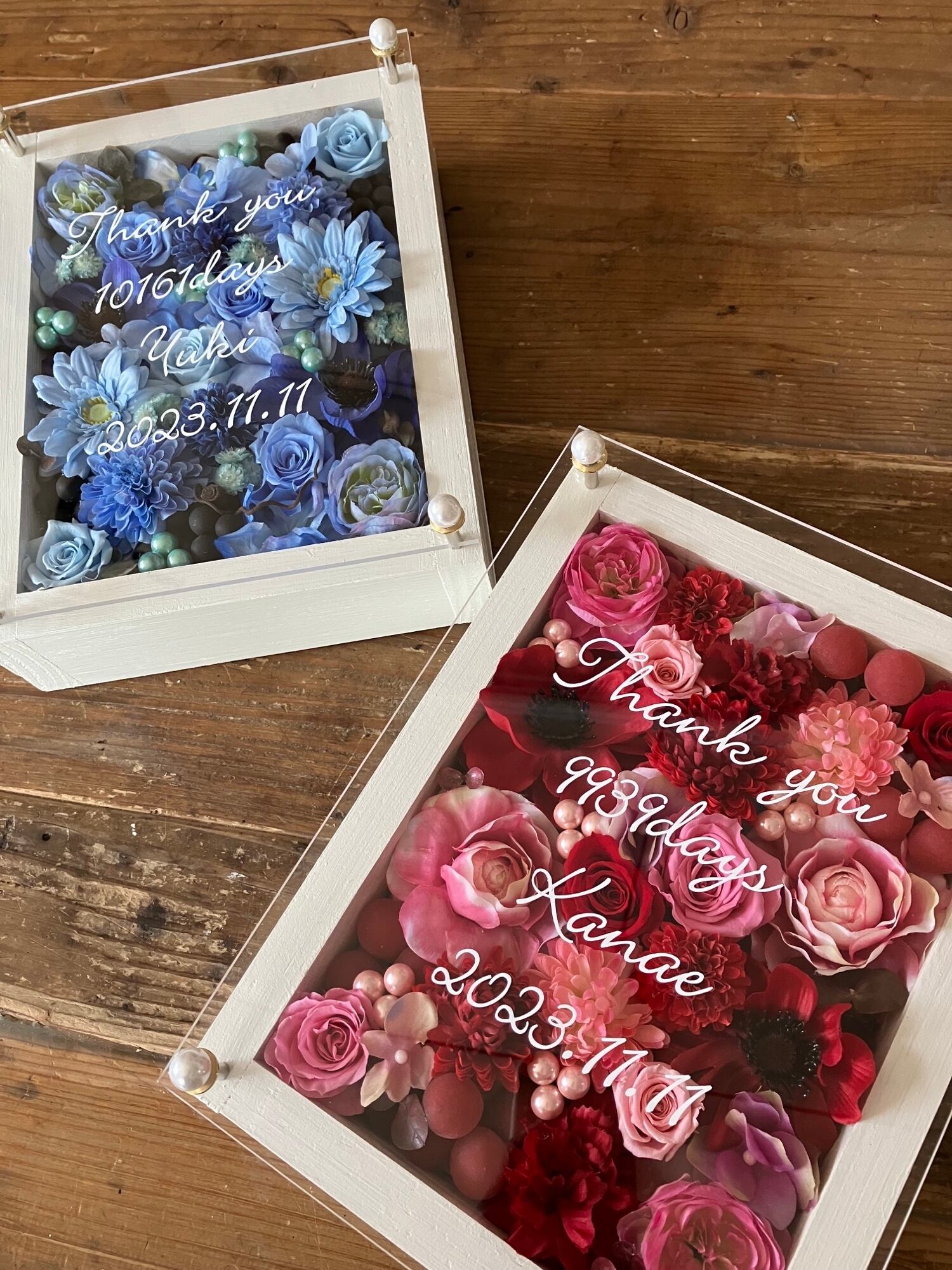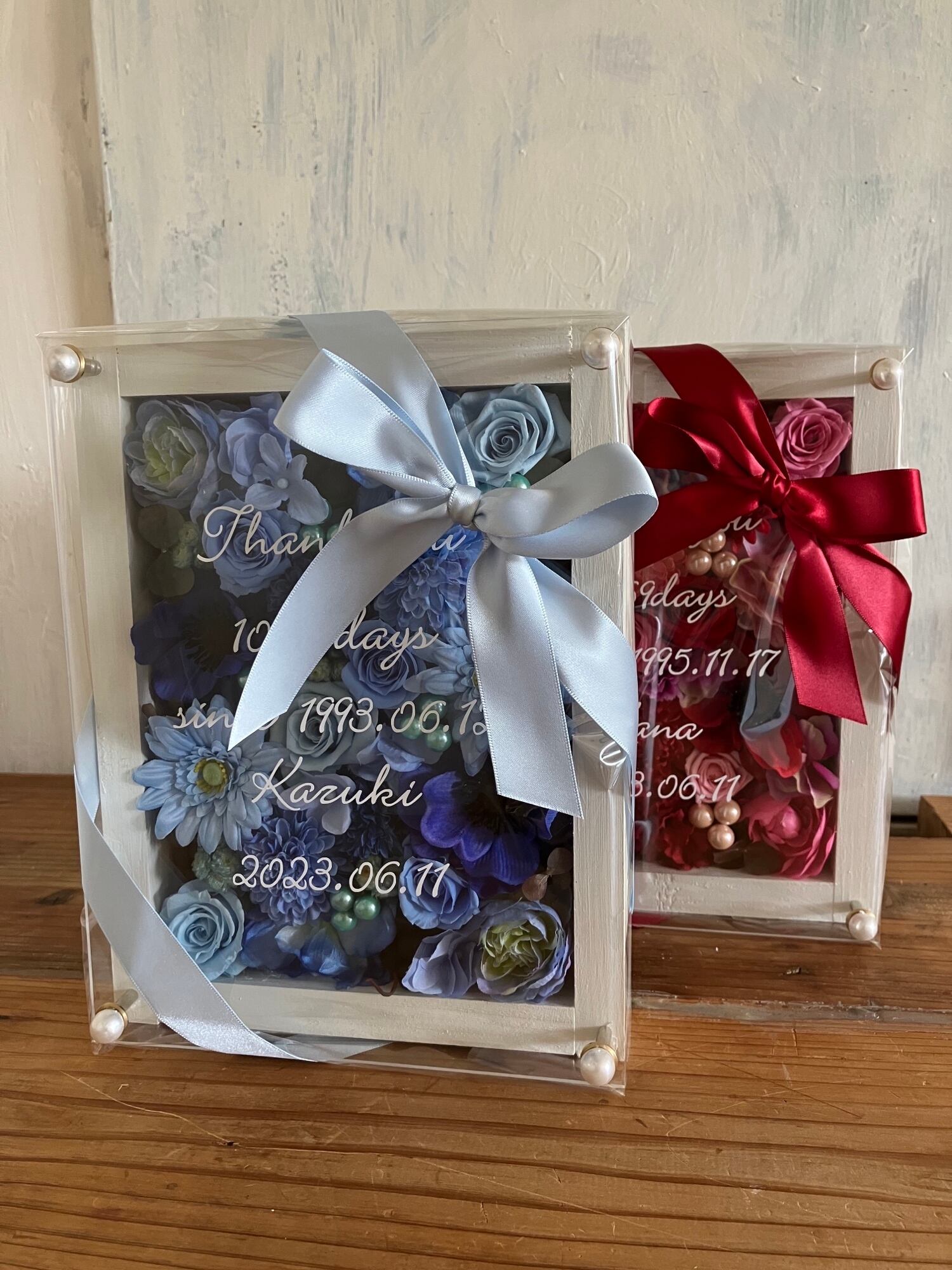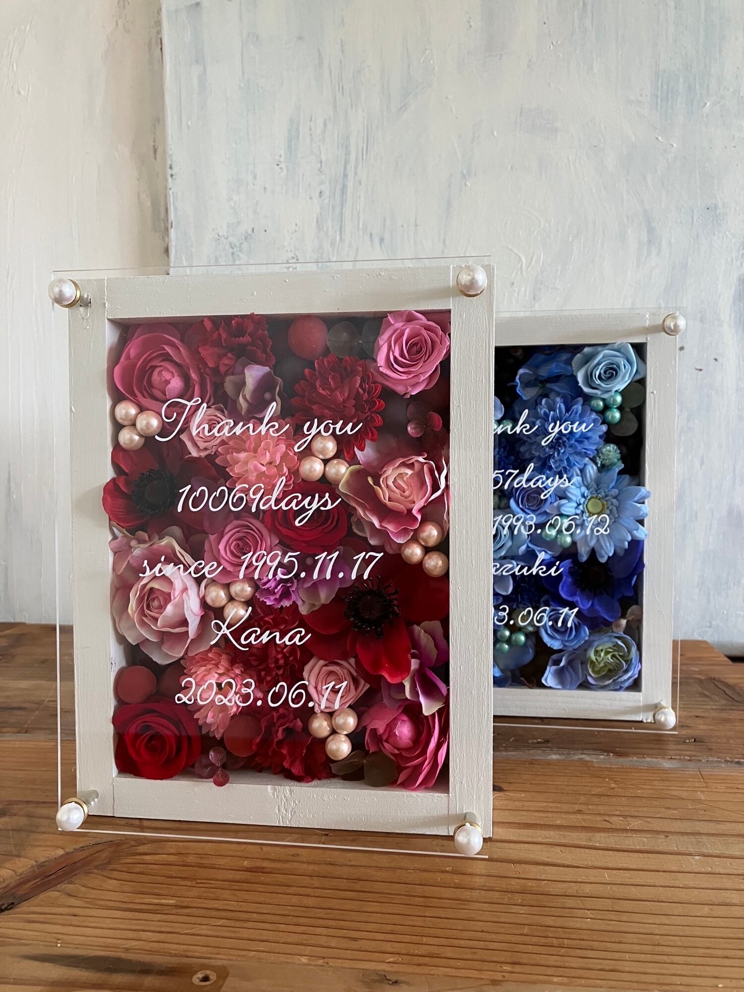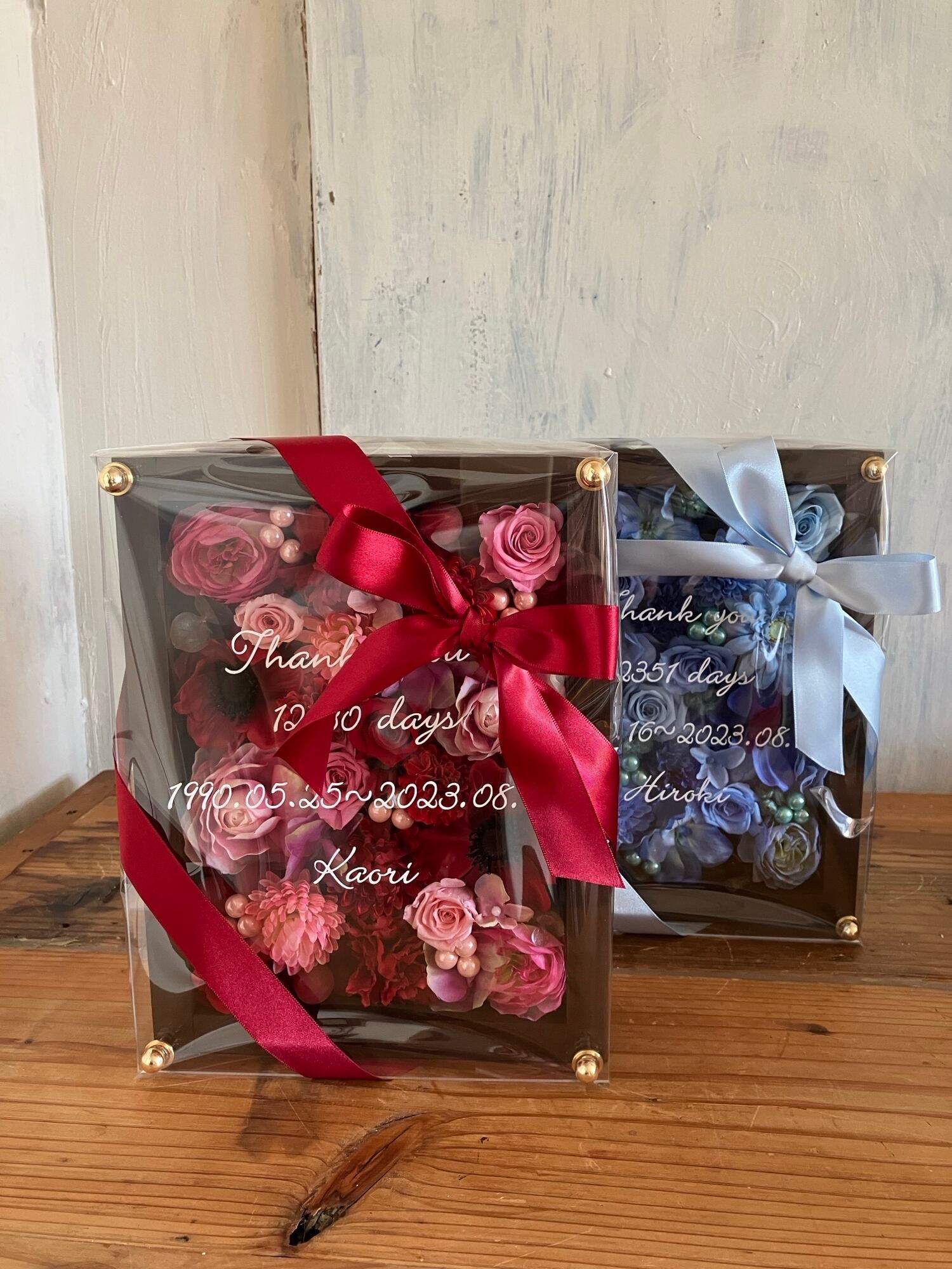 感謝のギフト|結婚式両親贈呈品 プリザーブドフラワーアレンジ ウッドフレーム〈ブルー&赤ピンク〉文字入れ 2個セット