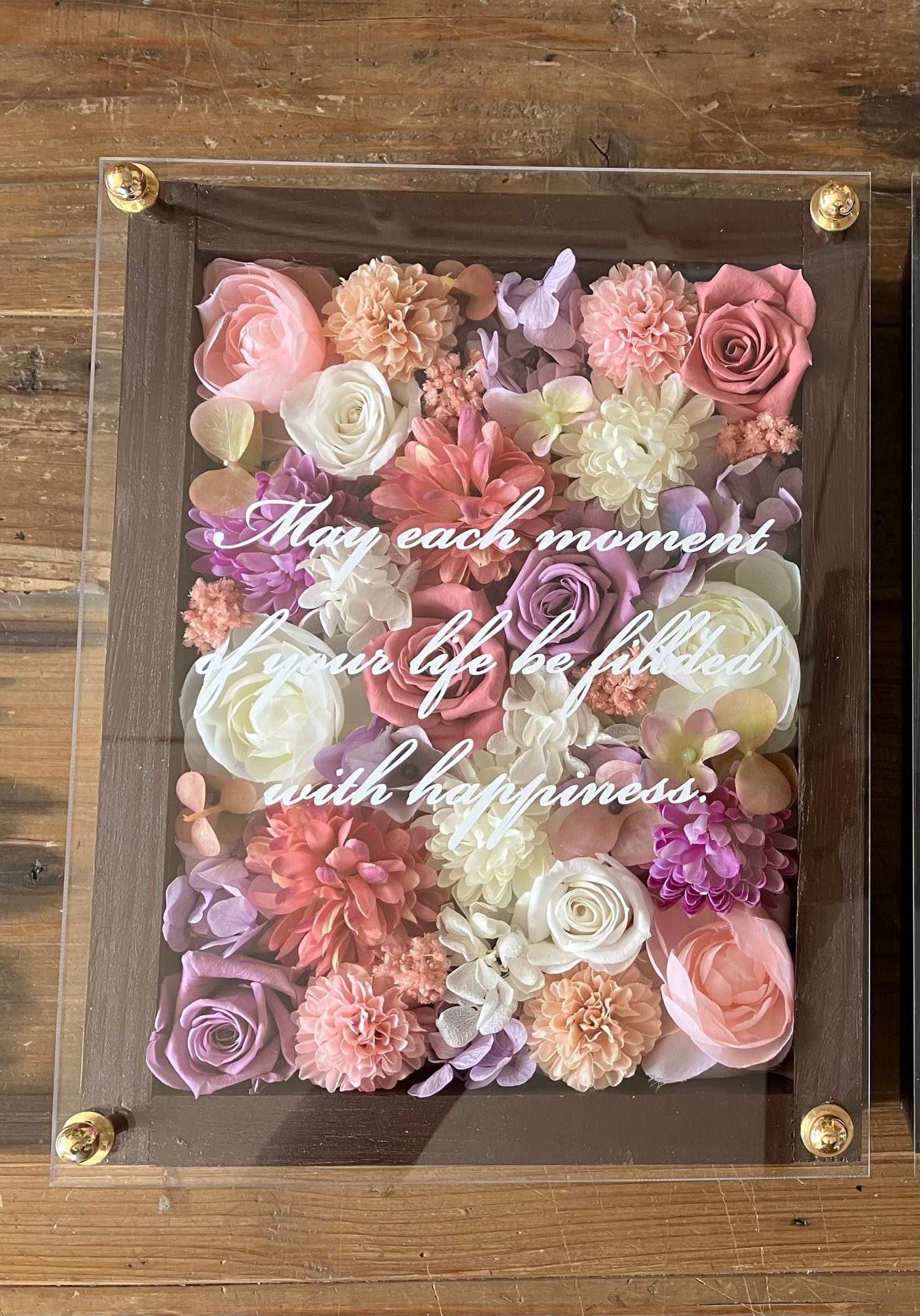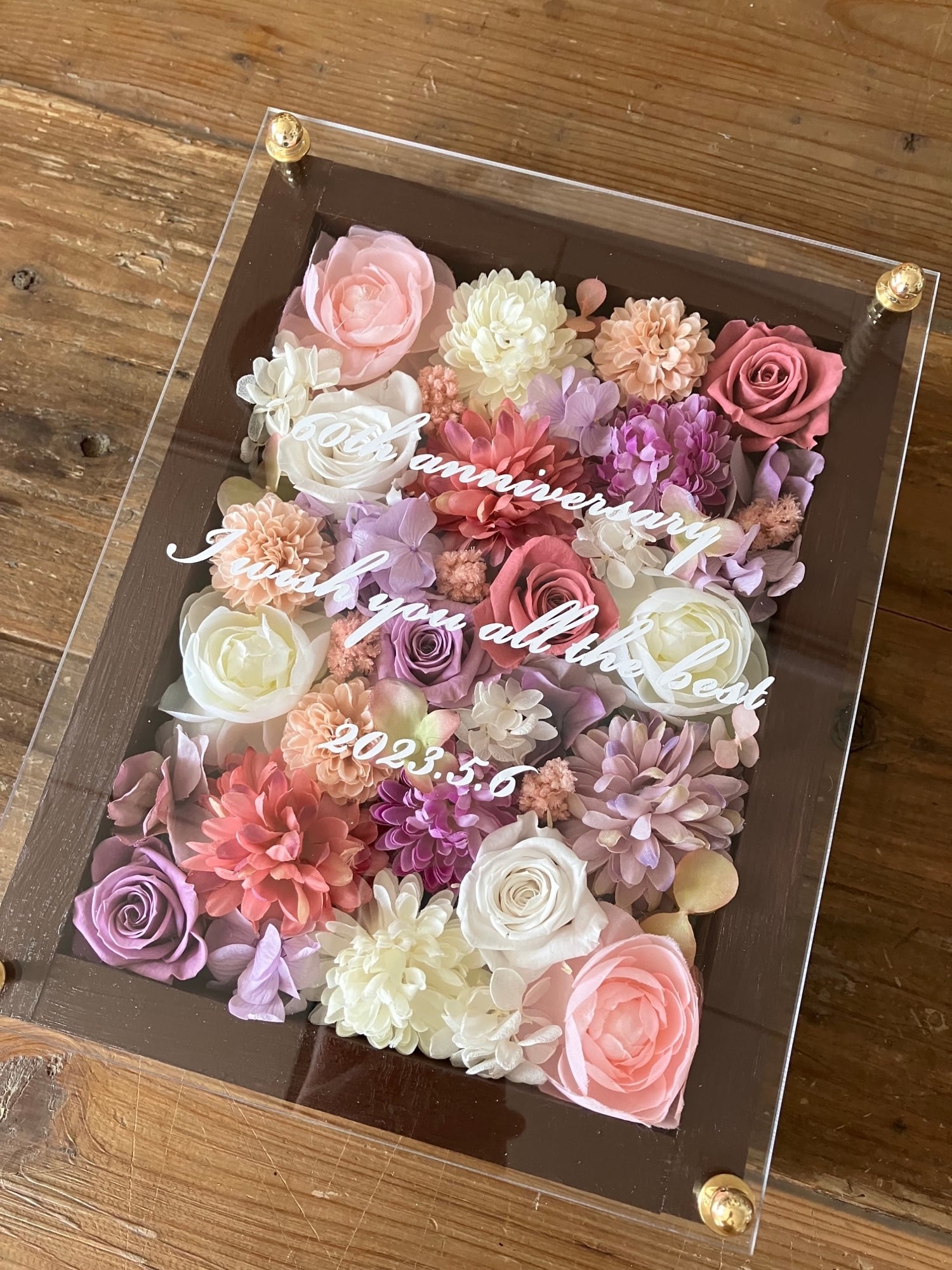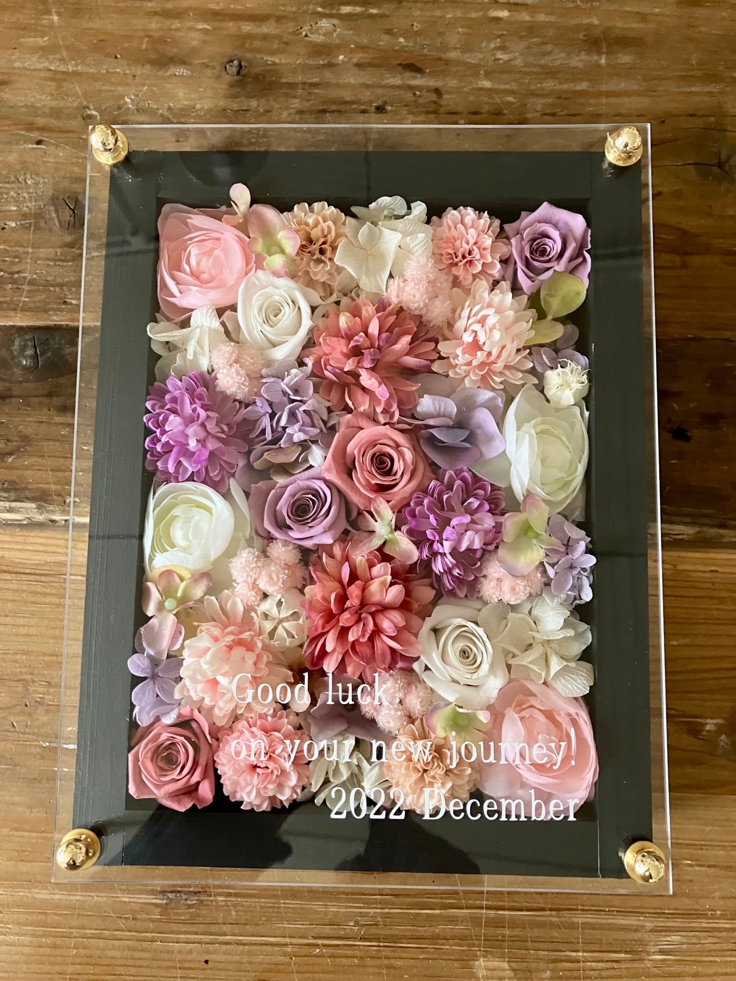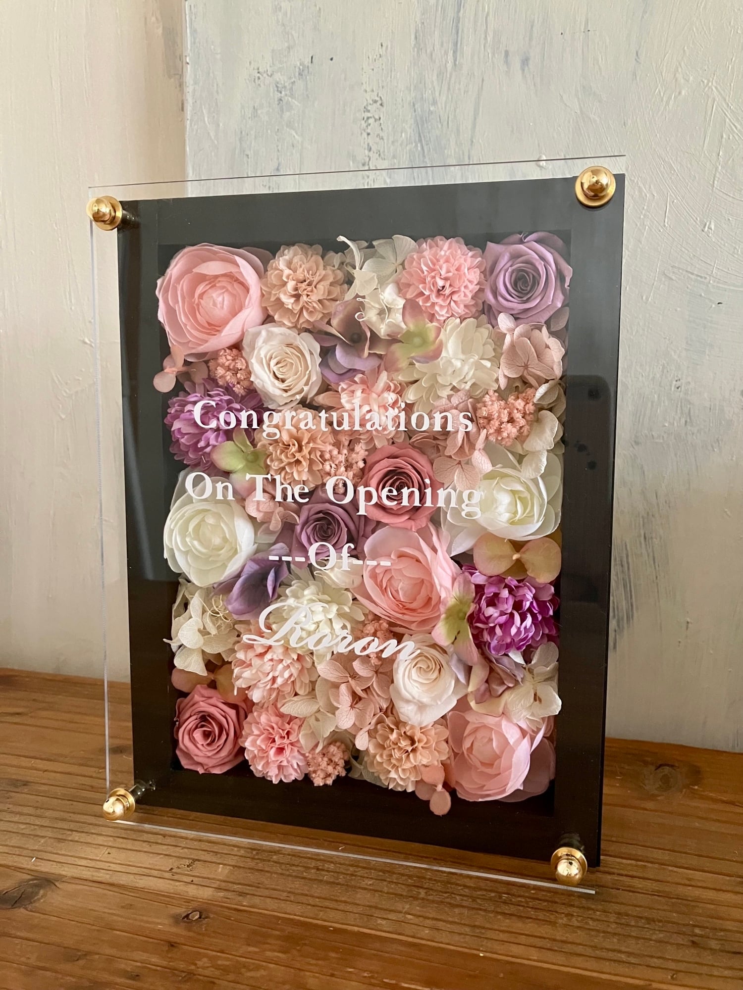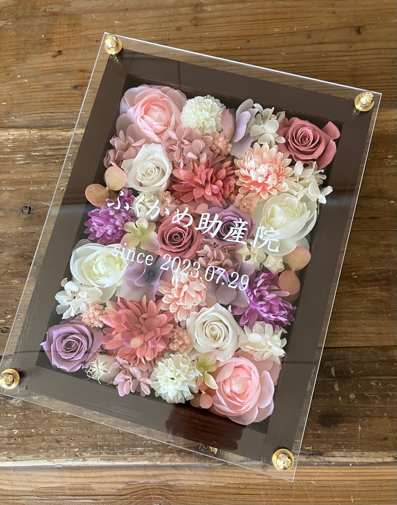 ウッドフレームにプリザーブドフラワーと造花をぎっしり詰め込み、アクリル板にはカッティングシートでメッセージをお入れします。