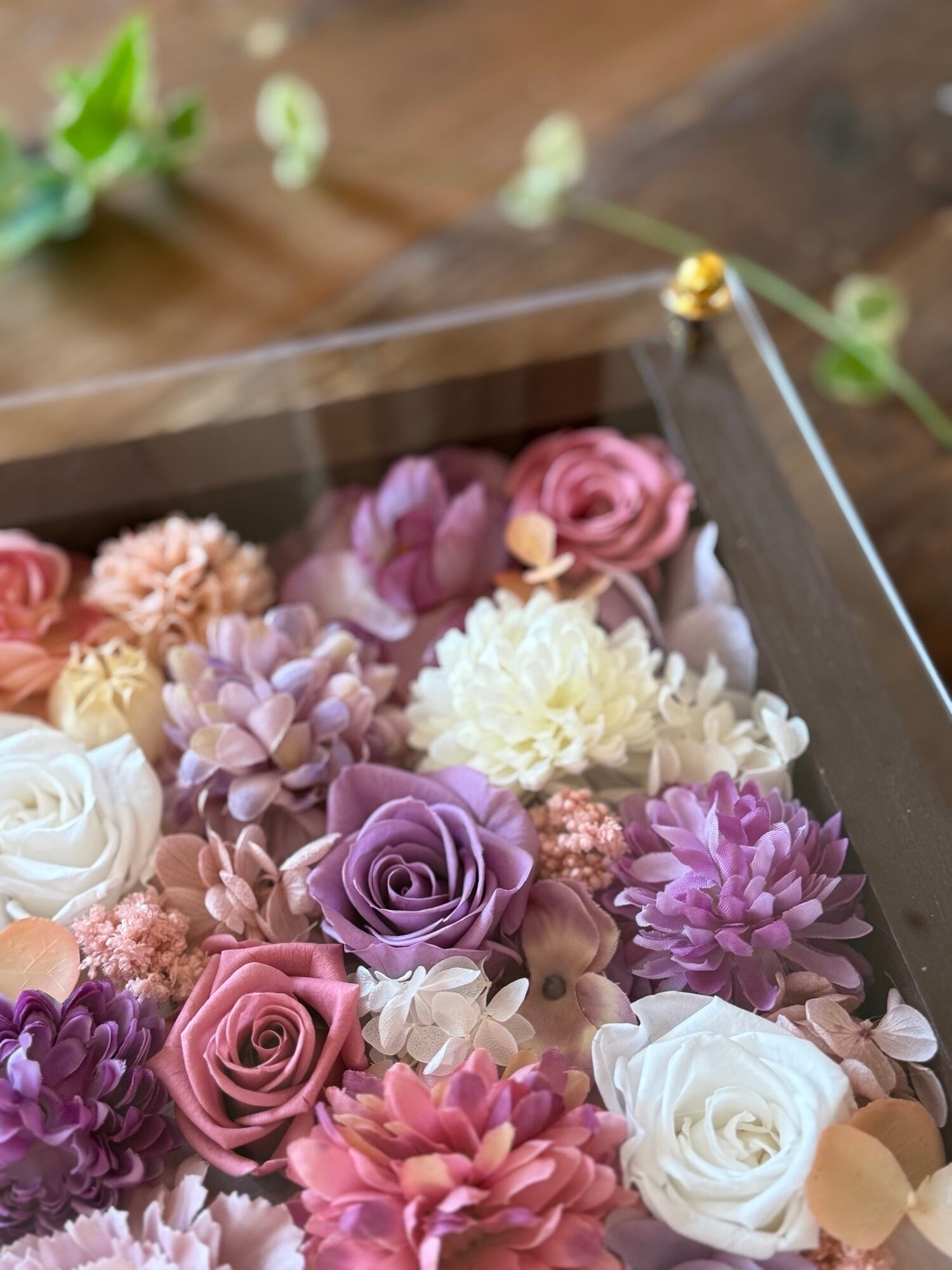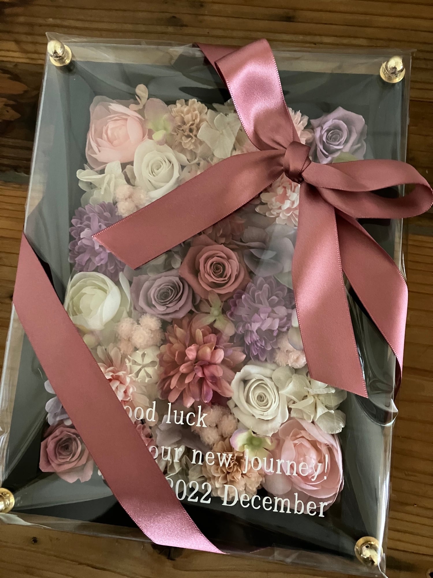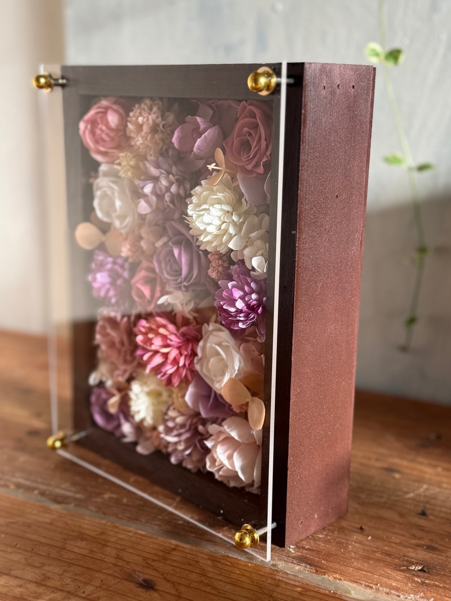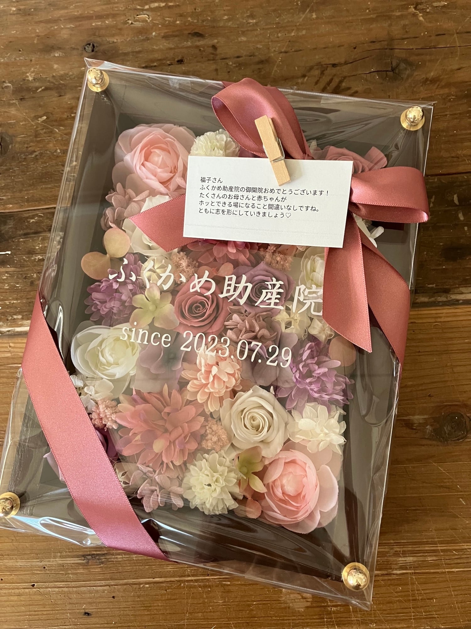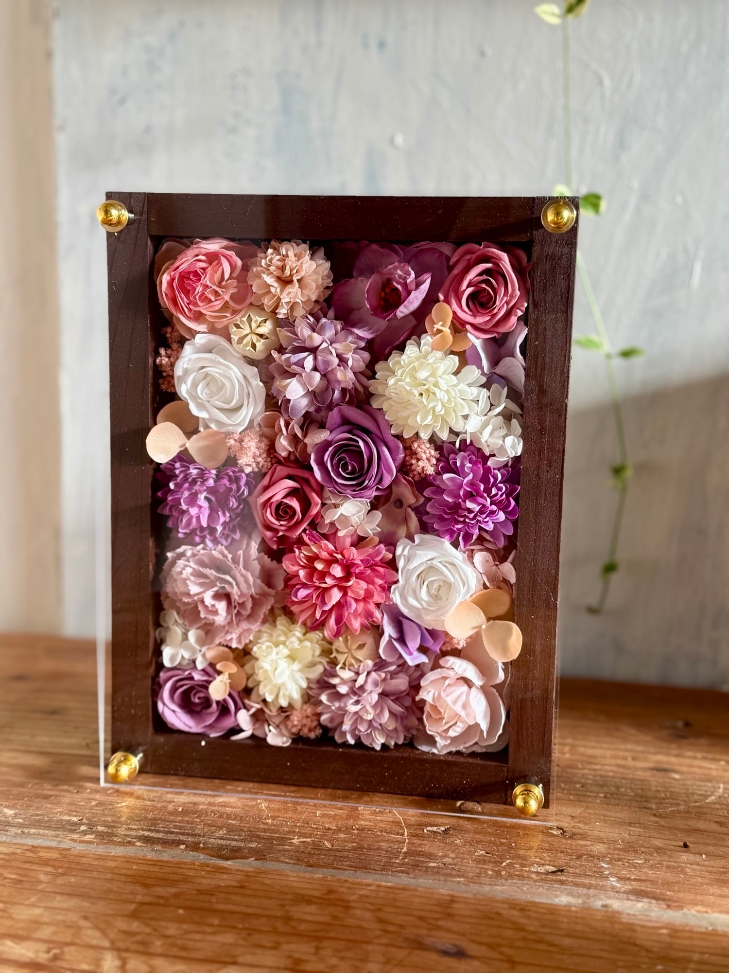 ウッドフレームにプリザーブドフラワーと造花をぎっしり詰め込み、アクリル板にはカッティングシートでメッセージをお入れします。