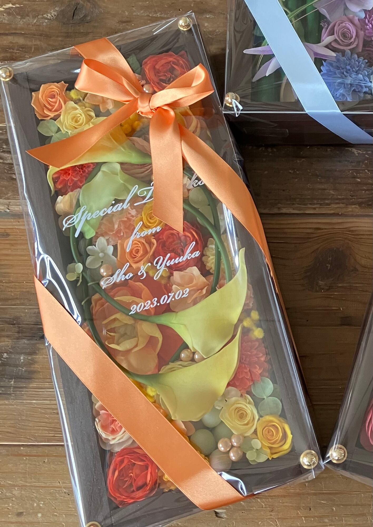 お花のギフト|プリザーブドフラワーアレンジ 茶木枠ロング〈イエローオレンジ〉名入れ可/開店祝い・開院祝い・結婚祝いに