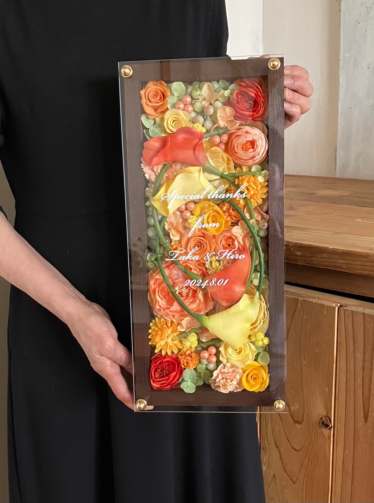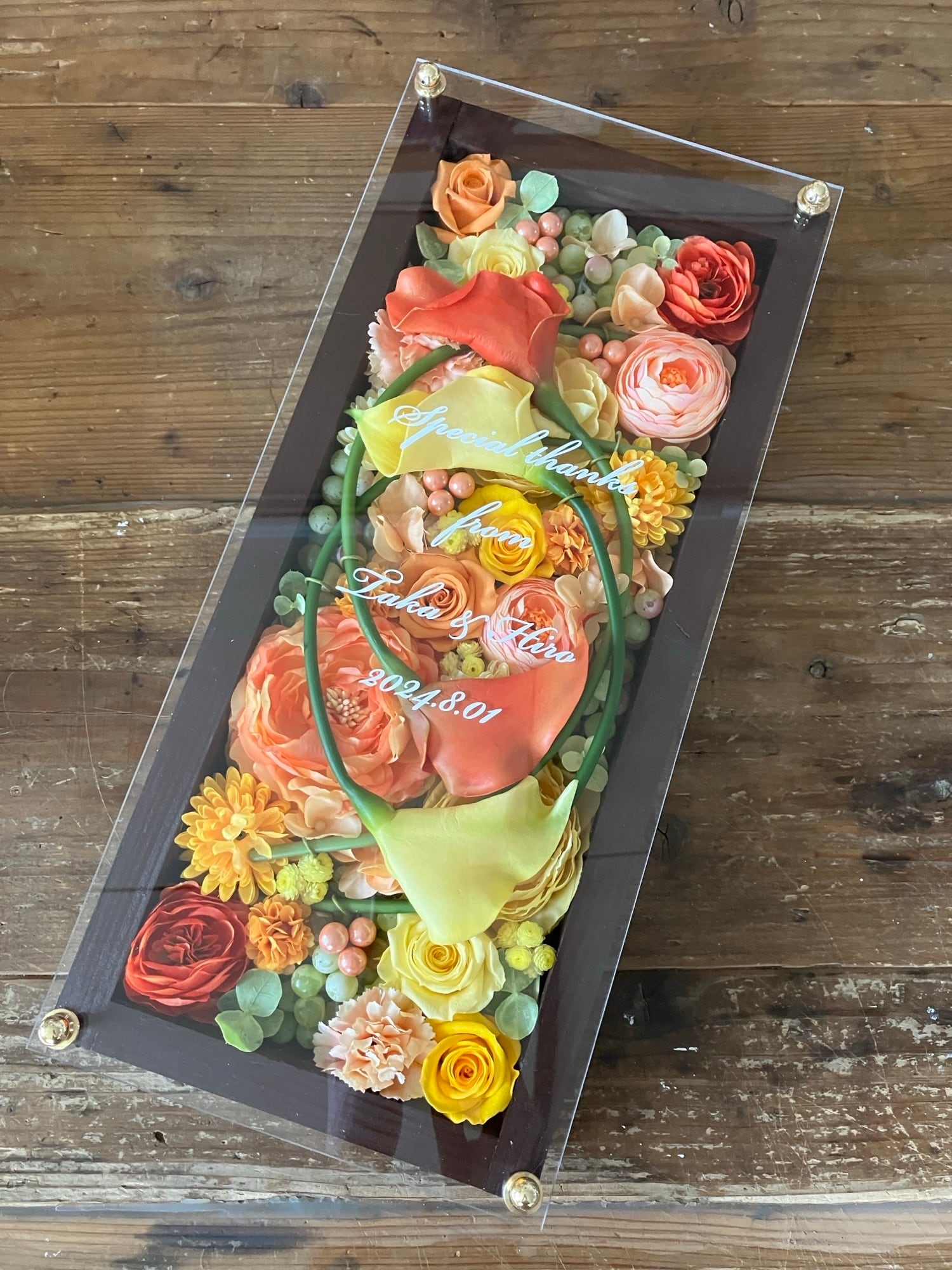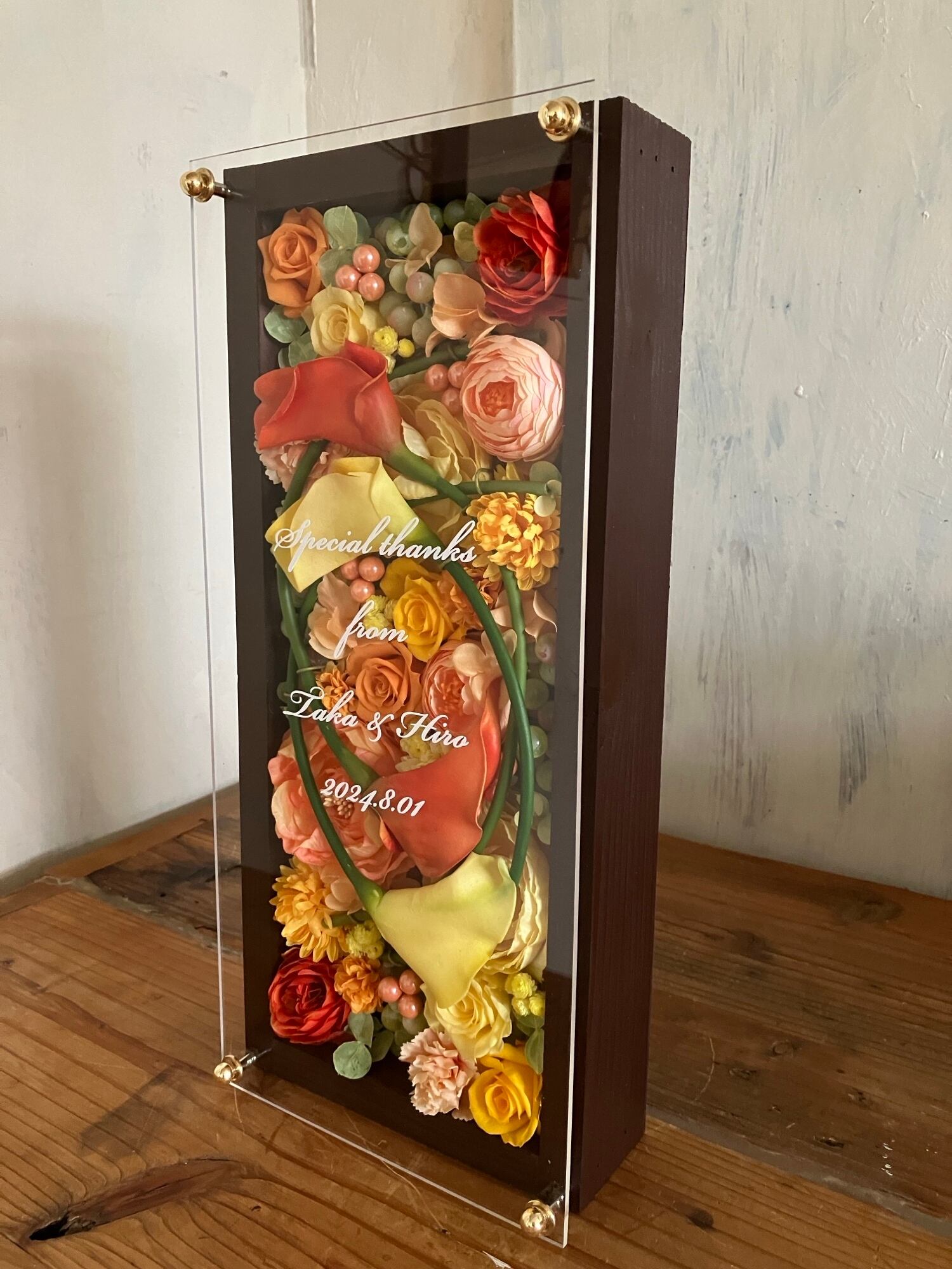 茶色のロングサイズのウッドフレームにプリザーブドフラワーと造花をぎっしり詰め込み、アクリル板にはカッティングシートでメッセージをお入れします。