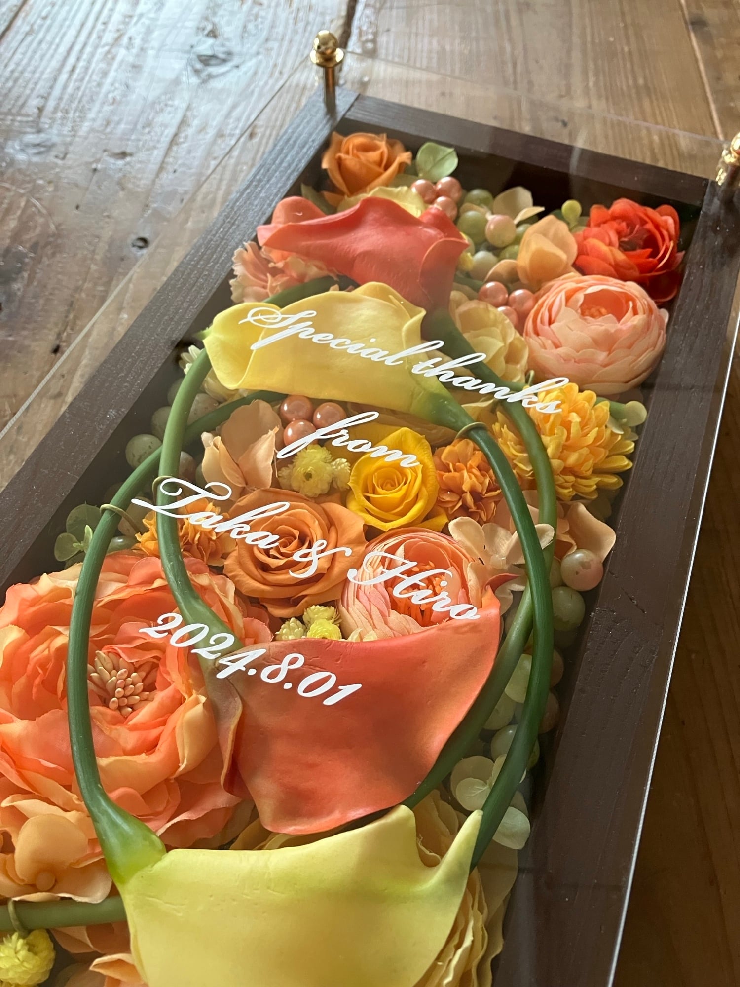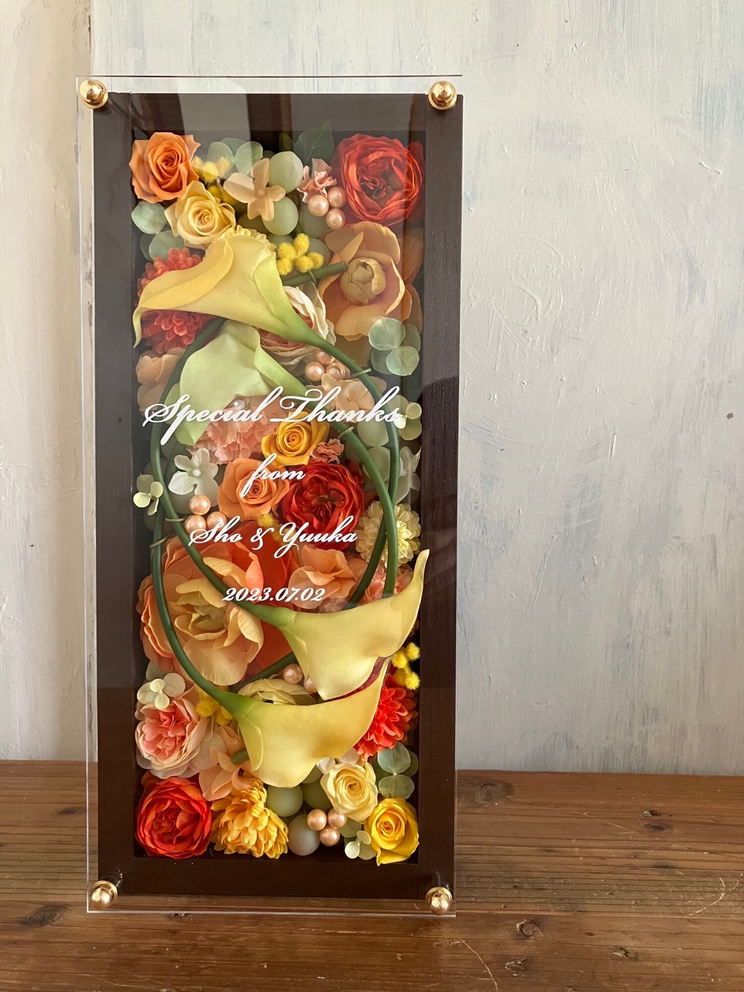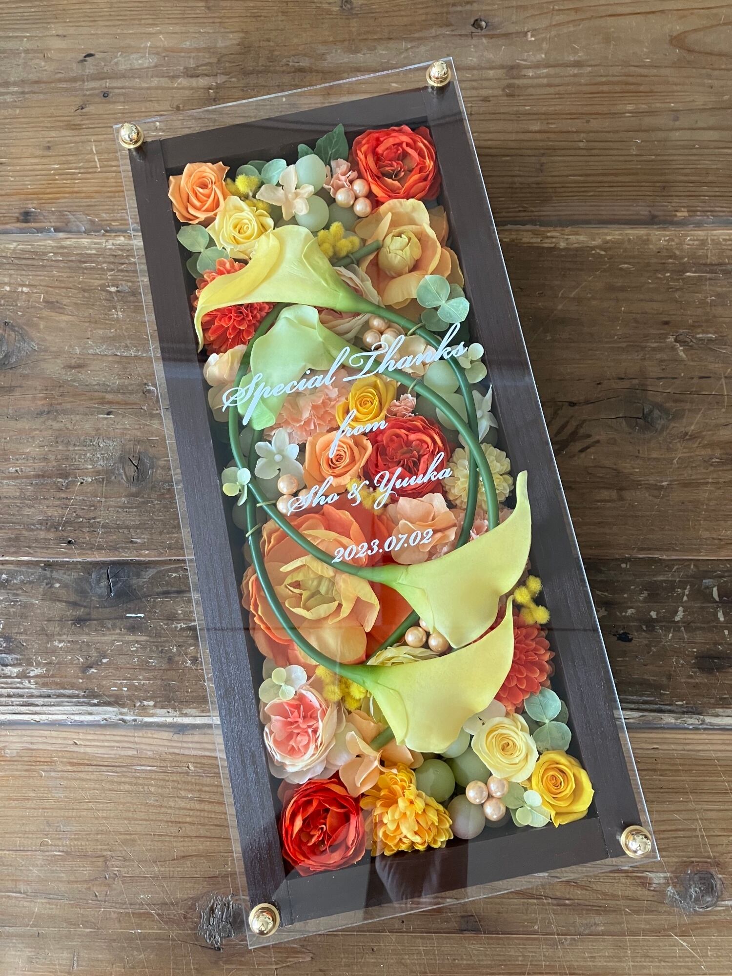茶色のロングサイズのウッドフレームにプリザーブドフラワーと造花をぎっしり詰め込み、アクリル板にはカッティングシートでメッセージをお入れします。