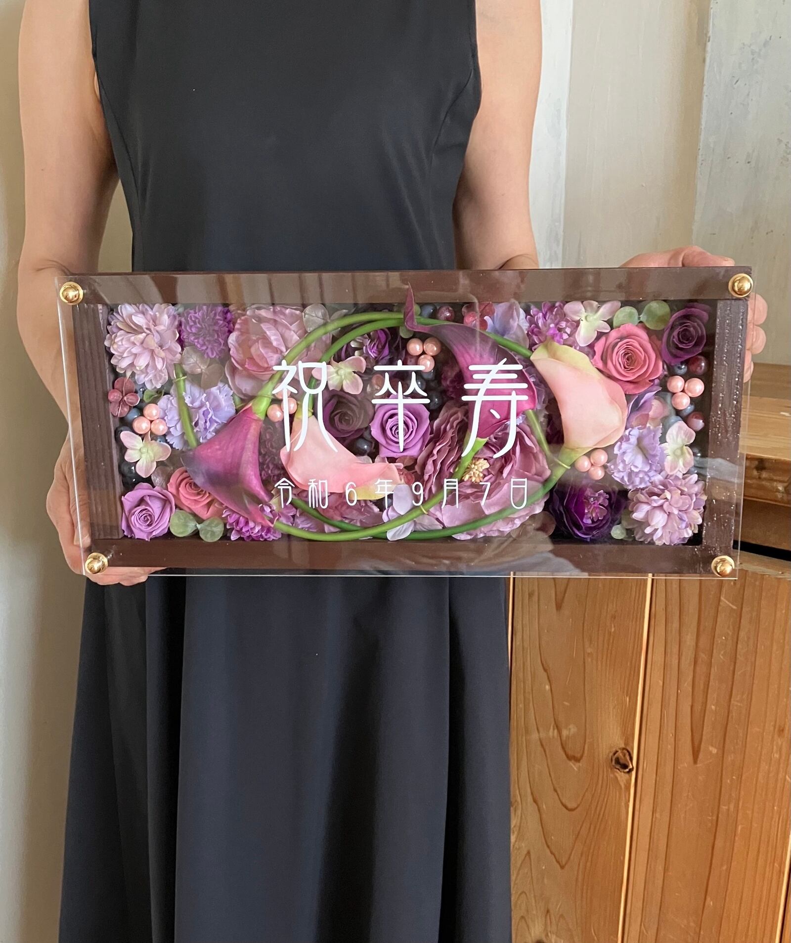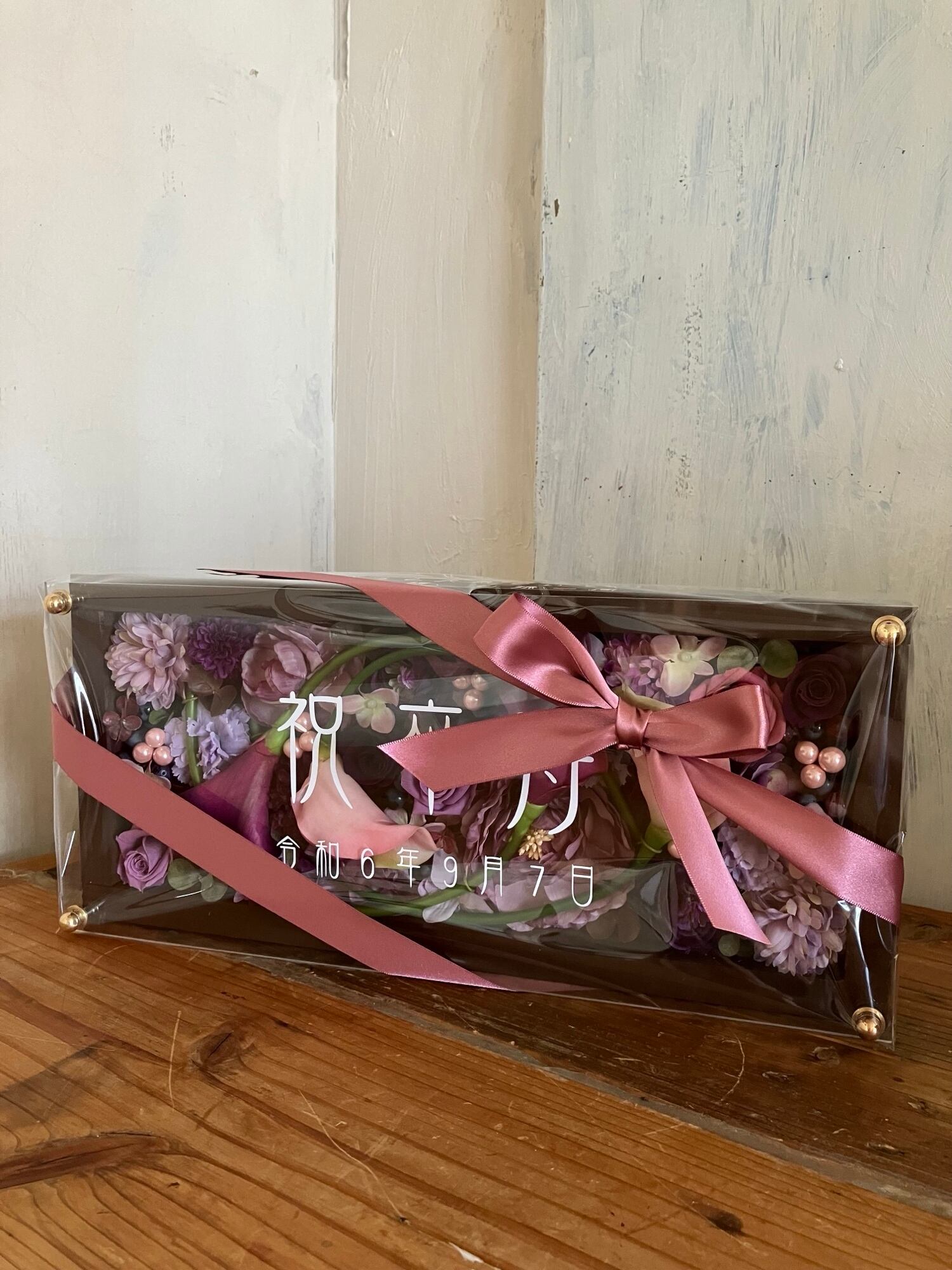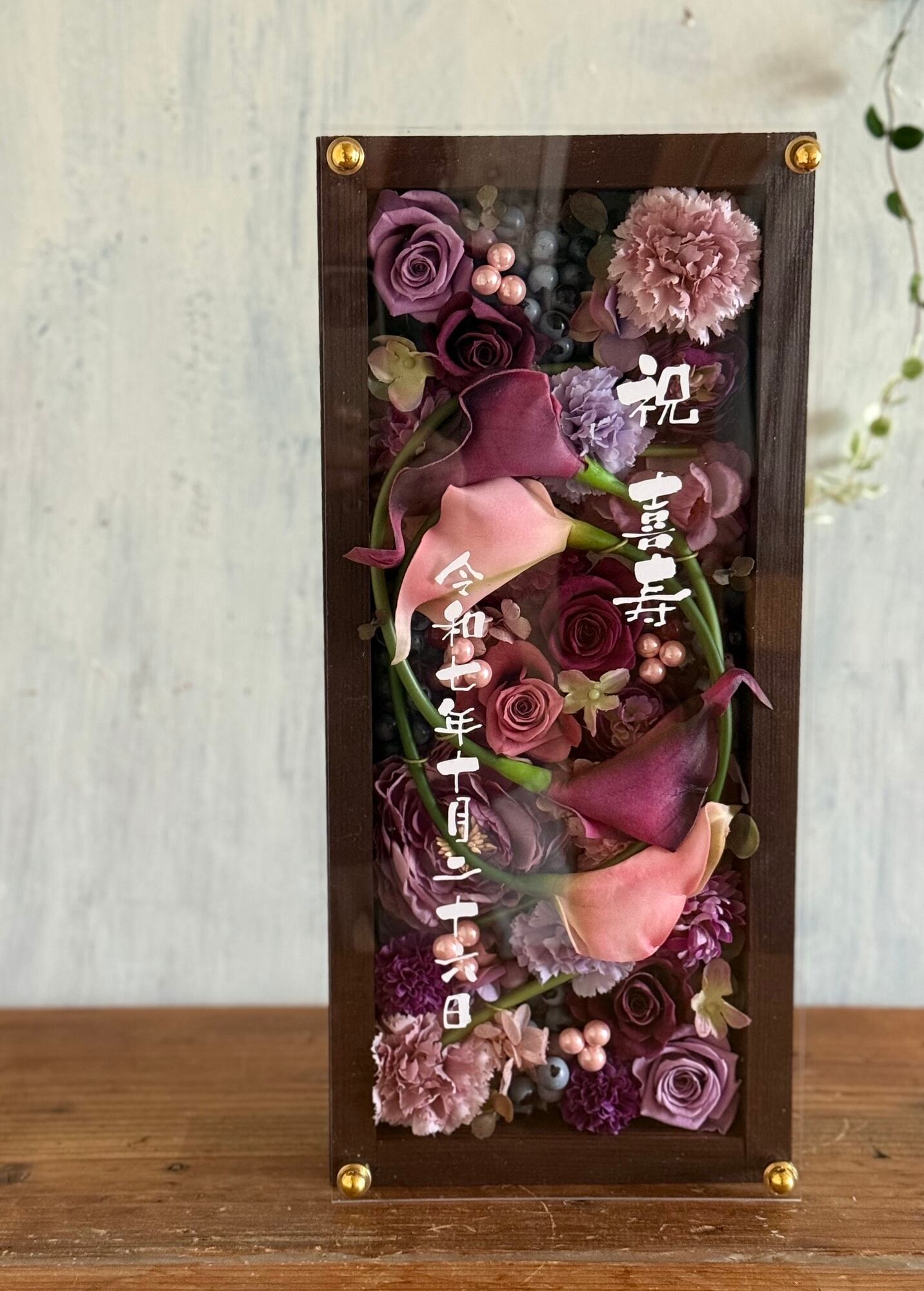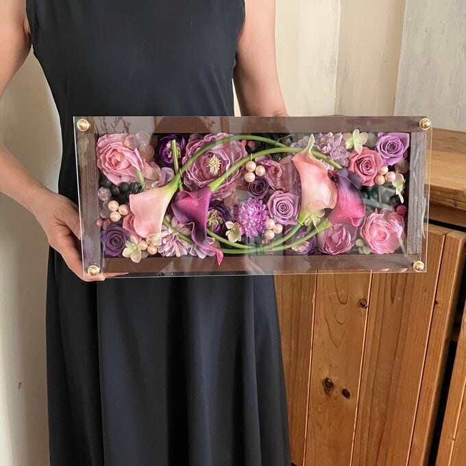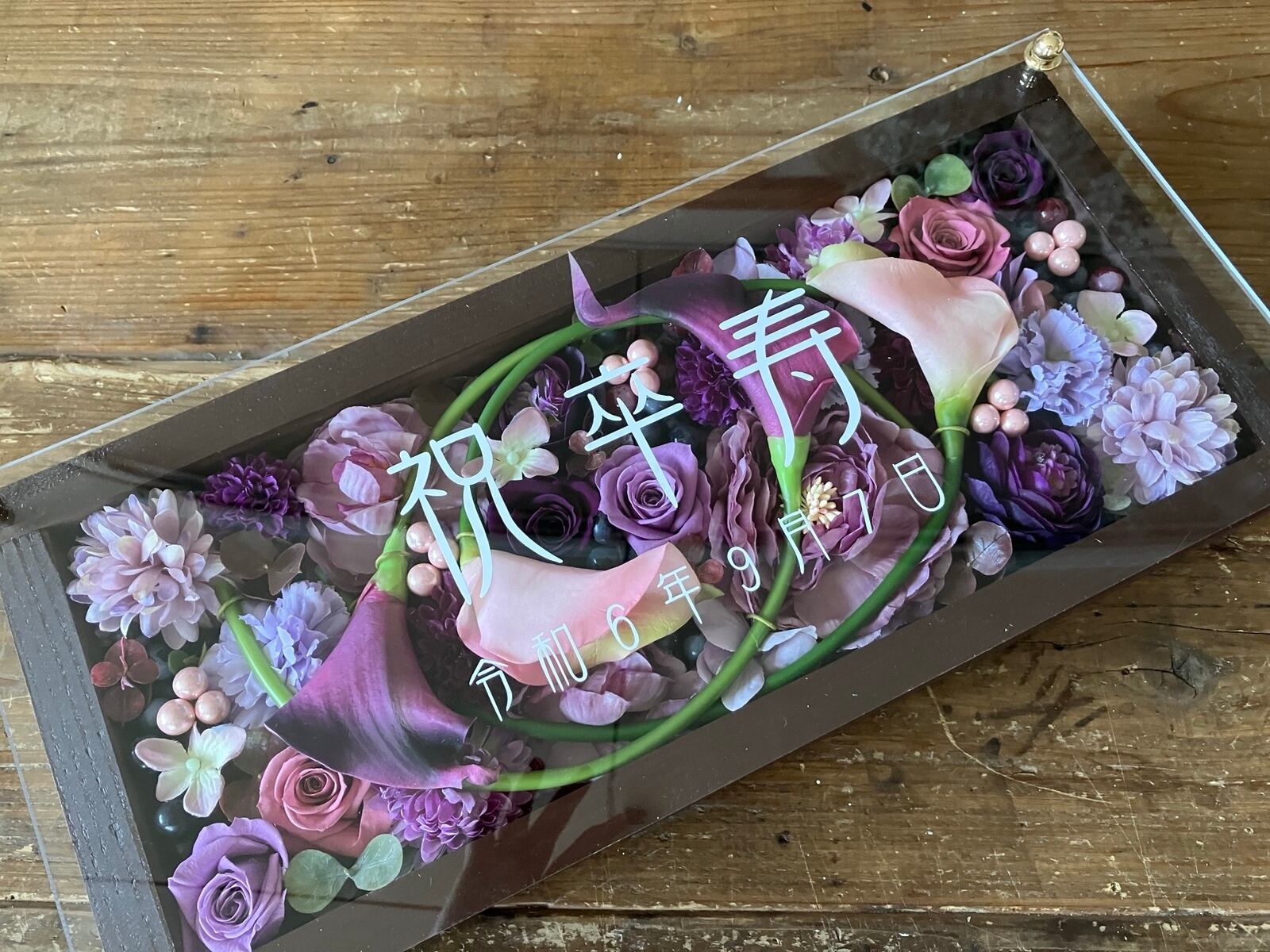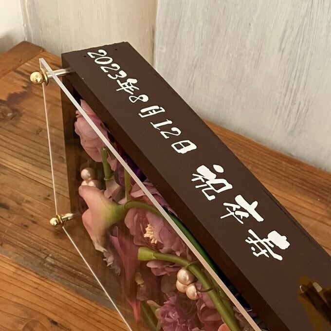 茶色のロングサイズのウッドフレームにプリザーブドフラワーと造花をぎっしり詰め込み、アクリル板にはカッティングシートでメッセージをお入れします。